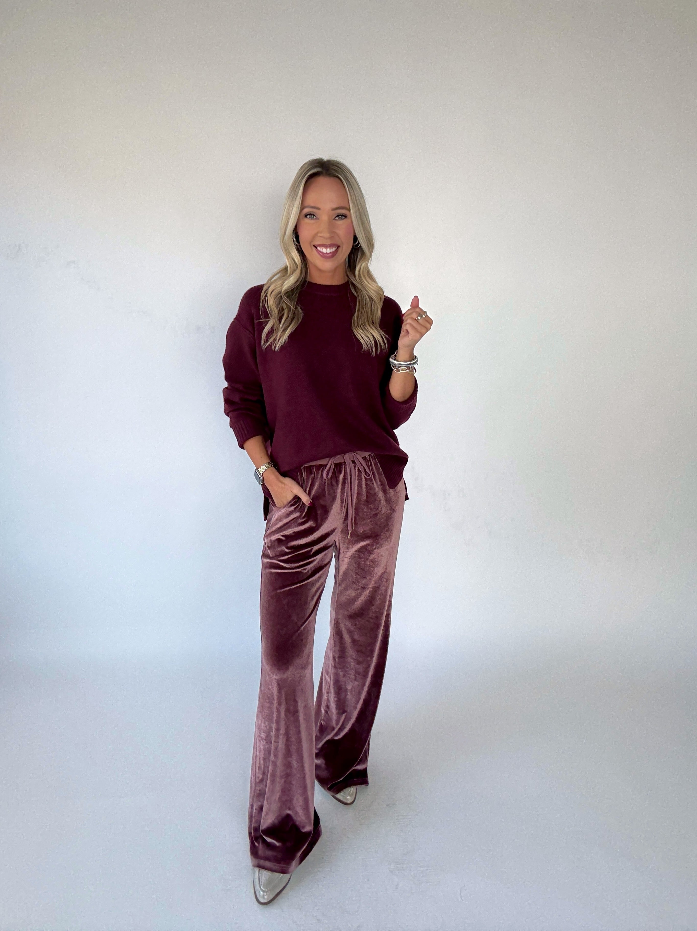 In a stunning cabernet hue, this sweater brings depth and warmth to your fall and winter wardrobe. Style it with the Velour Indulgence Pants for a chic lounge-ready look, or pair it with denim or trousers for polished everyday style. Versatile, cozy, and timeless, it’s a sweater you’ll find yourself reaching for on repeat—season after season.