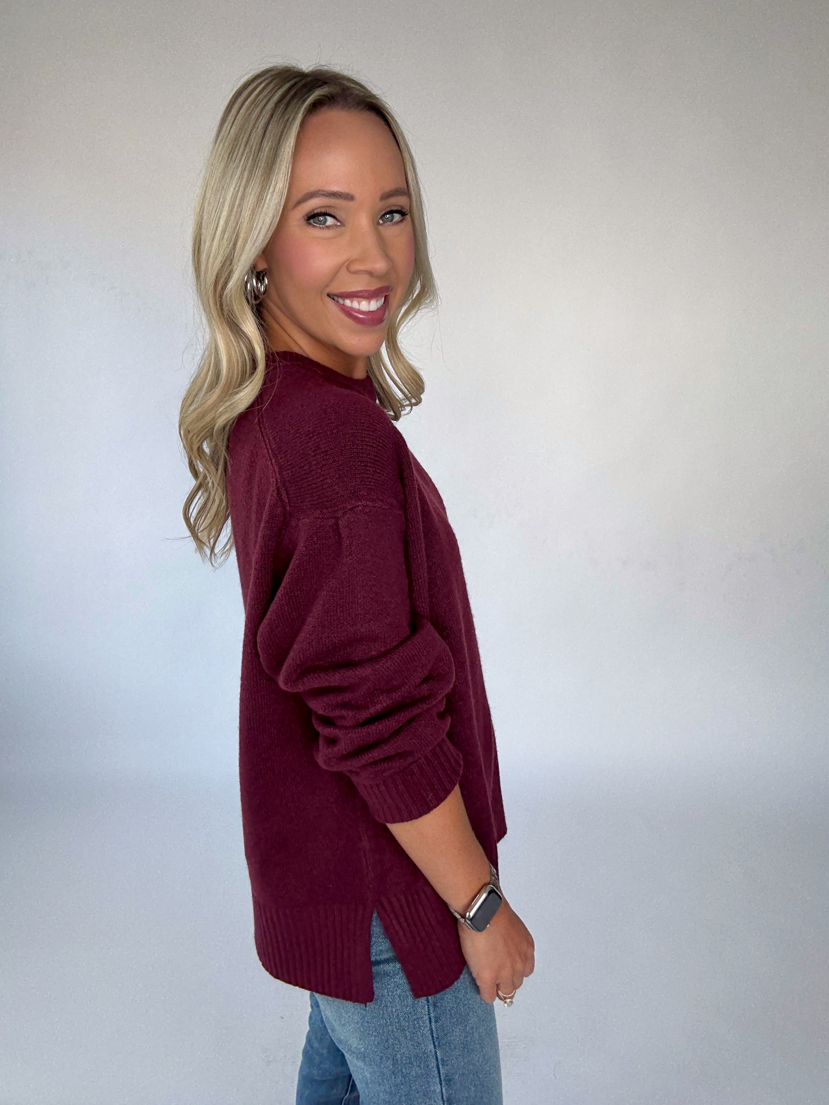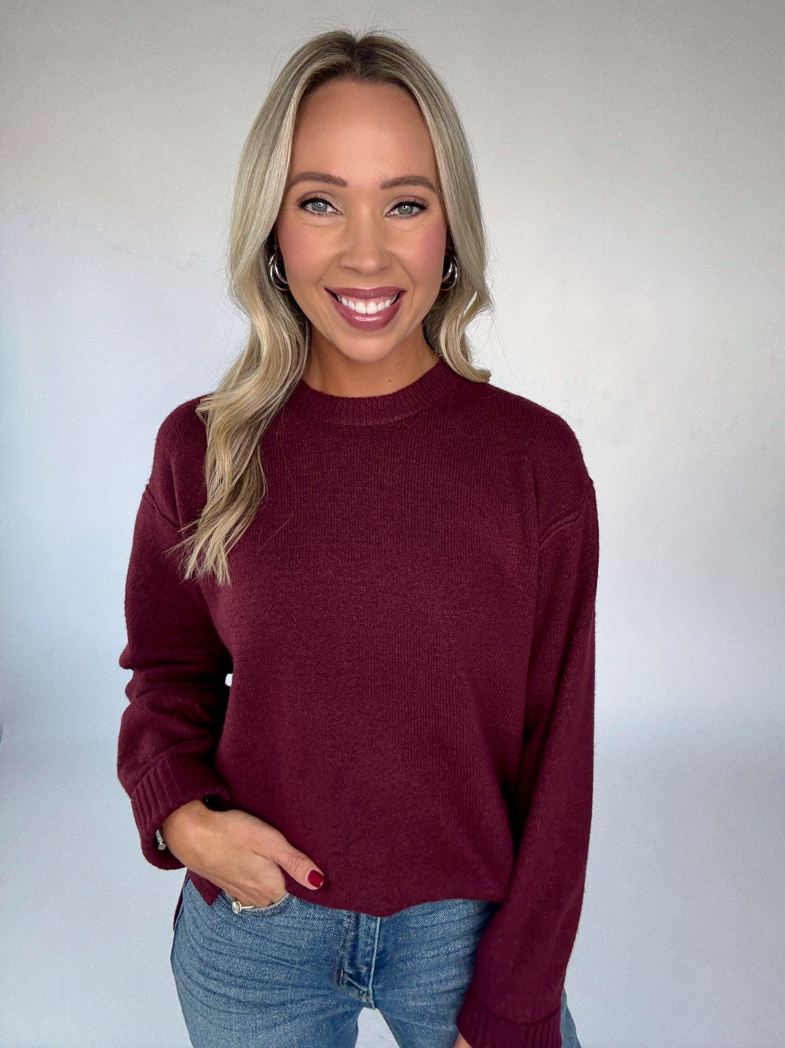 Wrap yourself in rich comfort with the Cabernet Cozy Sweater. This long sleeve, crew neck pullover is crafted from an ultra-soft knit that feels as luxurious as it looks. Thoughtful details like thicker ribbing at the wrists and waist and subtle side slits at the hem give it a refined, elevated touch while maintaining effortless wearability.