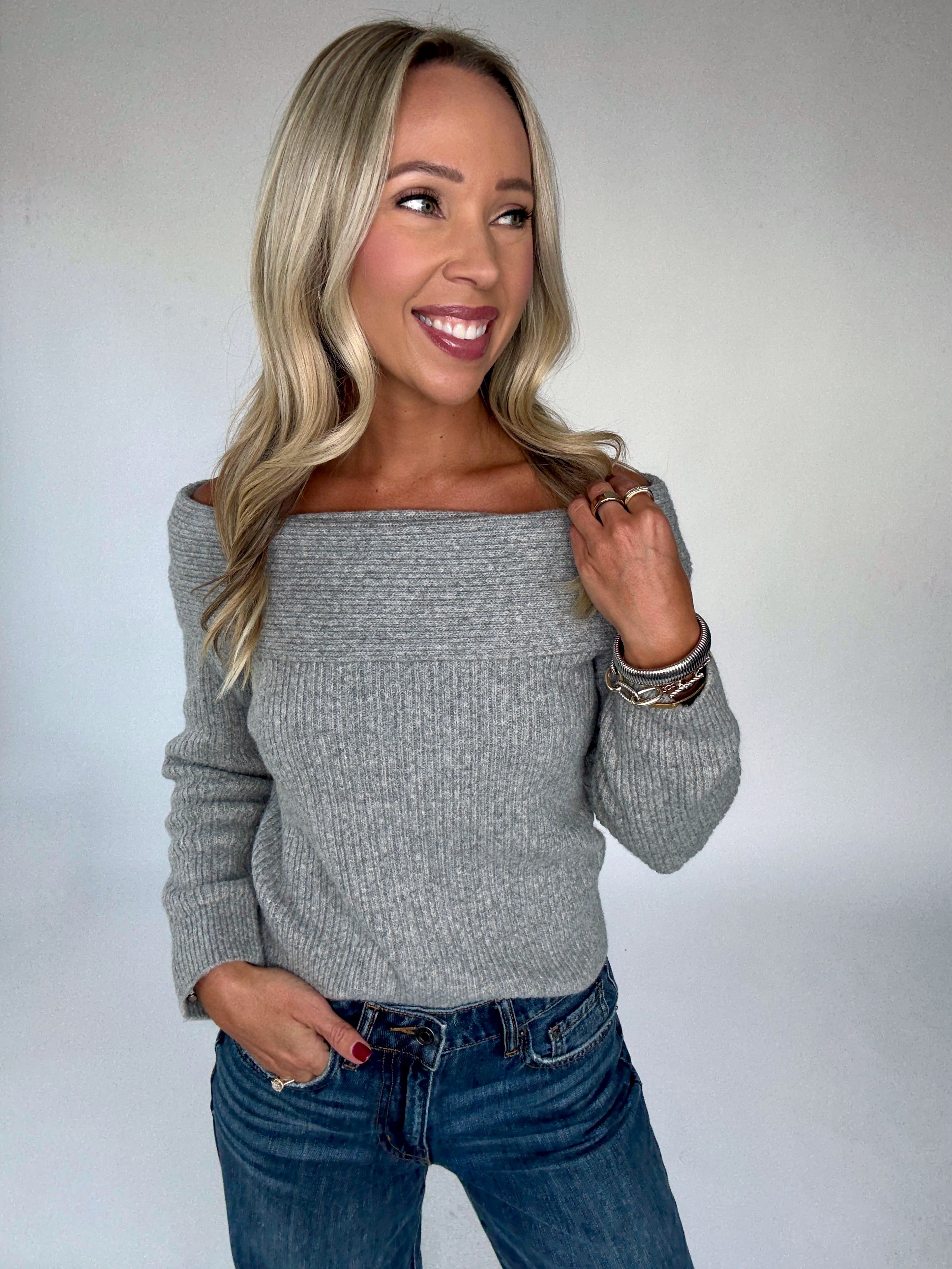 Timeless elegance meets modern ease in the Silver Bardot Sweater. Designed with a graceful off-the-shoulder neckline, this long-sleeve pullover exudes understated sophistication while offering the cozy comfort you’ll want to wear on repeat. Crafted from an ultra-soft fabric in a refined flint grey hue, it features subtle stripe detailing within the knit for added texture and depth.