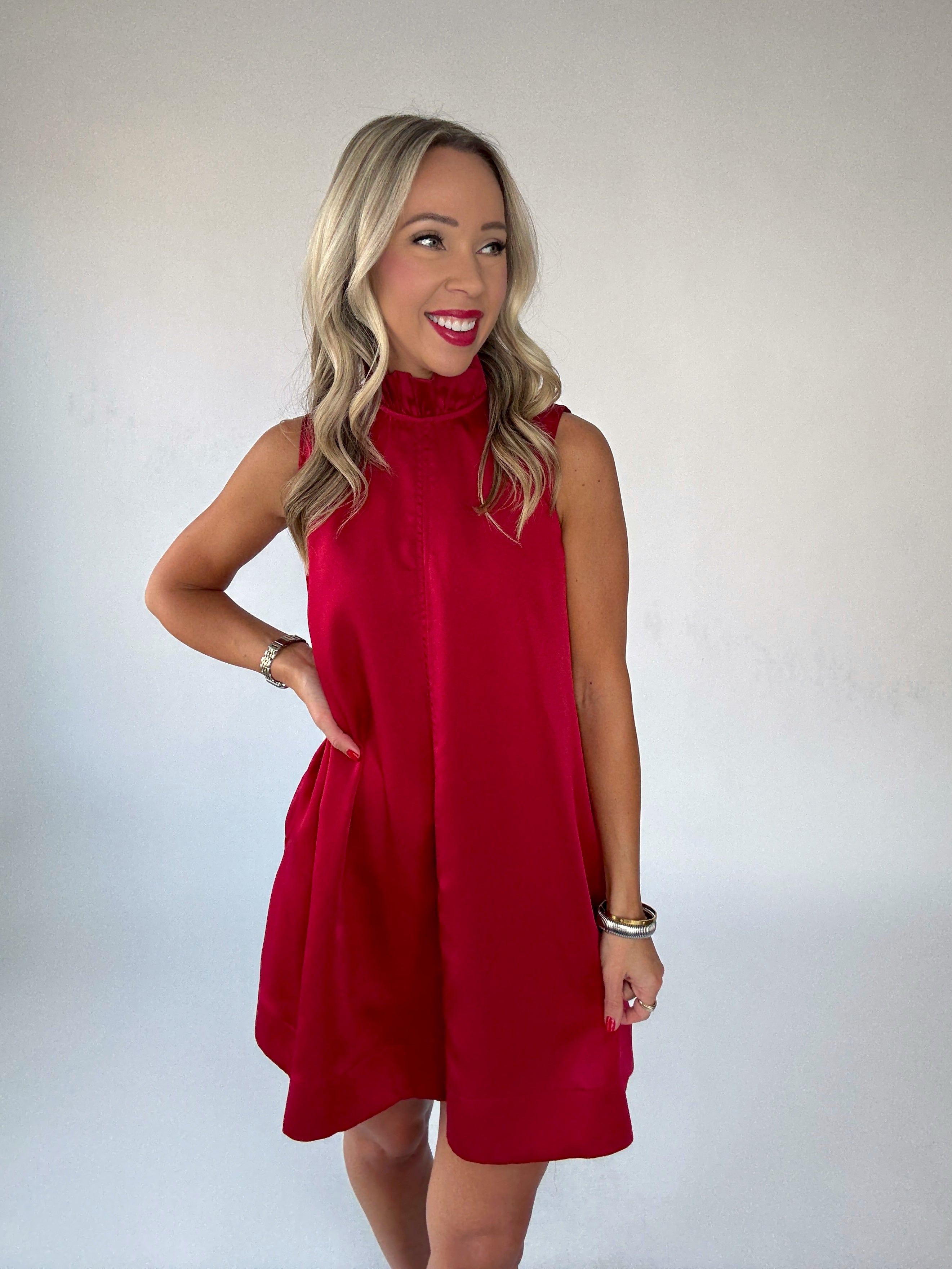 Effortlessly elegant and undeniably timeless, The Holiday Soirée Dress captures sophistication in every detail. Crafted in a solid hue, this sleeveless mini dress features a delicate ruffle neckline and an exquisite oversized bow tie at the back—adding a touch of graceful charm to its modern silhouette. Subtle seam detailing down the front and back enhances its tailored appeal, while discreet side pockets offer both function and finesse. Finished with a button-loop closure at the neck and a hemline that falls just above the knee, it’s the perfect length for refined comfort.