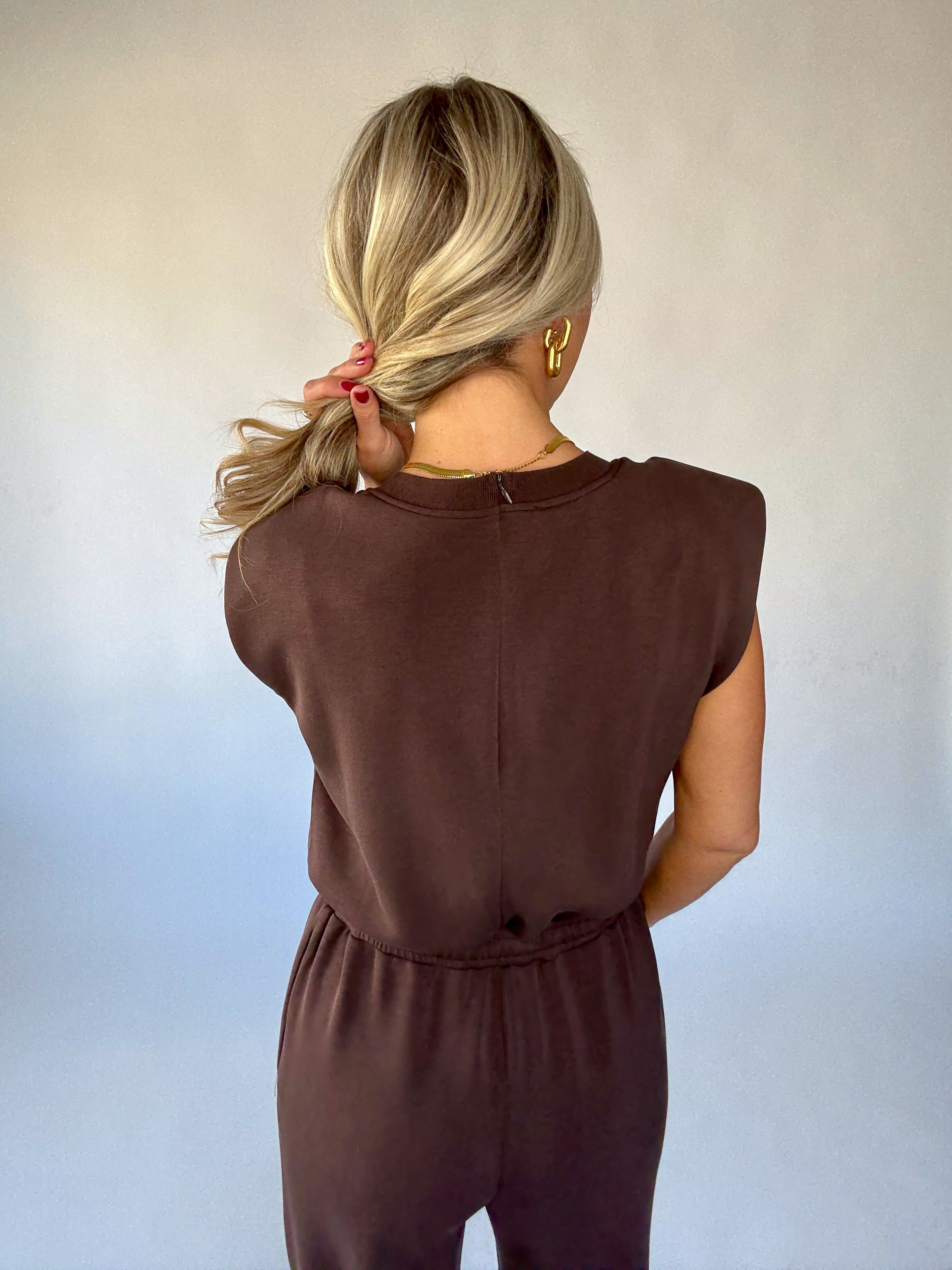 Discover the perfect blend of polish and comfort with the Espresso Ease Jumpsuit. Crafted from luxuriously brushed modal fabric, this piece offers an ultra-soft feel that drapes beautifully on the body. Designed with subtle padded shoulders and a sleek sleeveless silhouette, it creates a flattering, structured shape without sacrificing ease. The adjustable drawstring waist cinches effortlessly for definition, while side pockets and front seam details add a refined, tailored touch.