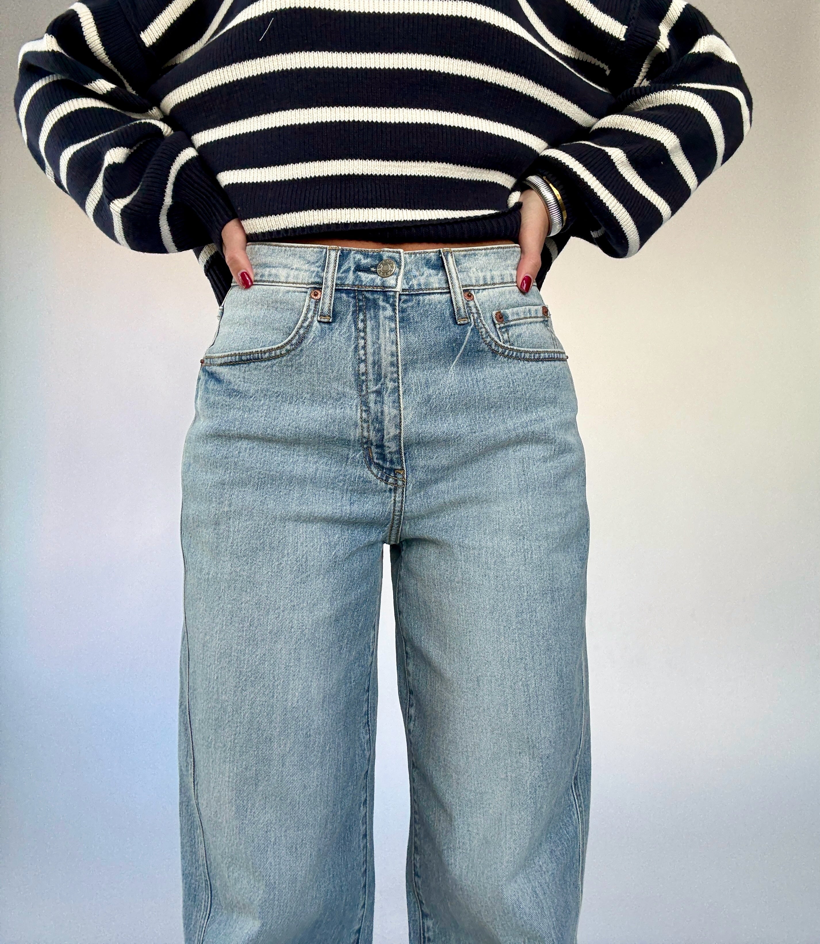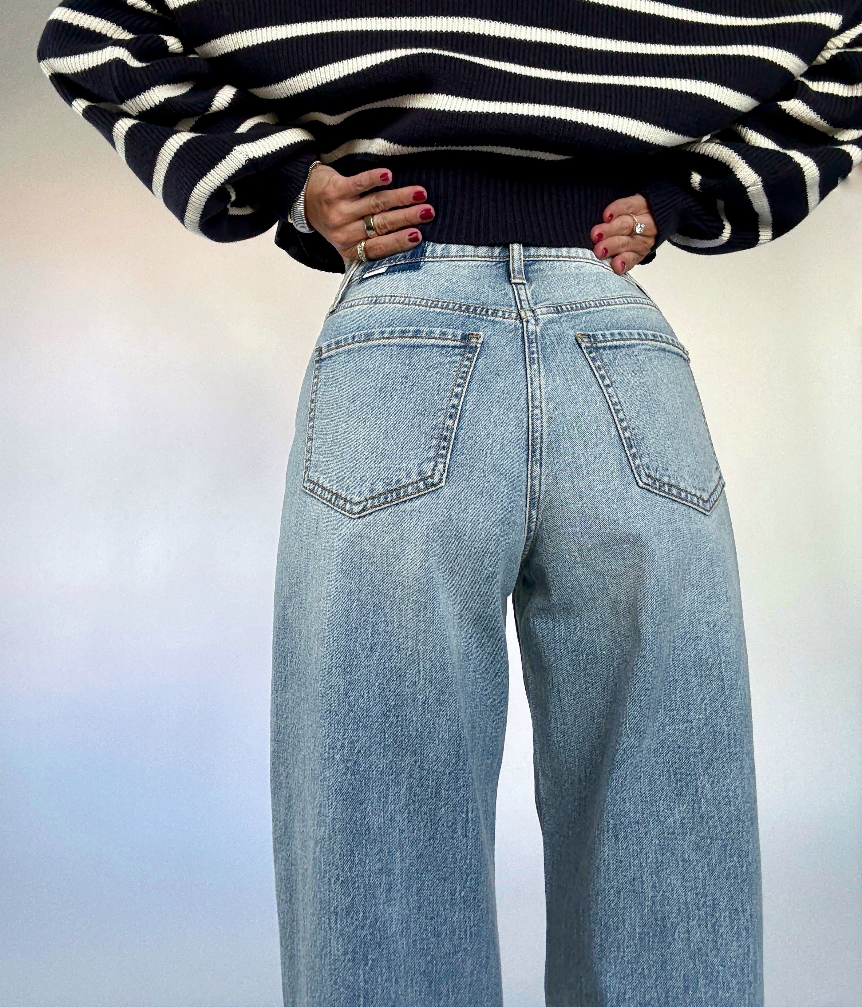 The Barely Barrel Jeans bring modern ease to a timeless silhouette. Crafted from eco-friendly organic fabric and finished with a wash process that reduces both water and chemical usage, this pair blends sustainability with effortless style. The high-rise design features a cinched waist, bowed barrel leg, and a softly tapered ankle, all set against a versatile light wash. Constructed from a signature Tough Love Fabric, the denim is mostly rigid yet molds comfortably to your shape in all the right places.