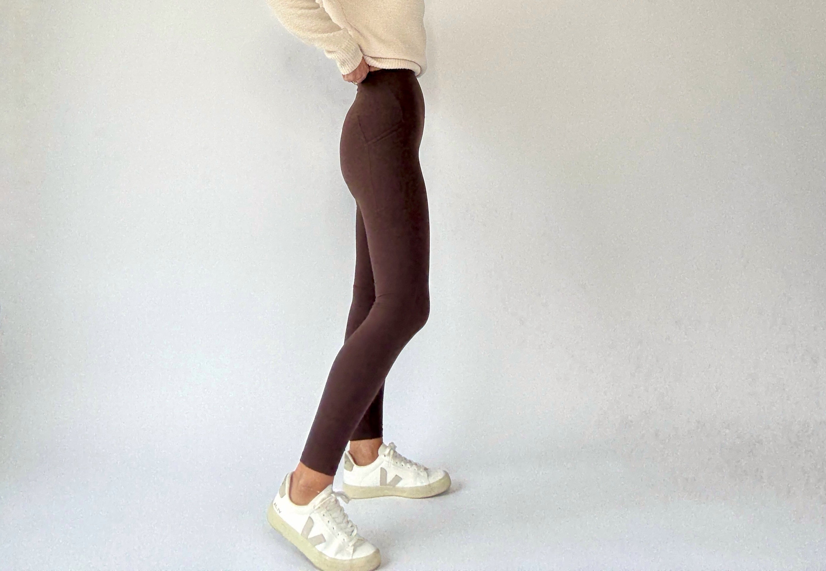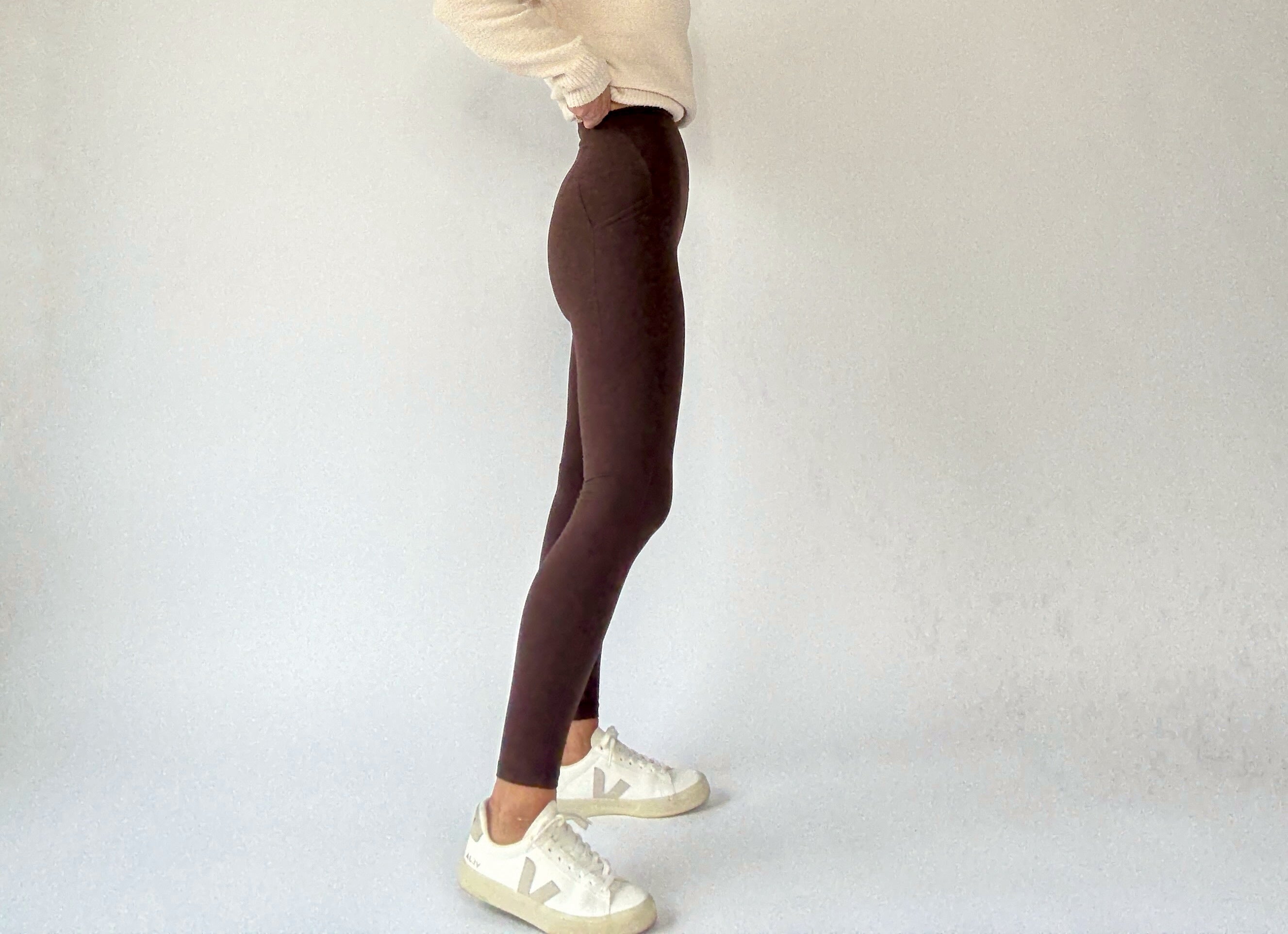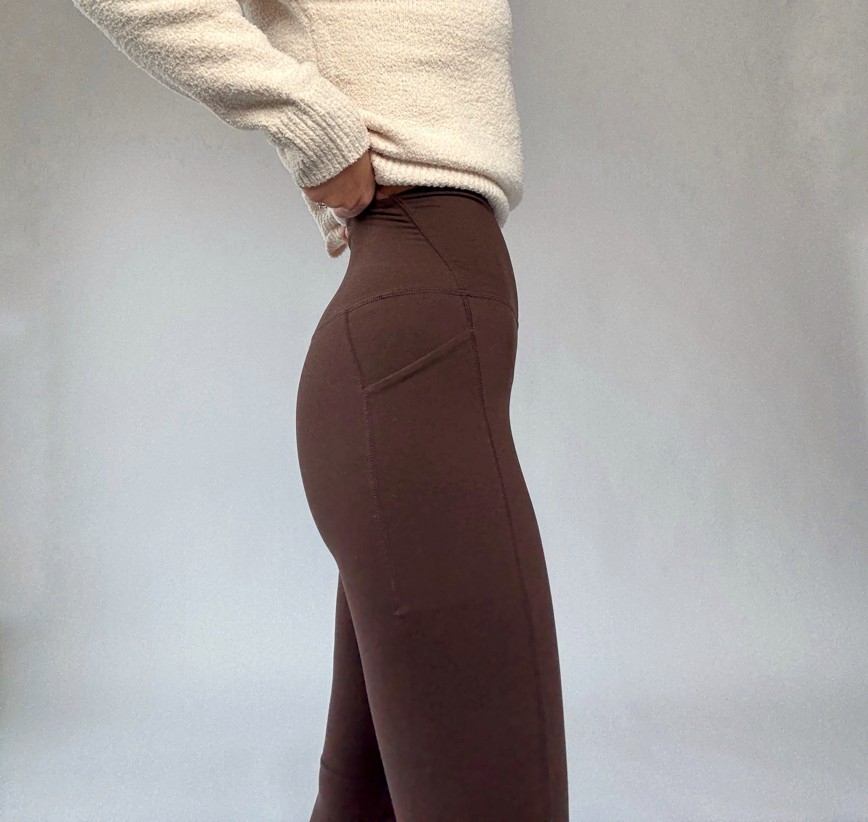 Designed with a flattering high-rise waist, they provide a streamlined silhouette that pairs effortlessly with long sweaters, tunics, or activewear tops. The full-length cut enhances versatility, while practical side pockets add subtle functionality without compromising style.