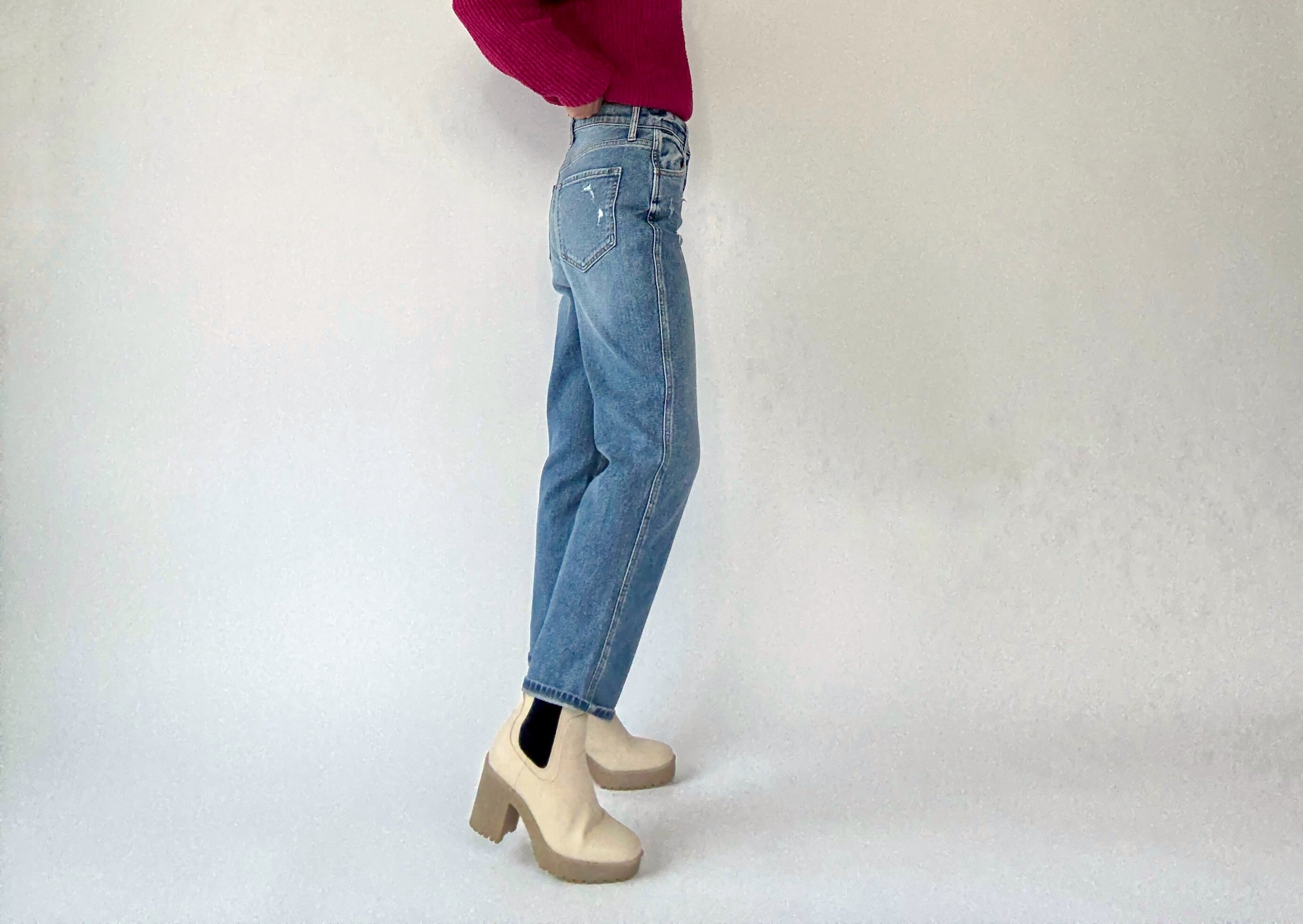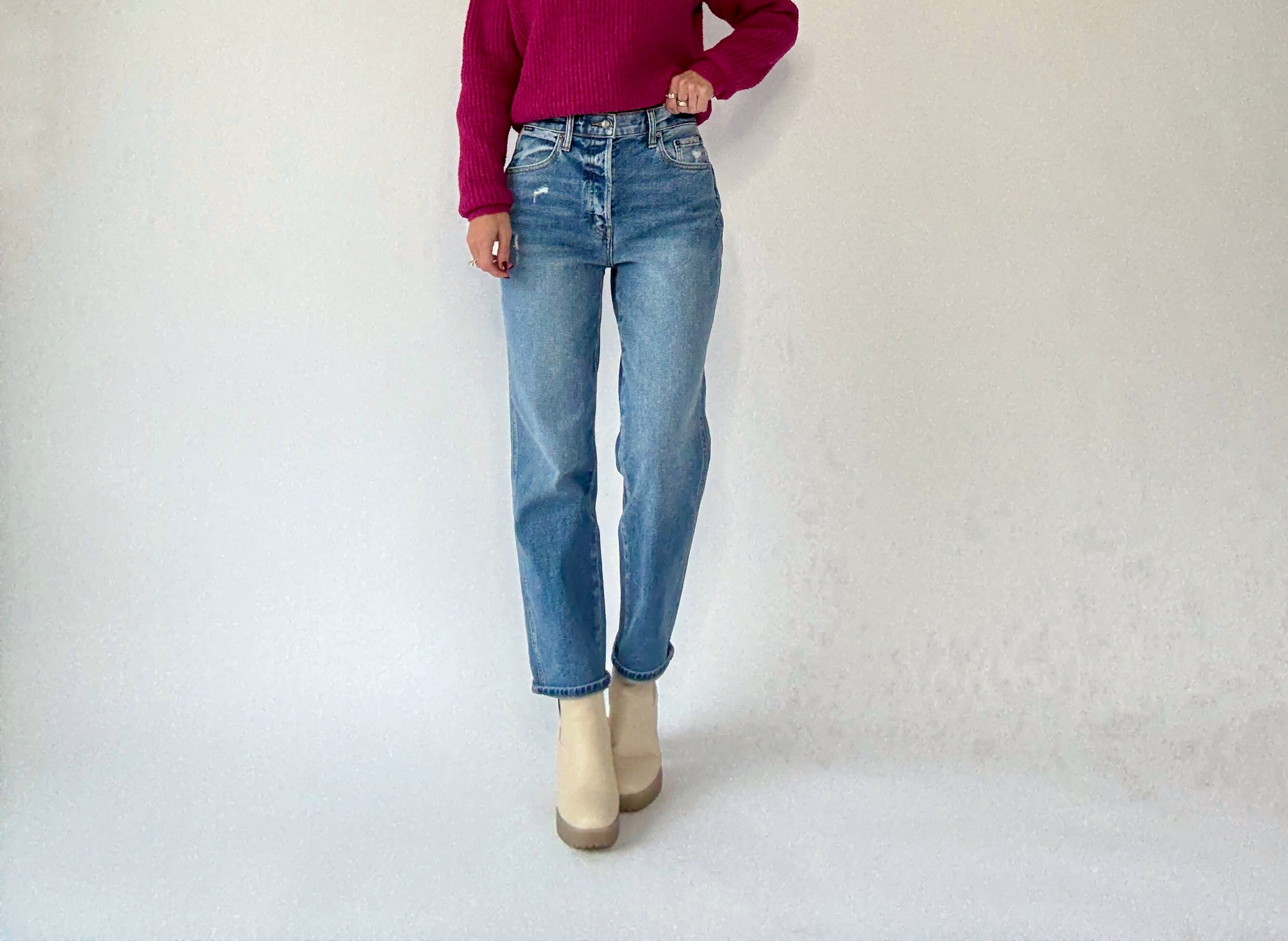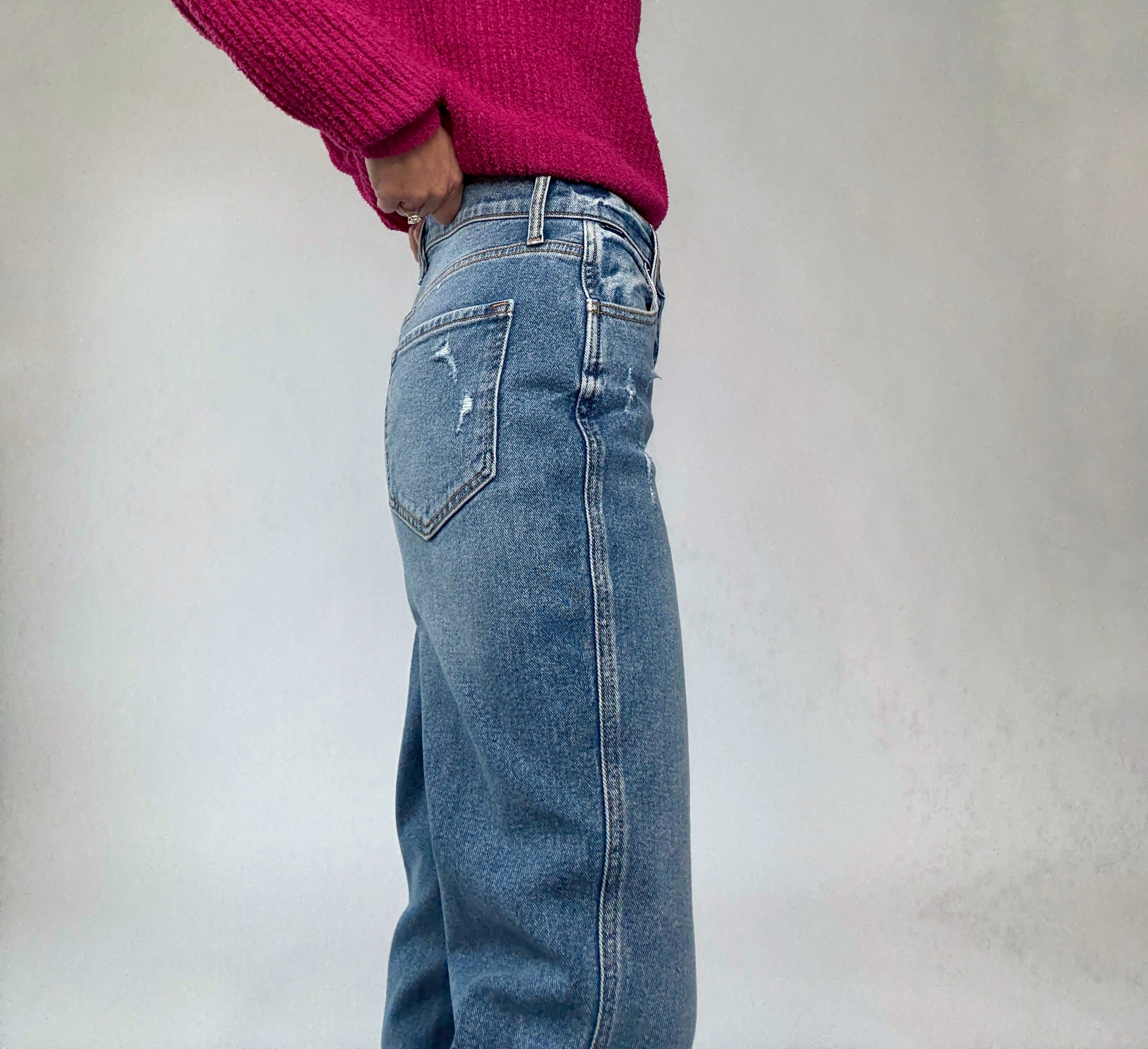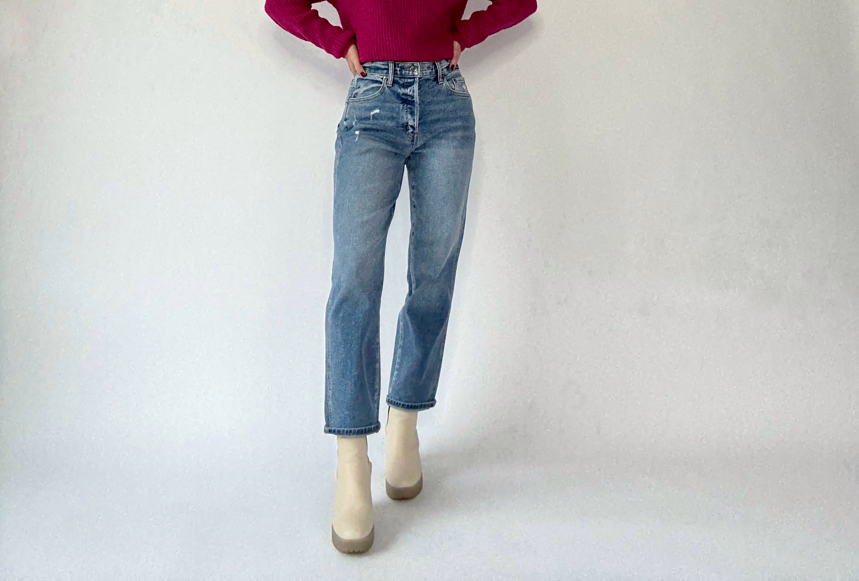 Finished in a beautiful medium wash with a timeless button-fly front, these jeans pair effortlessly with everything from cozy sweaters and casual tops to elevated layers like tailored blazers. Whether styled with sneakers for everyday comfort or boots for a more refined ensemble, this boyfriend jean brings relaxed sophistication to every outing.