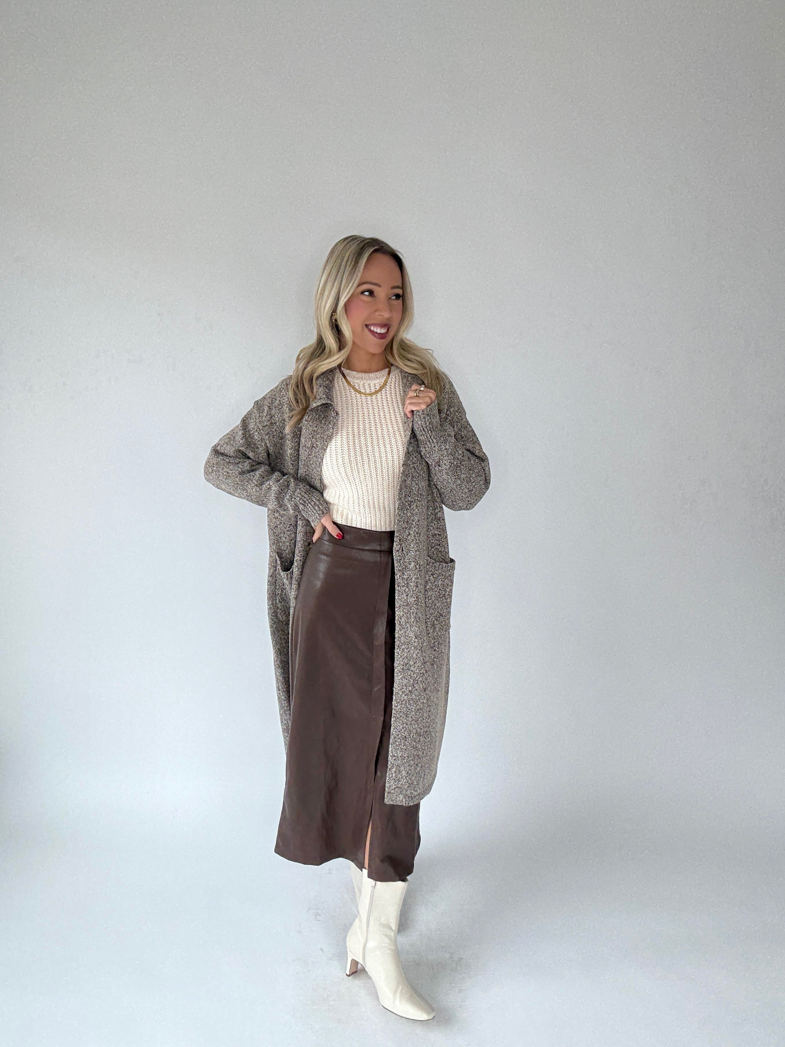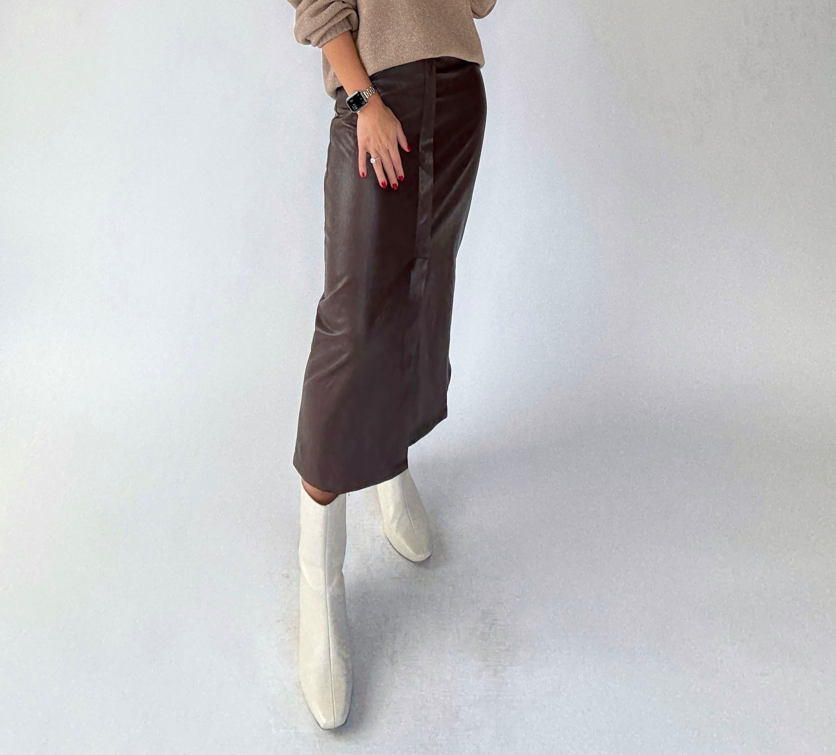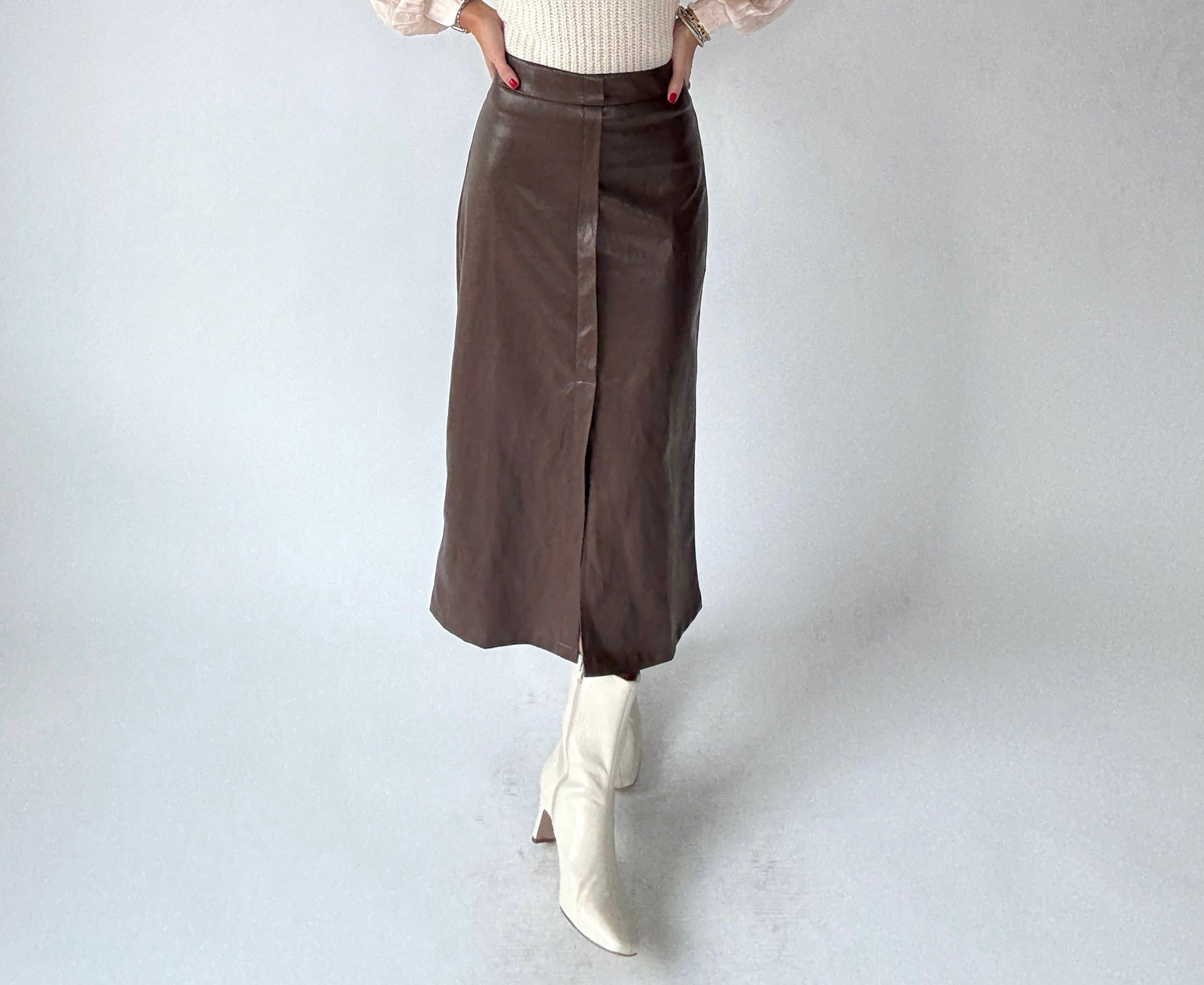 Refined and versatile, the Chocolate Love Vegan Leather Skirt is a front-slit midi skirt crafted in luxuriously soft vegan leather. Thoughtful trim and a subtle front flap add sophisticated detail, while a discreet back zipper ensures a seamless fit. Perfectly paired with our Vintage Blush Contrast Sweater or any blouse or knit, this skirt transitions effortlessly from workdays to date nights.