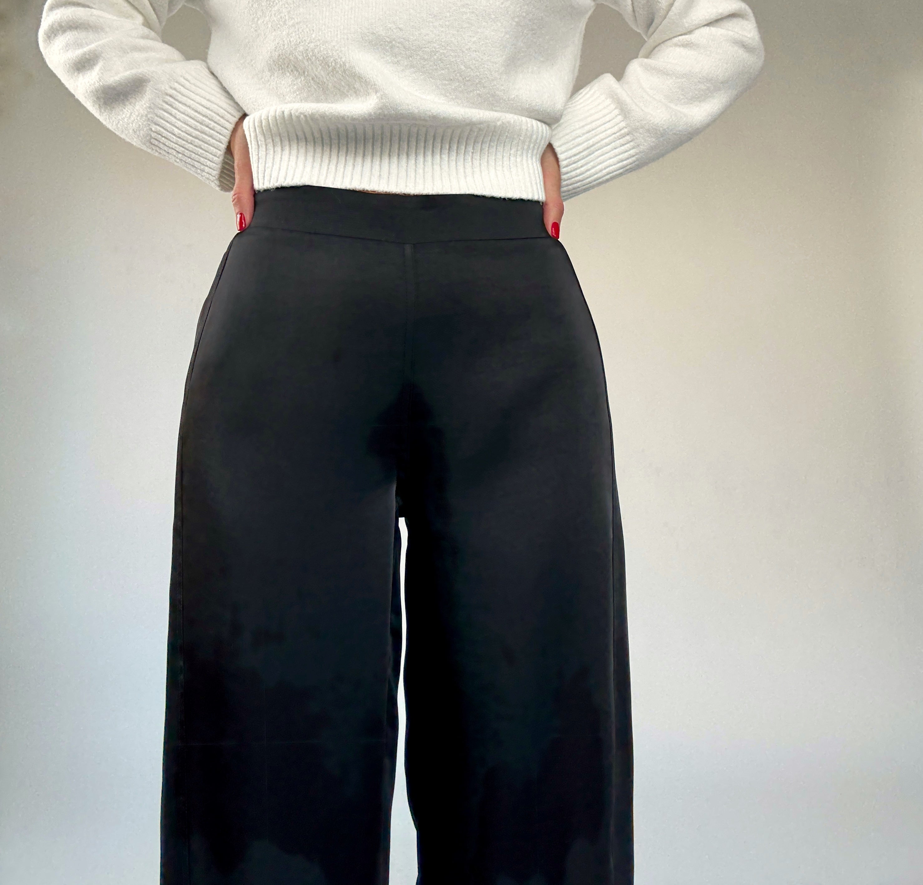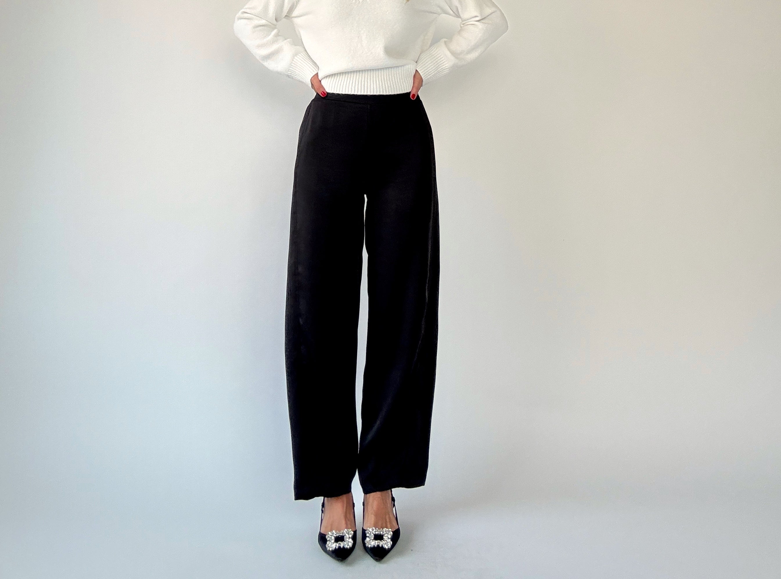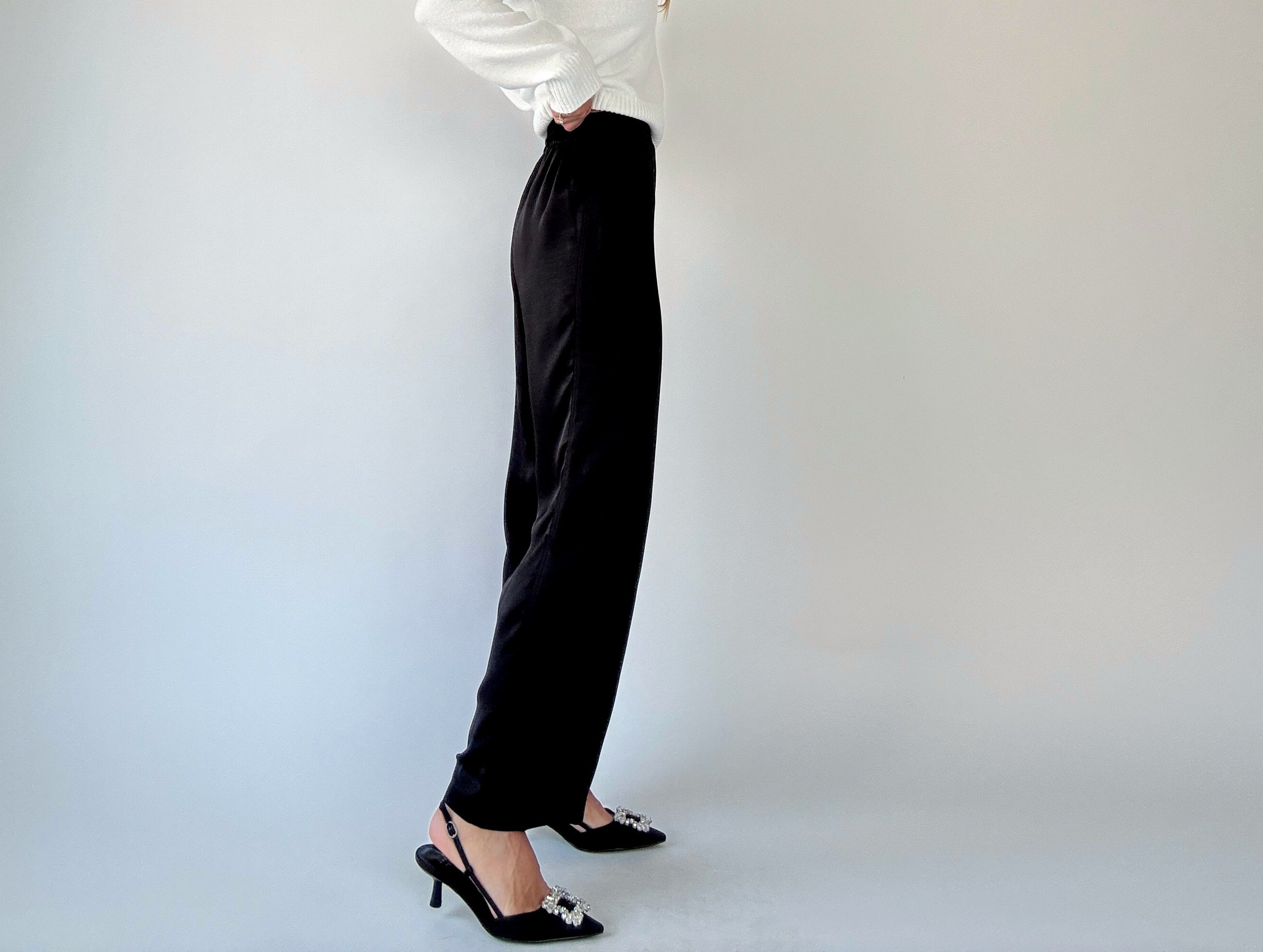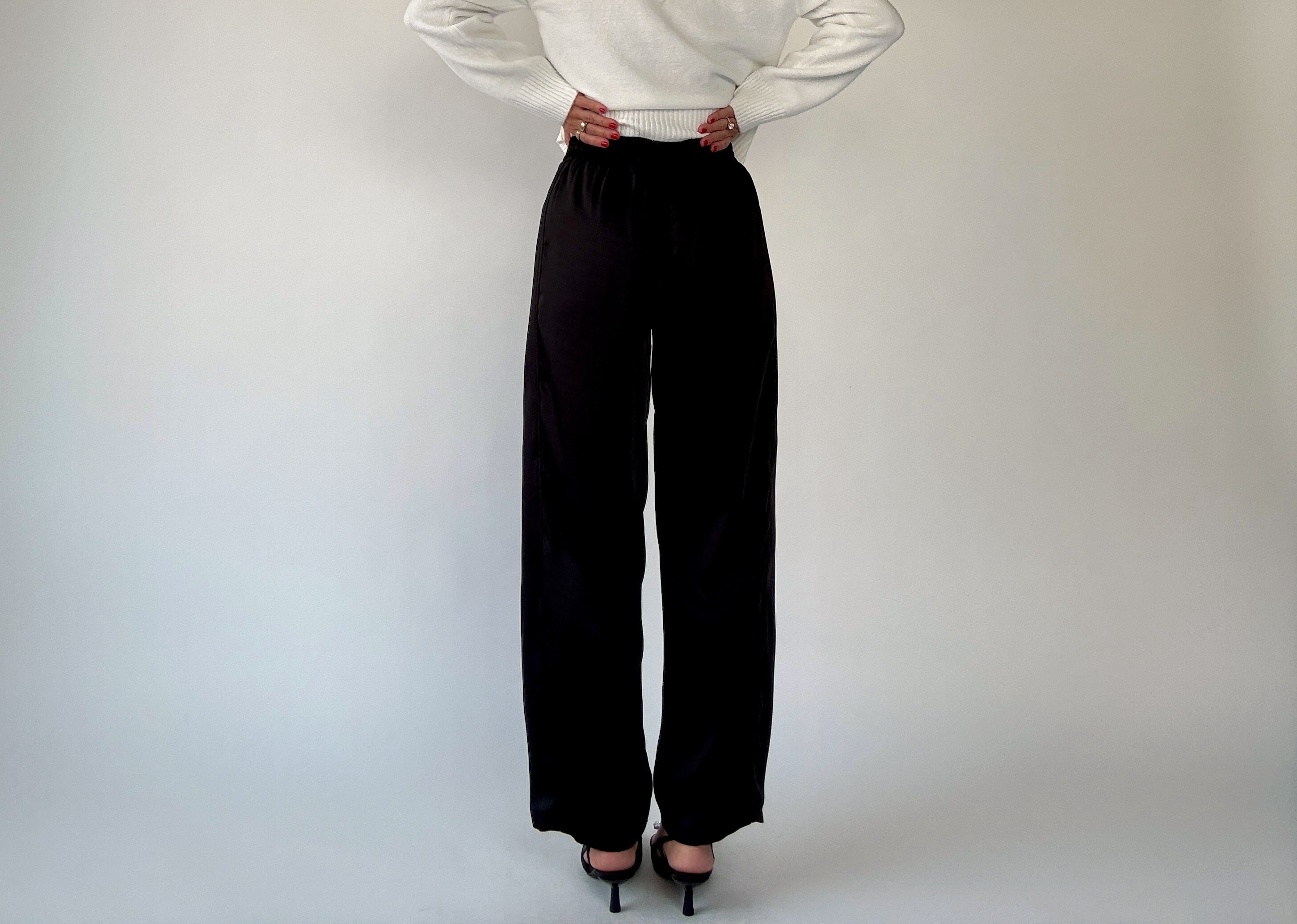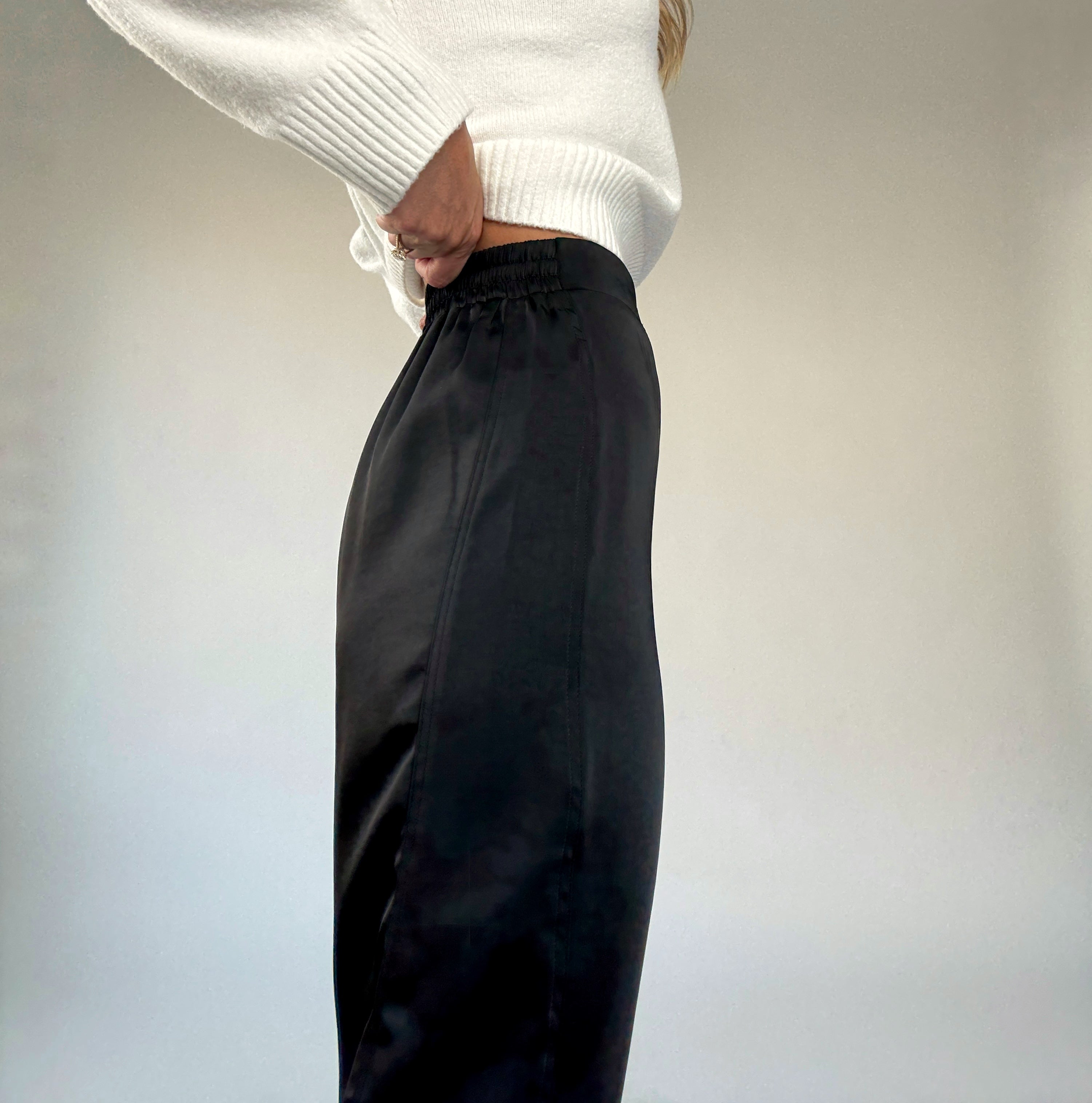 Effortlessly refined, the Evening Elegance Satin Pants bring a touch of sophistication to every occasion. Designed in a smooth, silky fabric that drapes beautifully, these pull-on pants feature an elastic waistband for all-day comfort and a streamlined, pocket-free silhouette. Subtle trim detailing along the sides adds an elevated finish, while the slight barrel leg and gentle cinching at the hem create a tailored, modern shape.