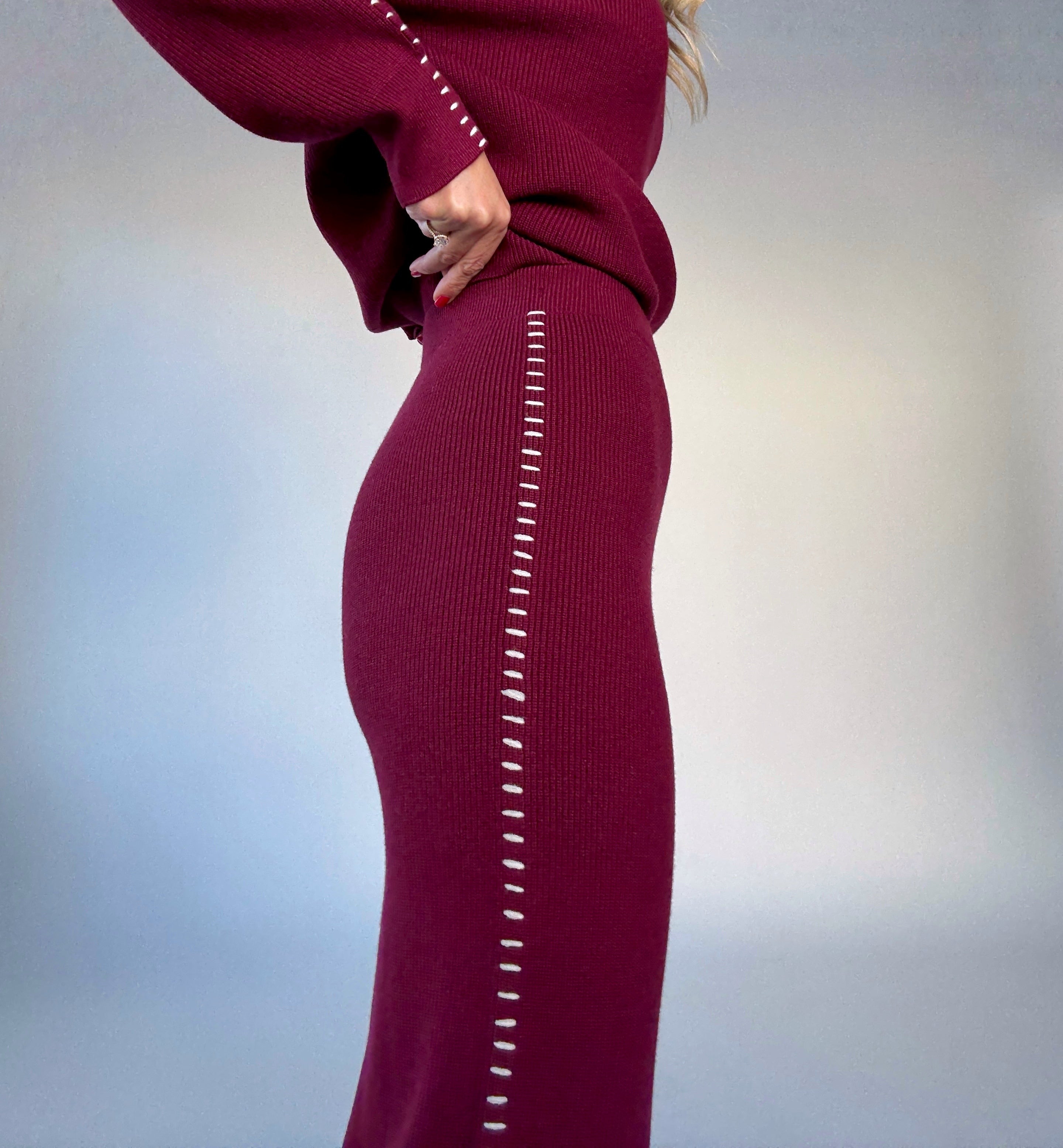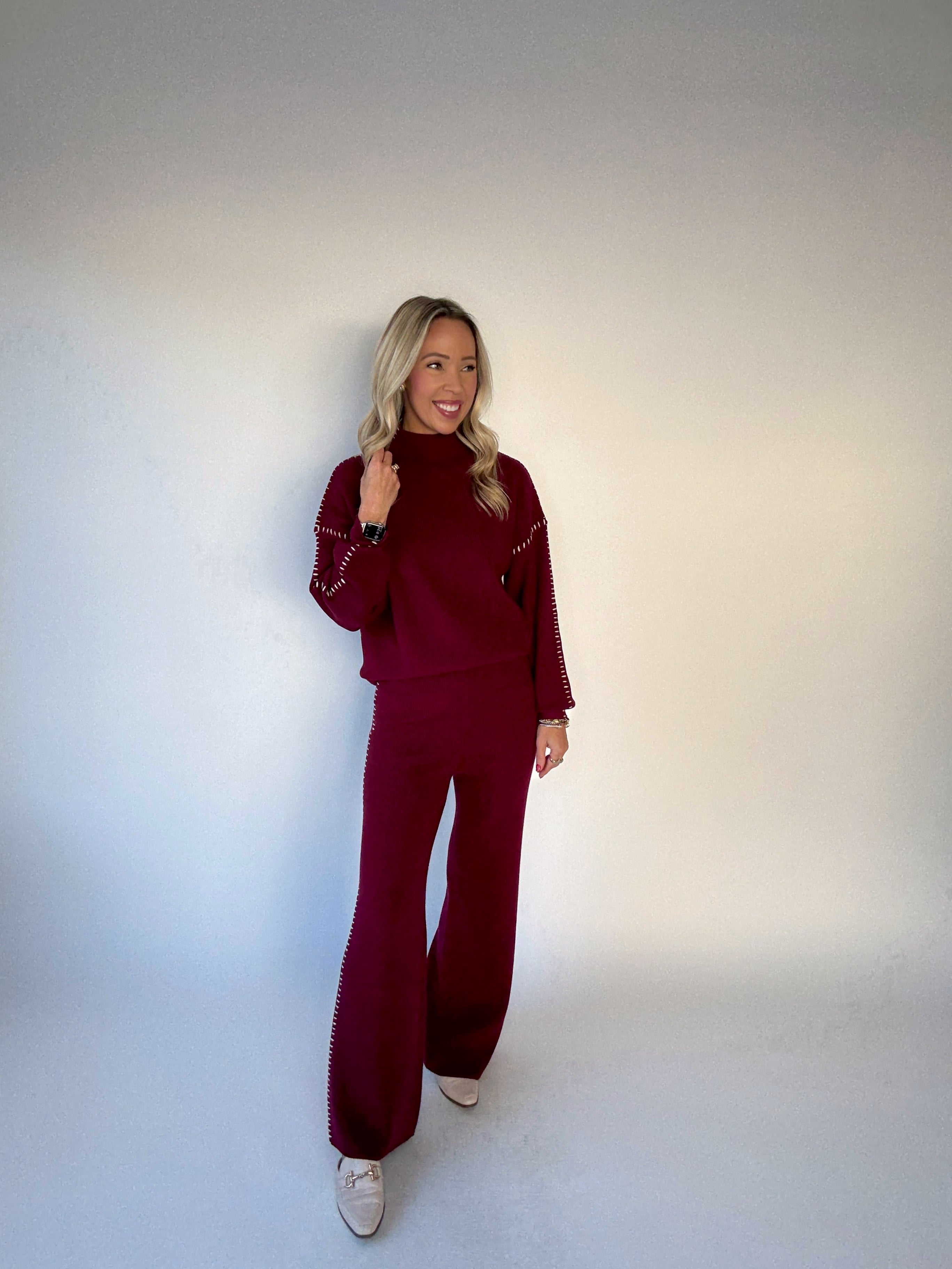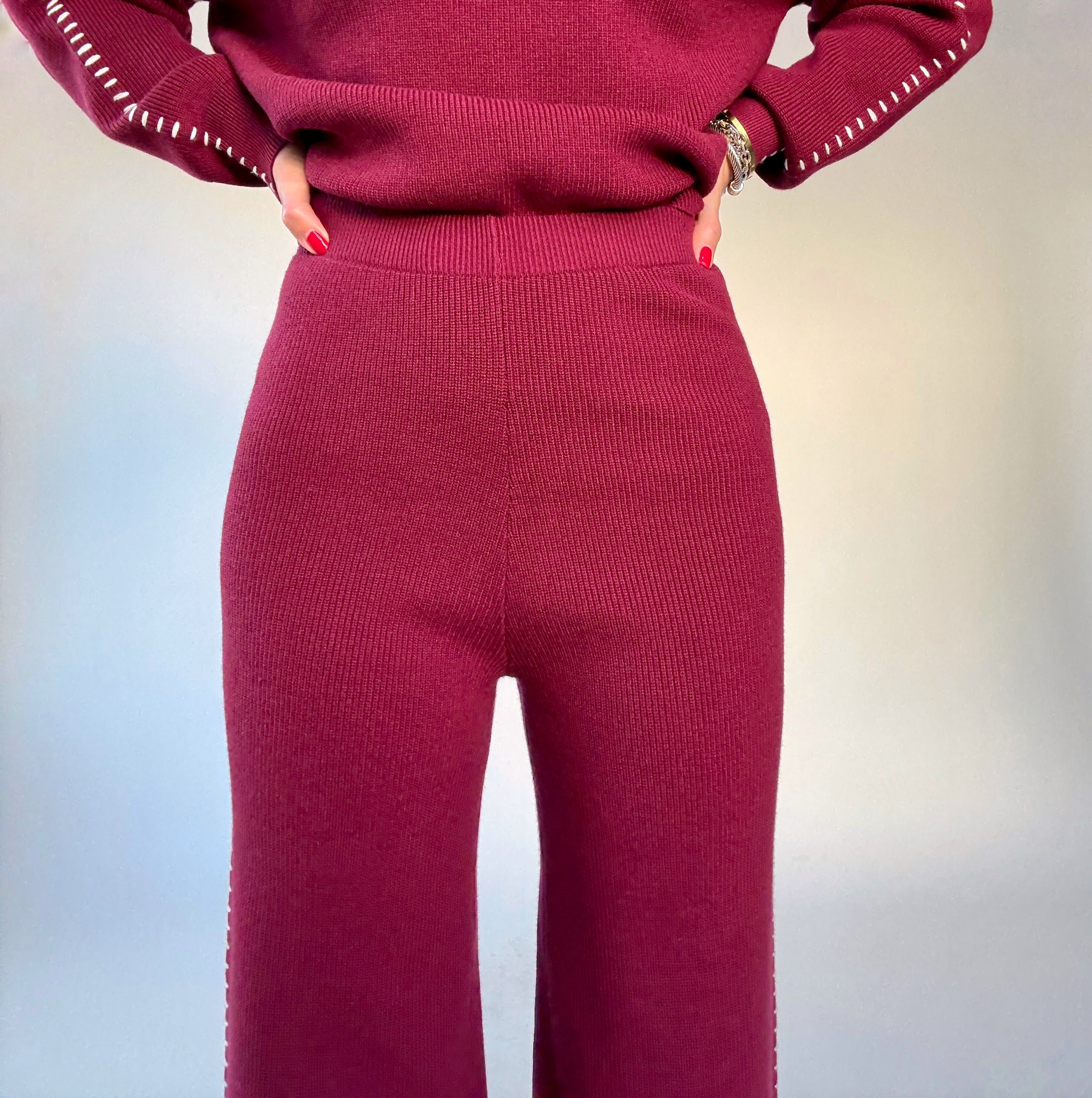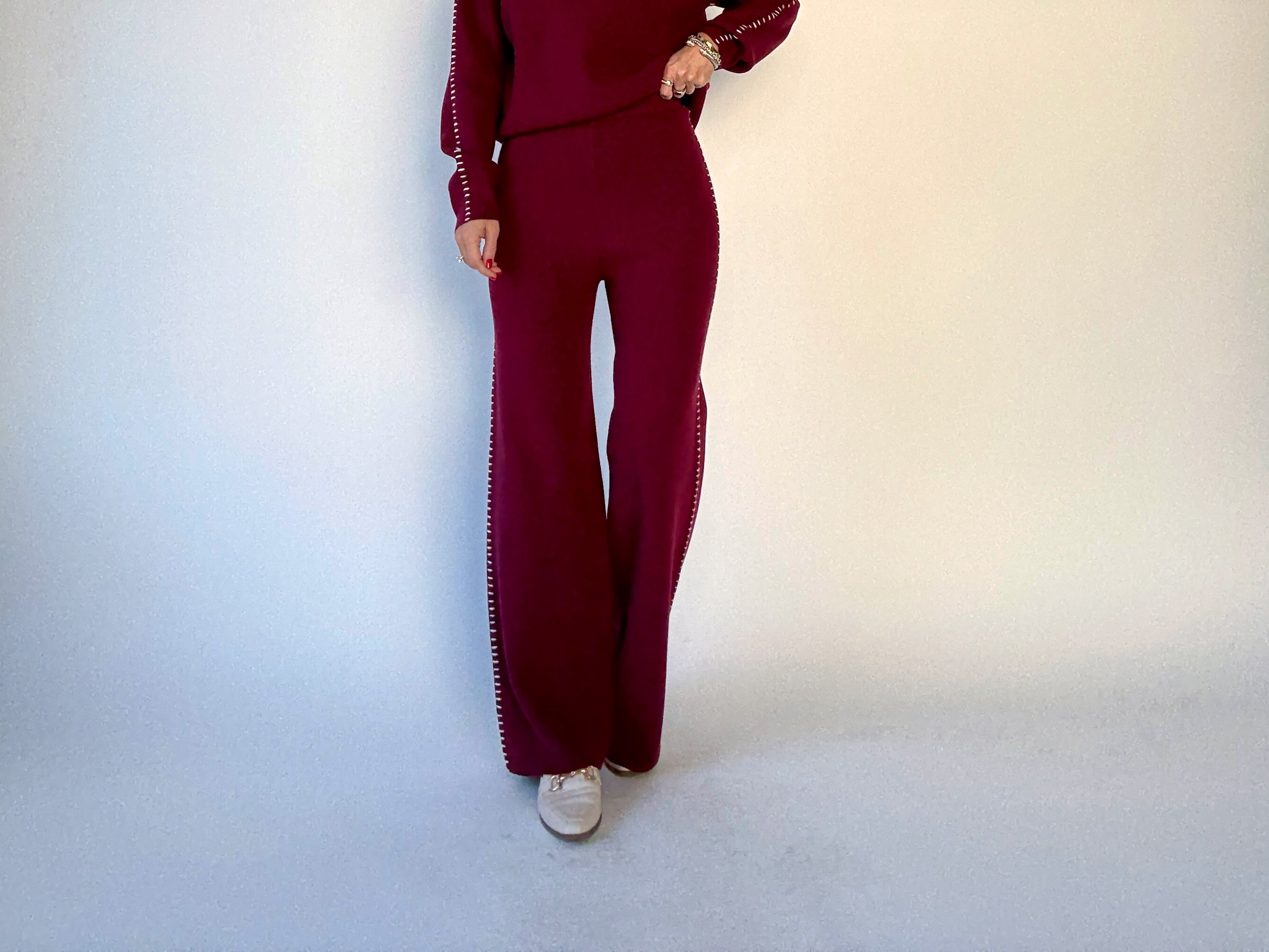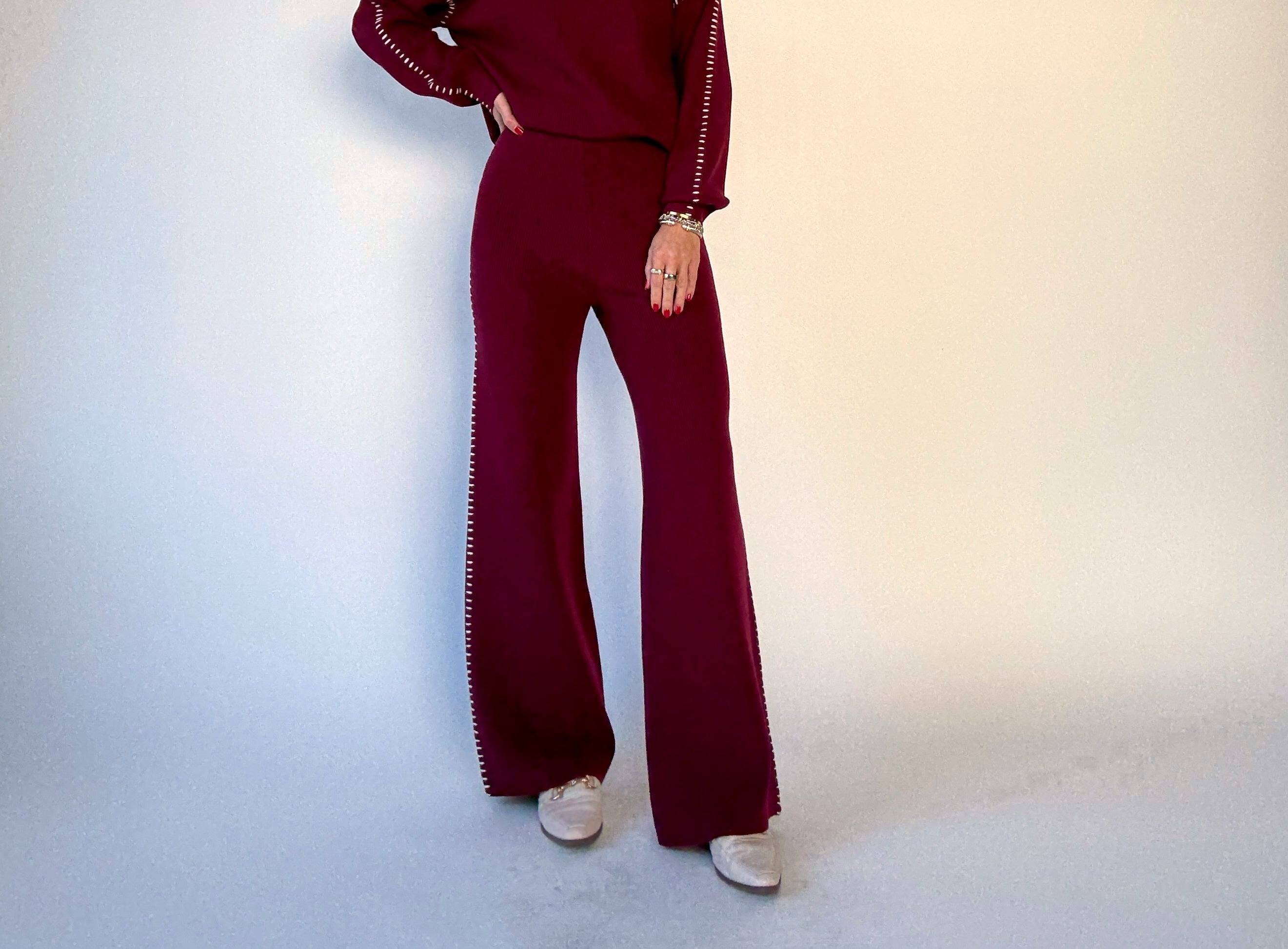 Effortlessly refined and endlessly cozy, the Holiday Comfort Pants bring sophistication to relaxed dressing. Crafted from the same ultra-soft, thick material as the matching Holiday Comfort Top, these pants feature an easy elastic waistband, wide legs and a high waist for a comfortable, flattering fit. The white whipstitch detail running down the center of each leg adds a distinctive, elevated touch while elongating the silhouette. Designed without pockets for a smooth, streamlined finish, these pants pair perfectly with the coordinating top for a polished, put-together look.