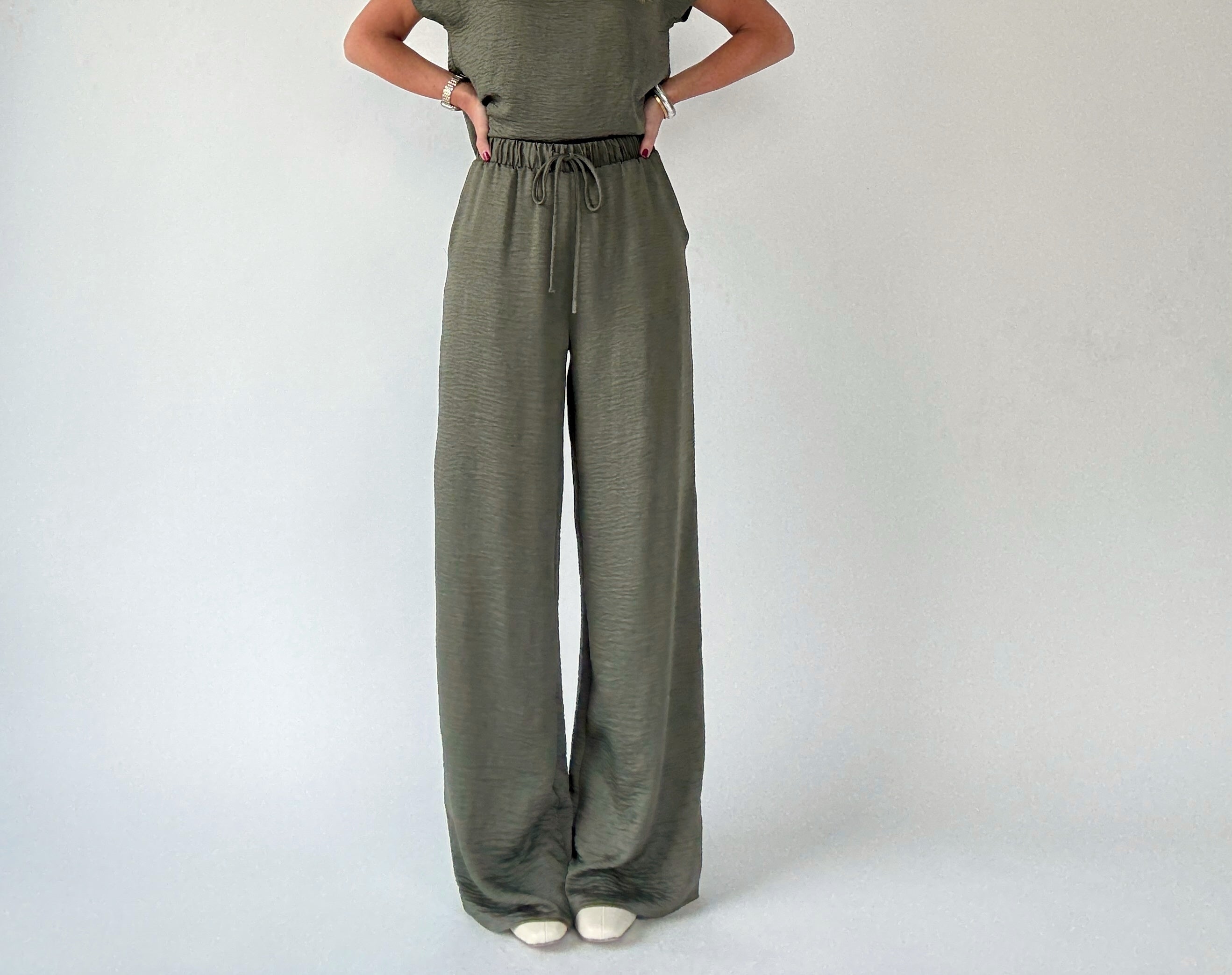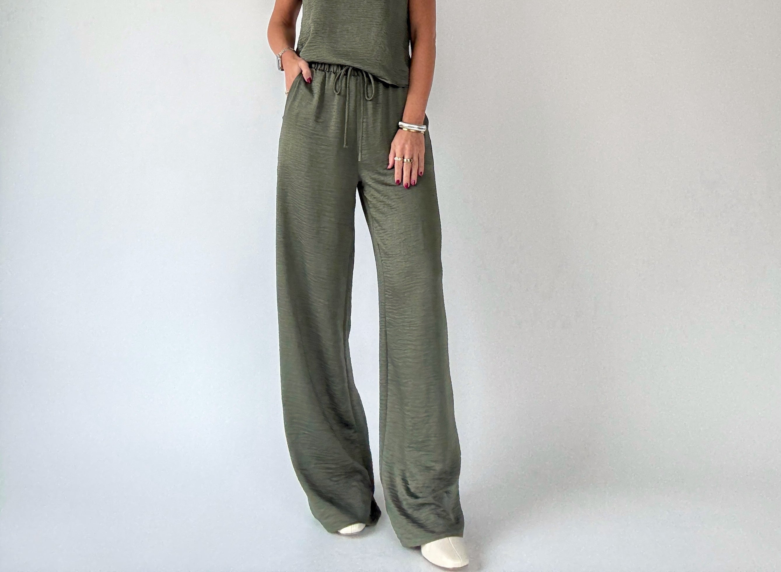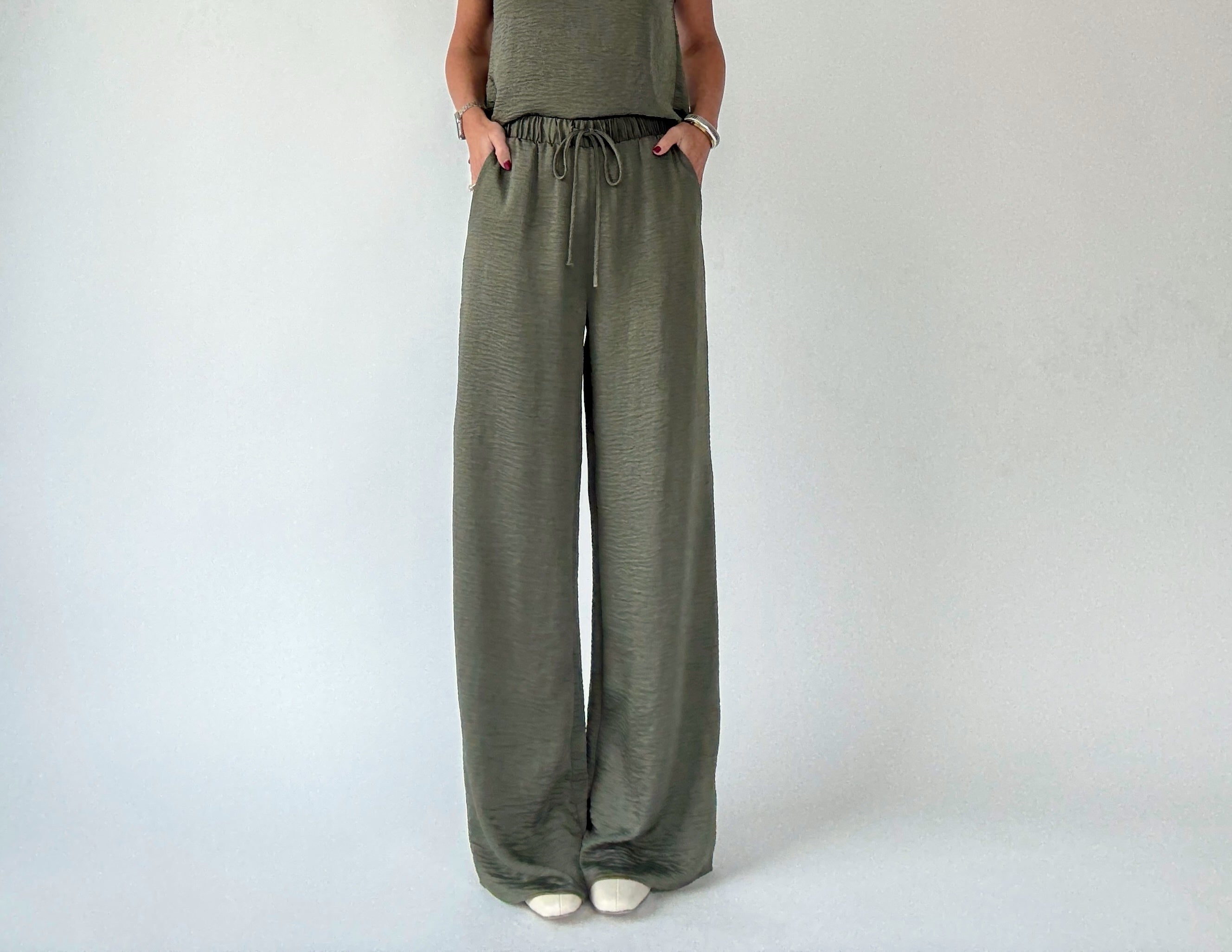 Complete the effortlessly chic look with the Soft As Satin Pants, crafted from the same luxuriously soft, satin-like fabric as the matching top. Featuring an elastic waistband with a functional drawstring and convenient side pockets, these pants combine comfort with sophistication. Perfect as a coordinated set with the Soft As Satin Top, or styled individually with blouses or casual tees, they transition seamlessly from everyday errands to dressier occasions.