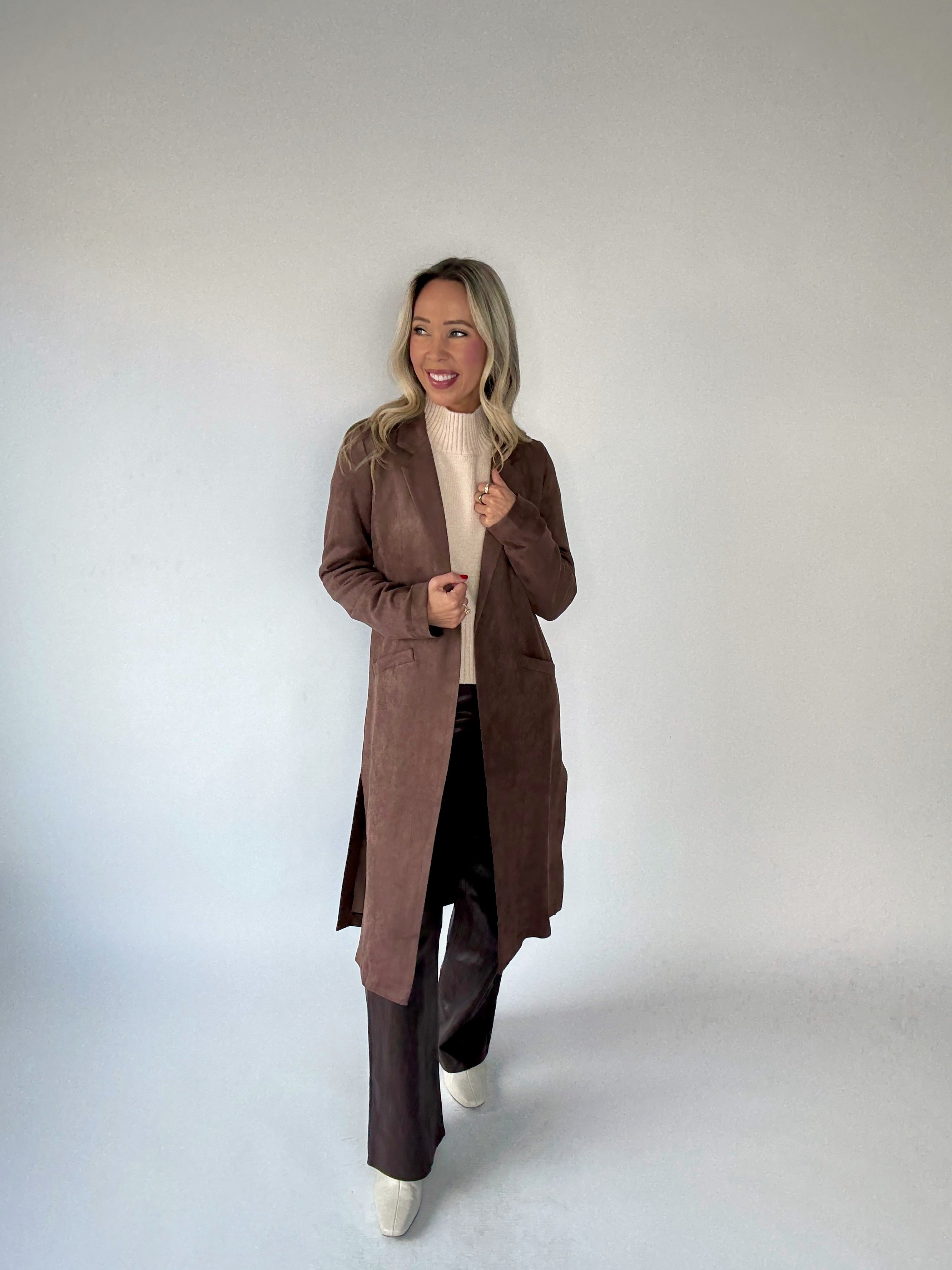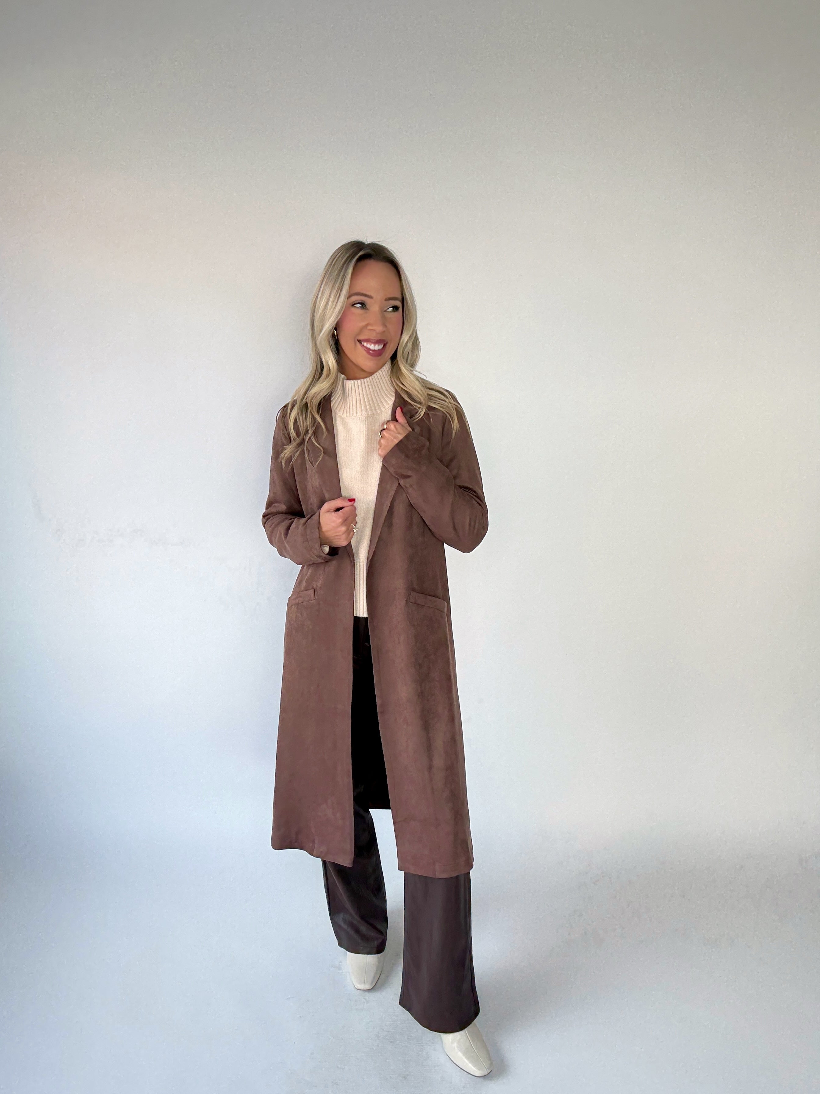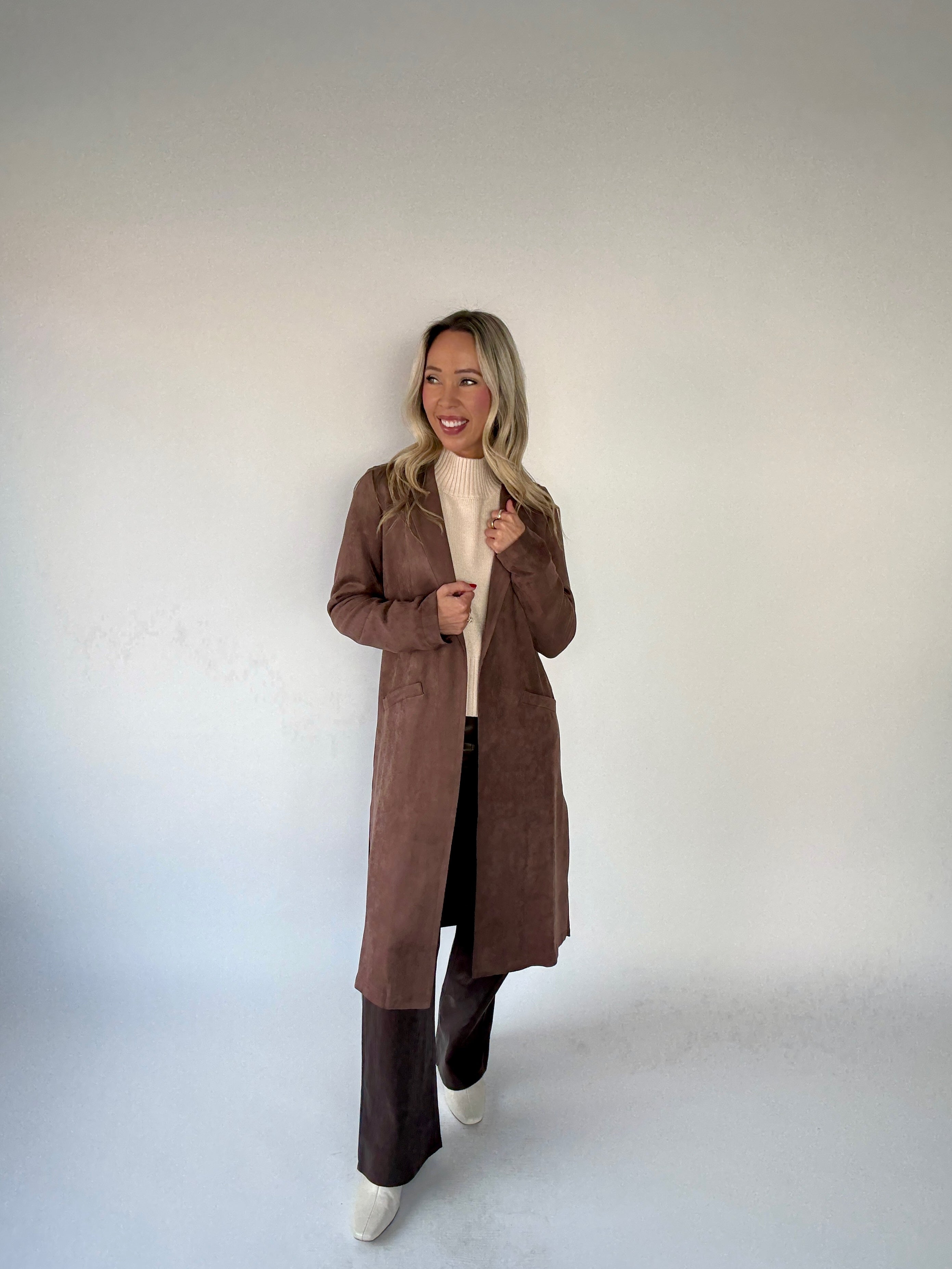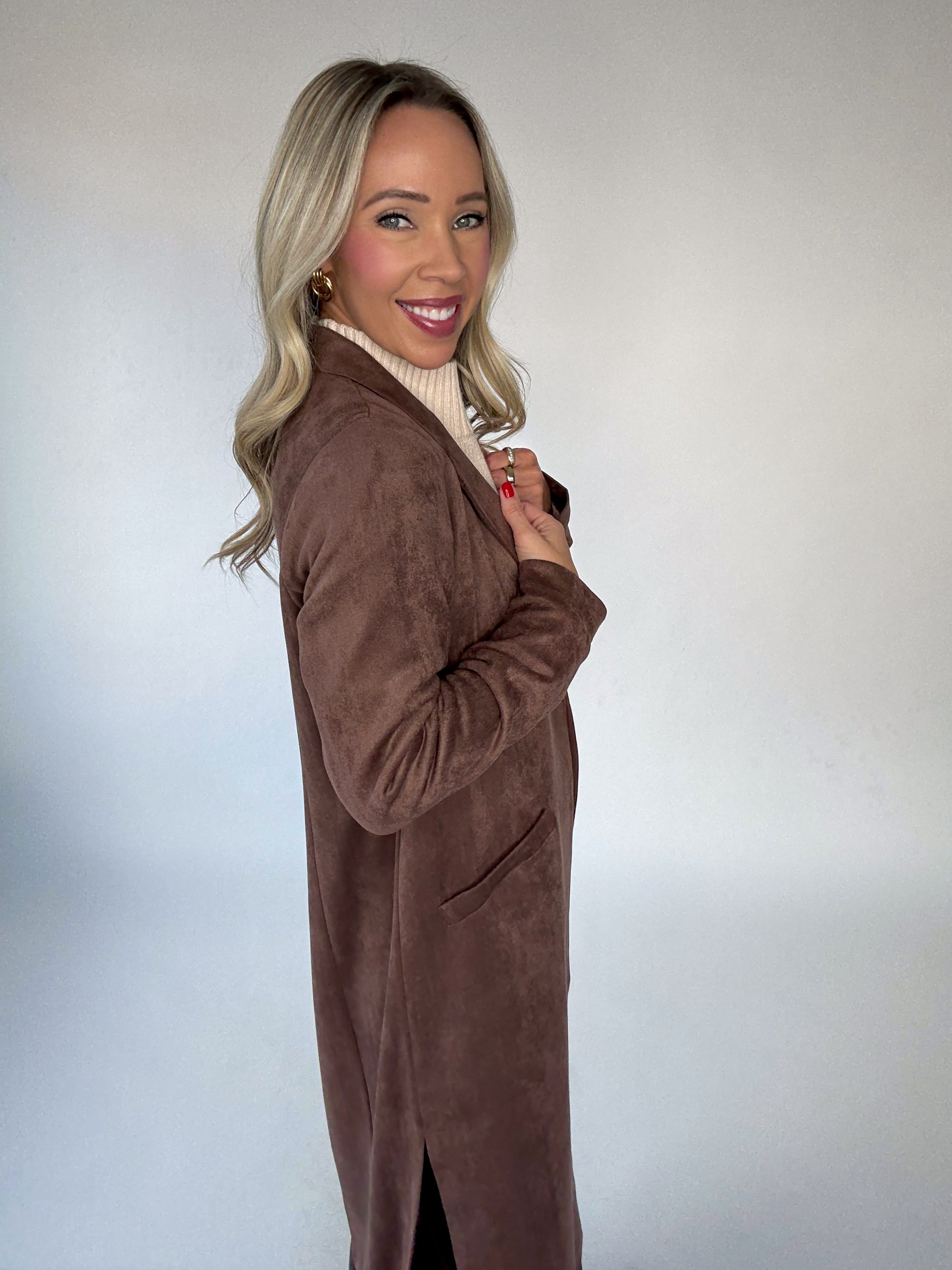 Effortlessly elegant and endlessly versatile, the Cinnamon Suede Duster is the quintessential layer for refined fall style. Crafted from luxuriously soft faux suede in a rich dark brown hue, this open-front duster drapes beautifully to a flattering knee length. Designed without closures for a clean, minimalist silhouette, it features two front slit pockets that blend function with understated sophistication. Lightweight yet cozy, it’s the perfect piece to layer over sweaters, blouses, or button-ups — pairing seamlessly with trousers or skirts for an elevated look, or with denim for relaxed polish.