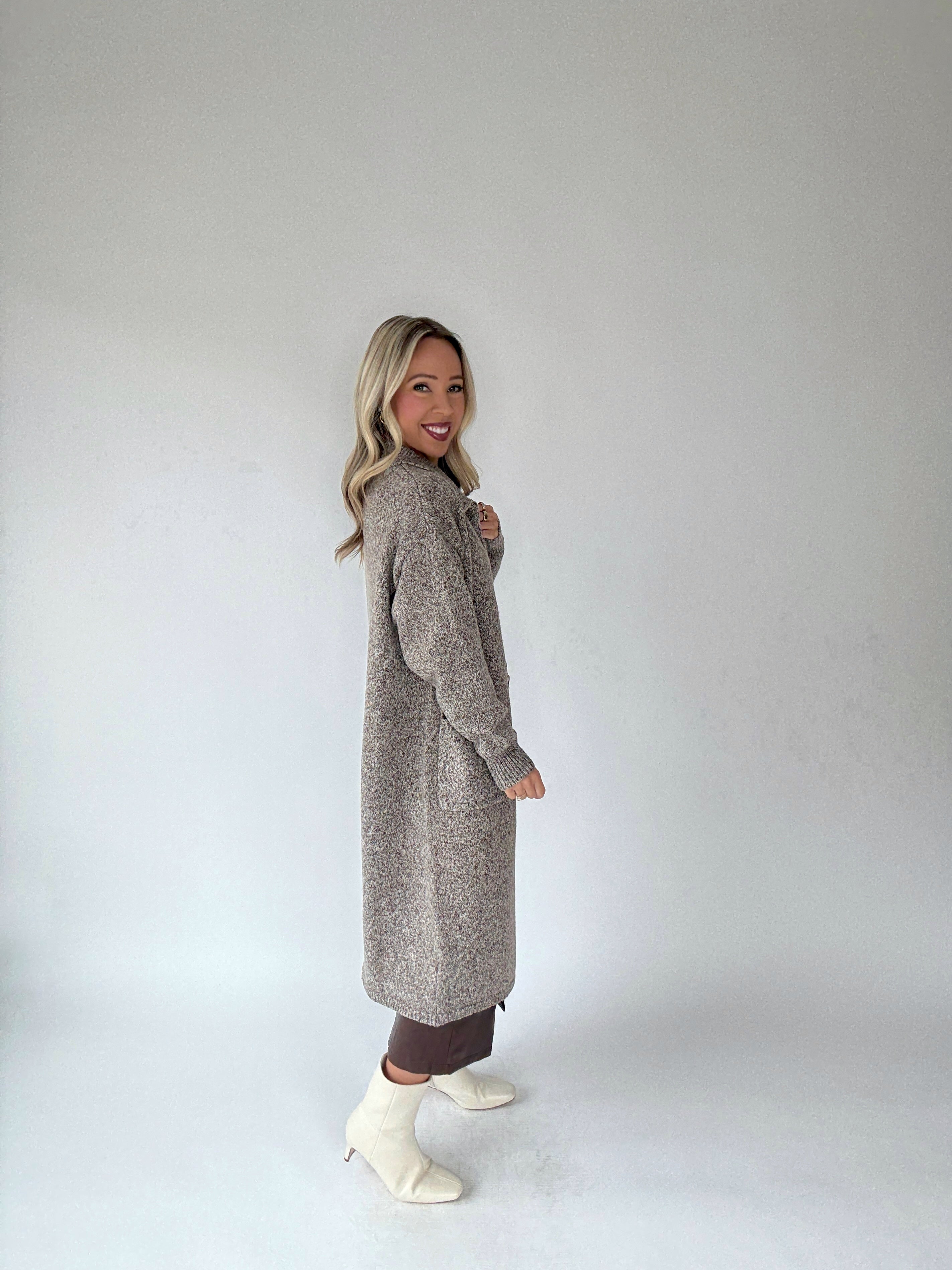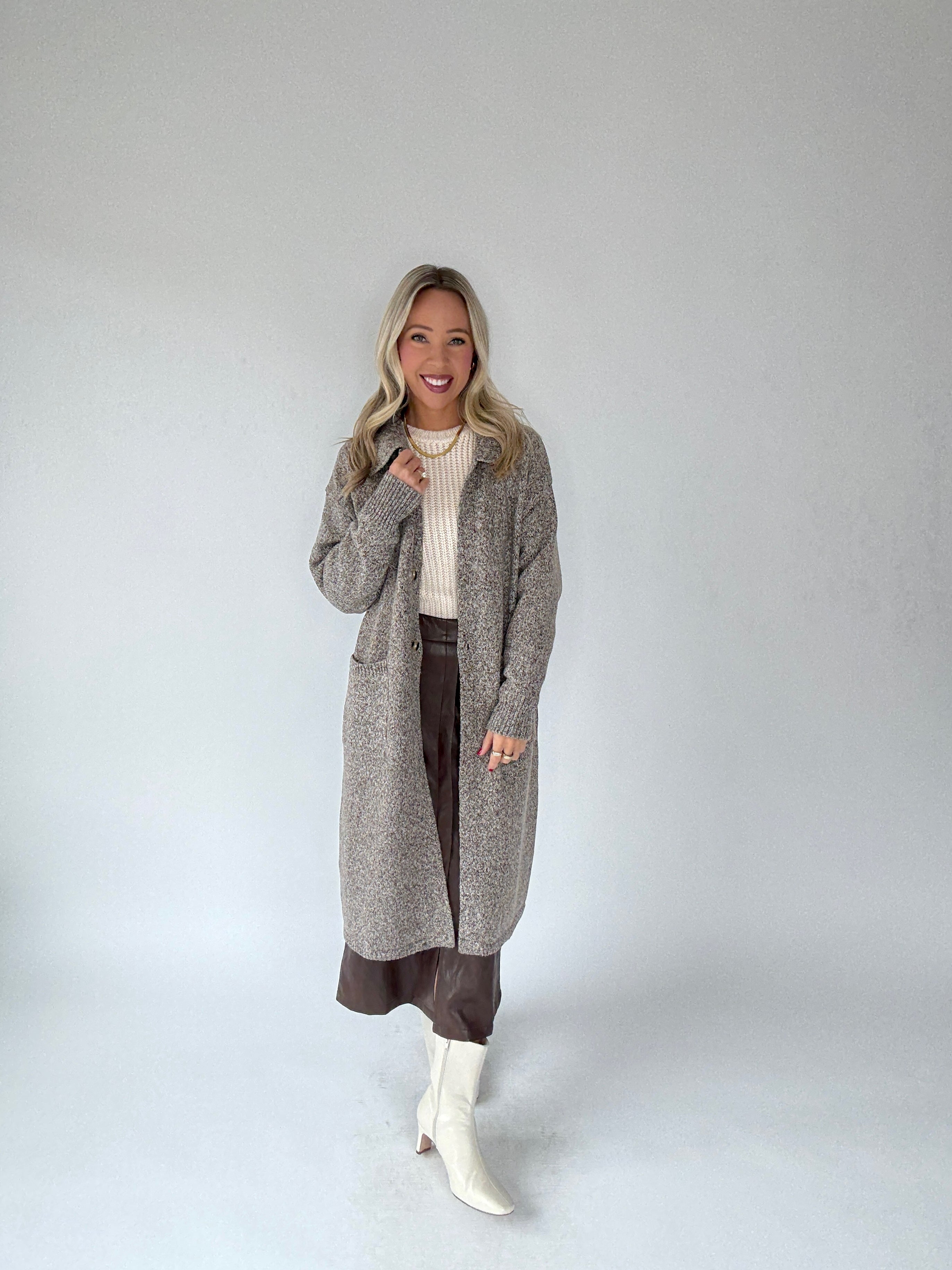 Cozy sophistication meets timeless style in the Morning Coffee Coat. Designed with a collared neckline and long maxi length, this sweater coat brings both warmth and refinement to your cold-weather wardrobe. Crafted in a heavier knit for maximum comfort, it features front buttons for closure and two functional pockets for an effortlessly practical touch.