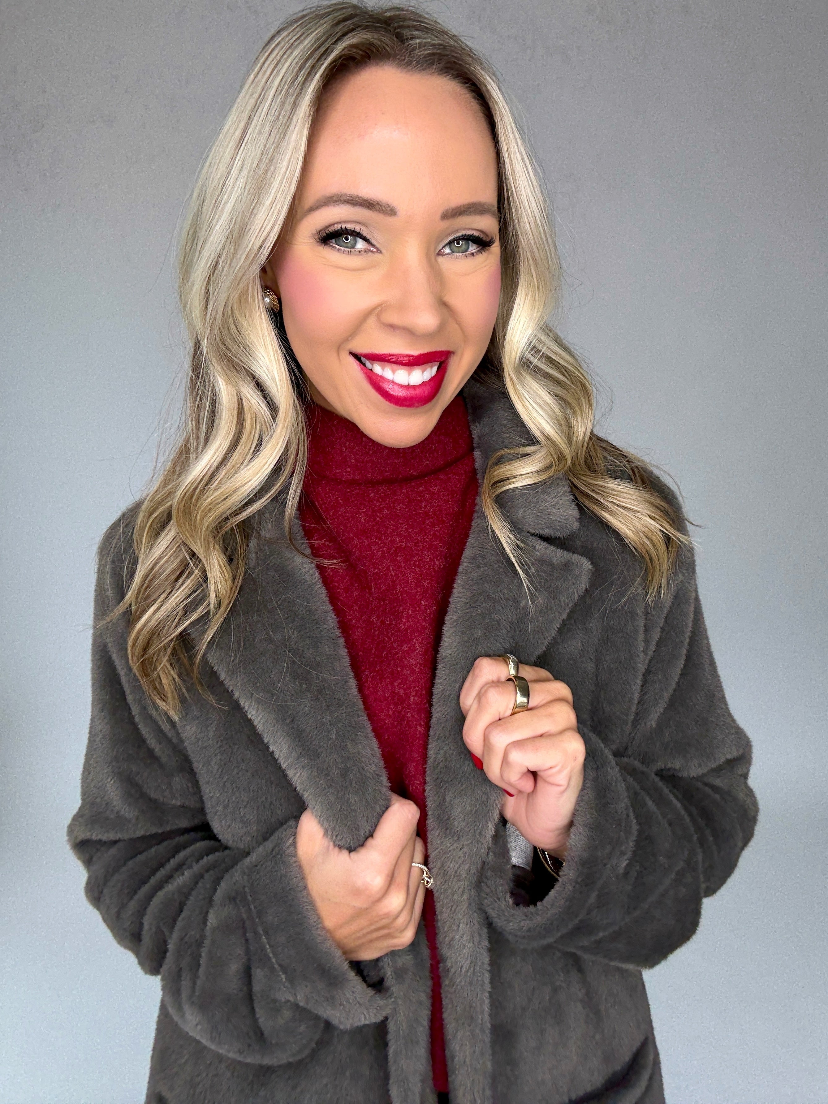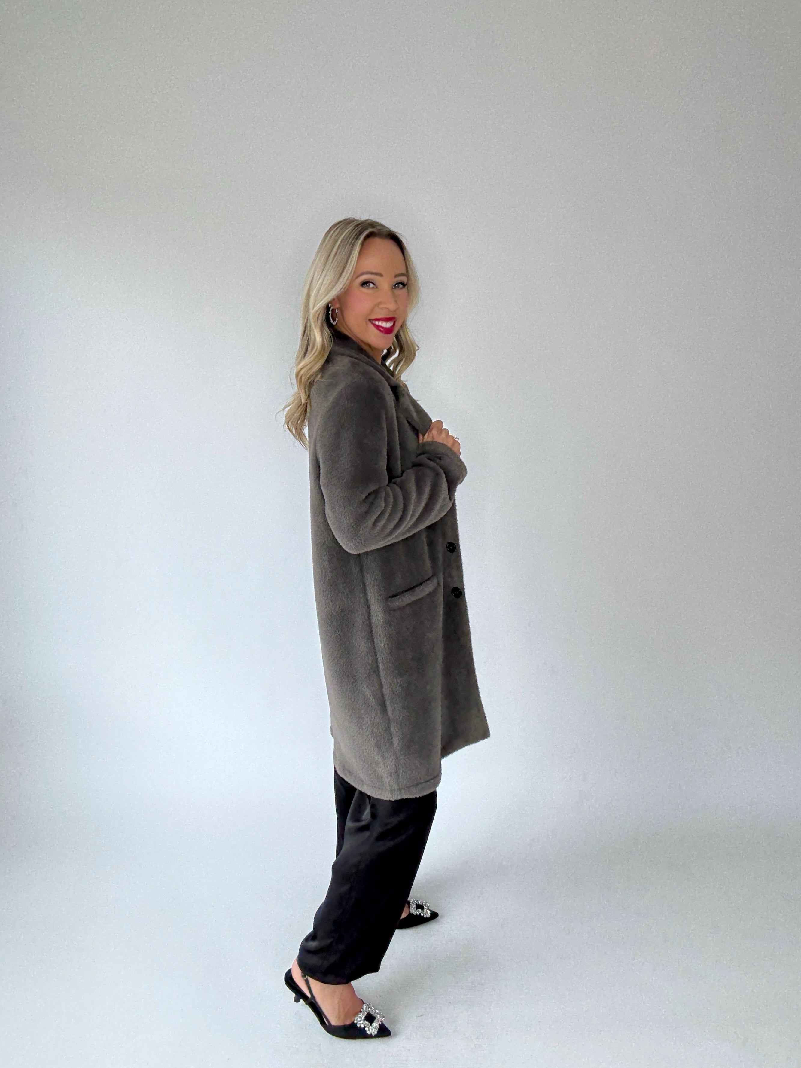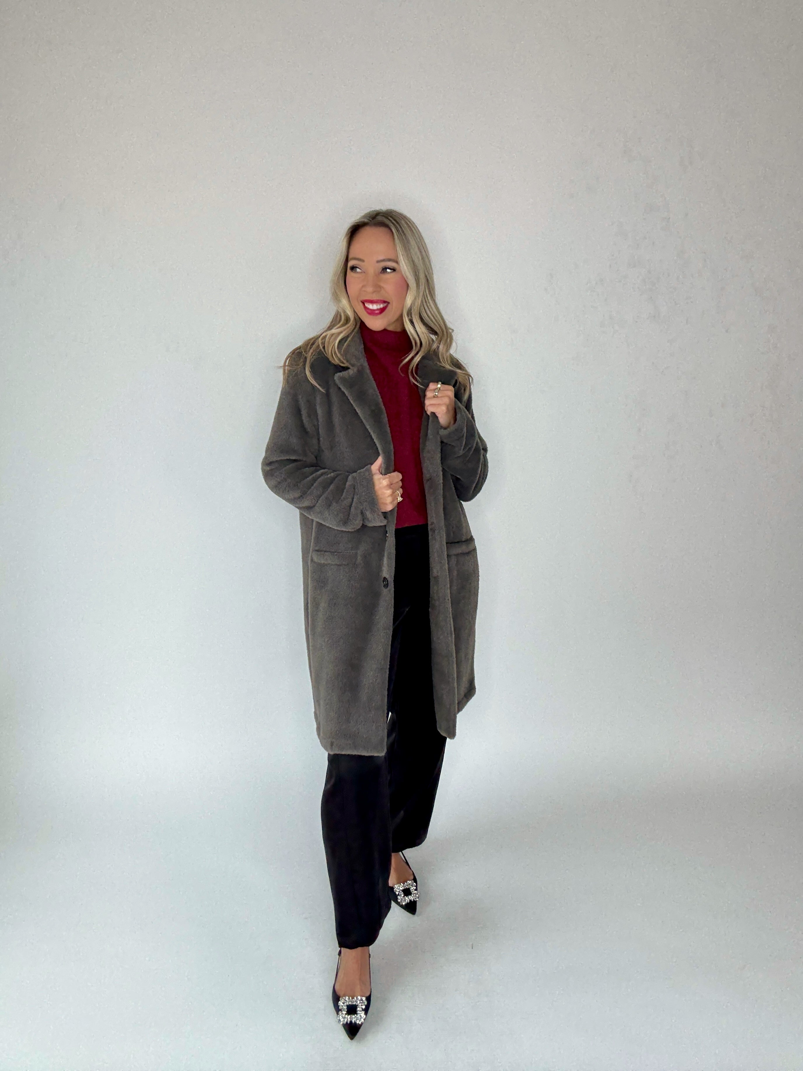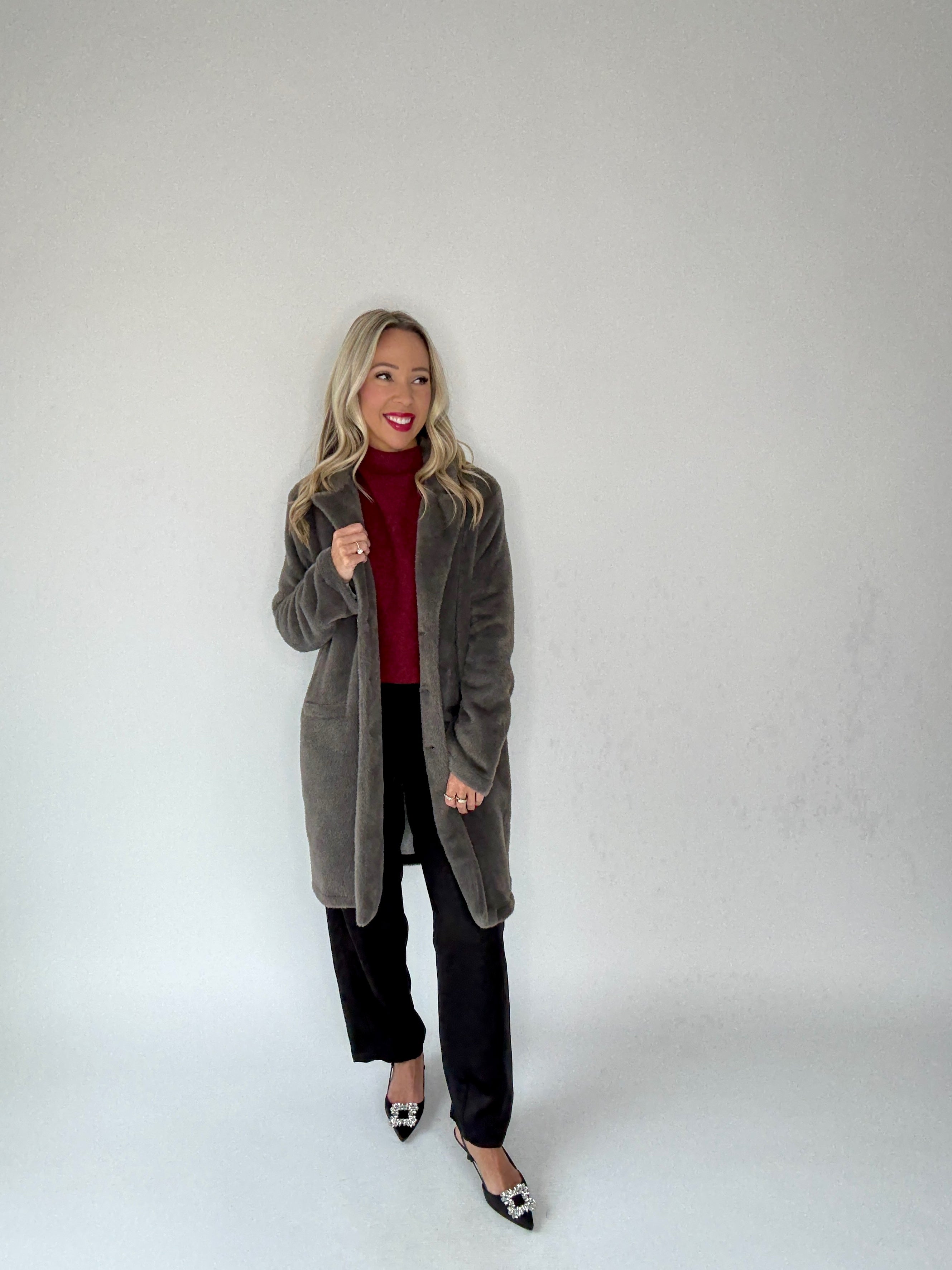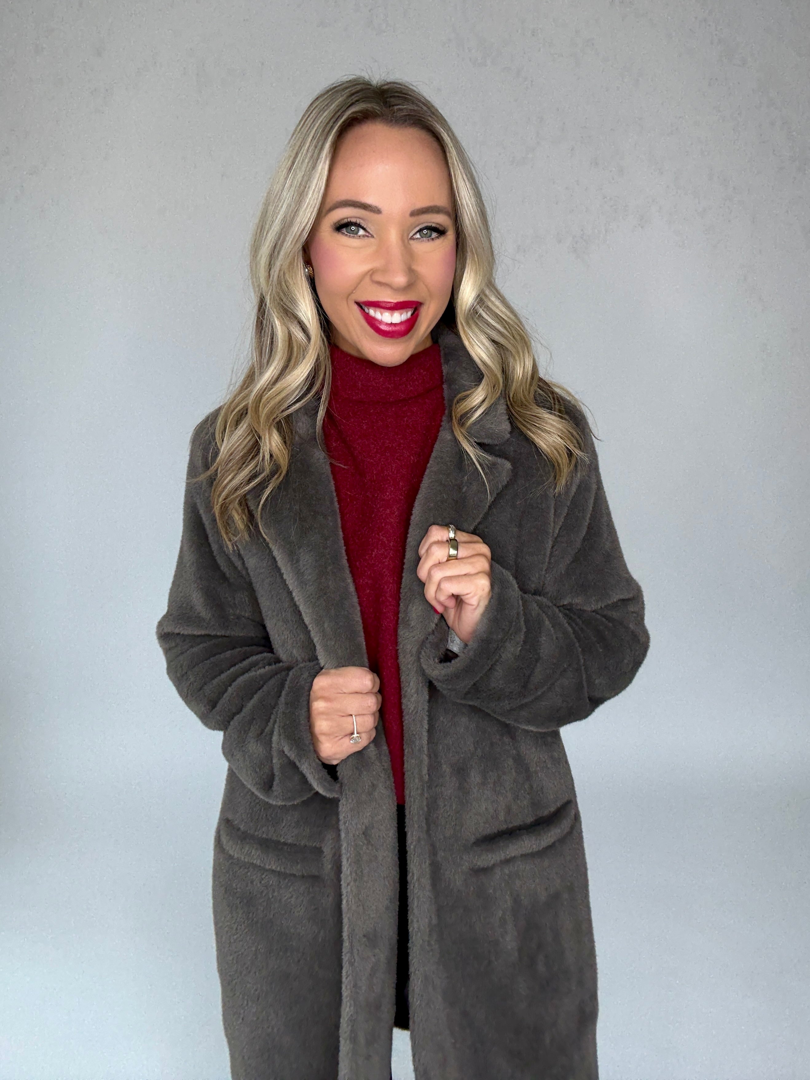 Wrap yourself in timeless elegance with the Hometown Jacket — a statement of warmth, luxury, and sophistication. Crafted from ultra-soft faux fur in a stunning burnt ink hue, this long coat exudes understated refinement. Designed with a classic collar, three-button front, and front pockets, it offers both style and comfort for the coldest days.