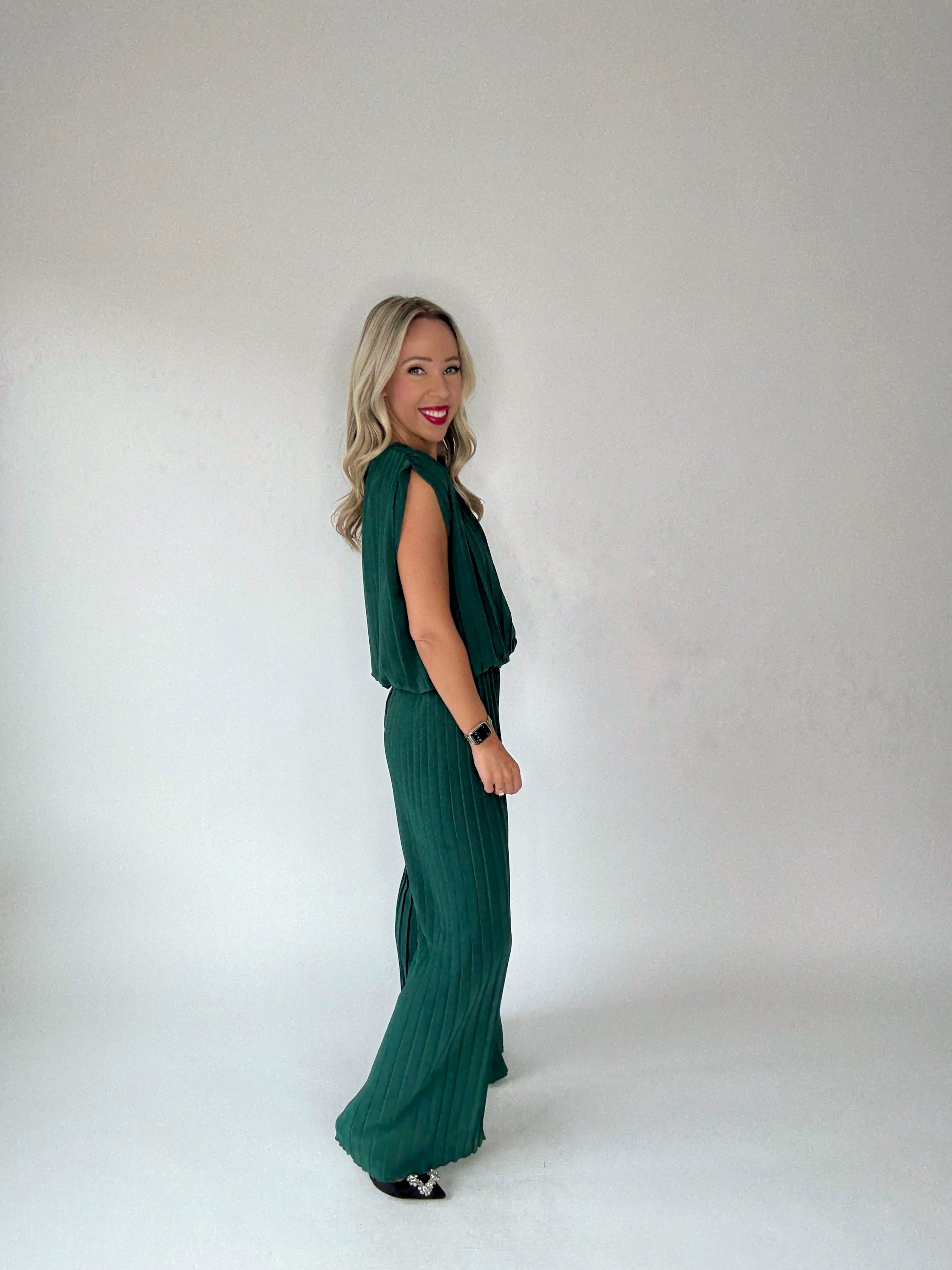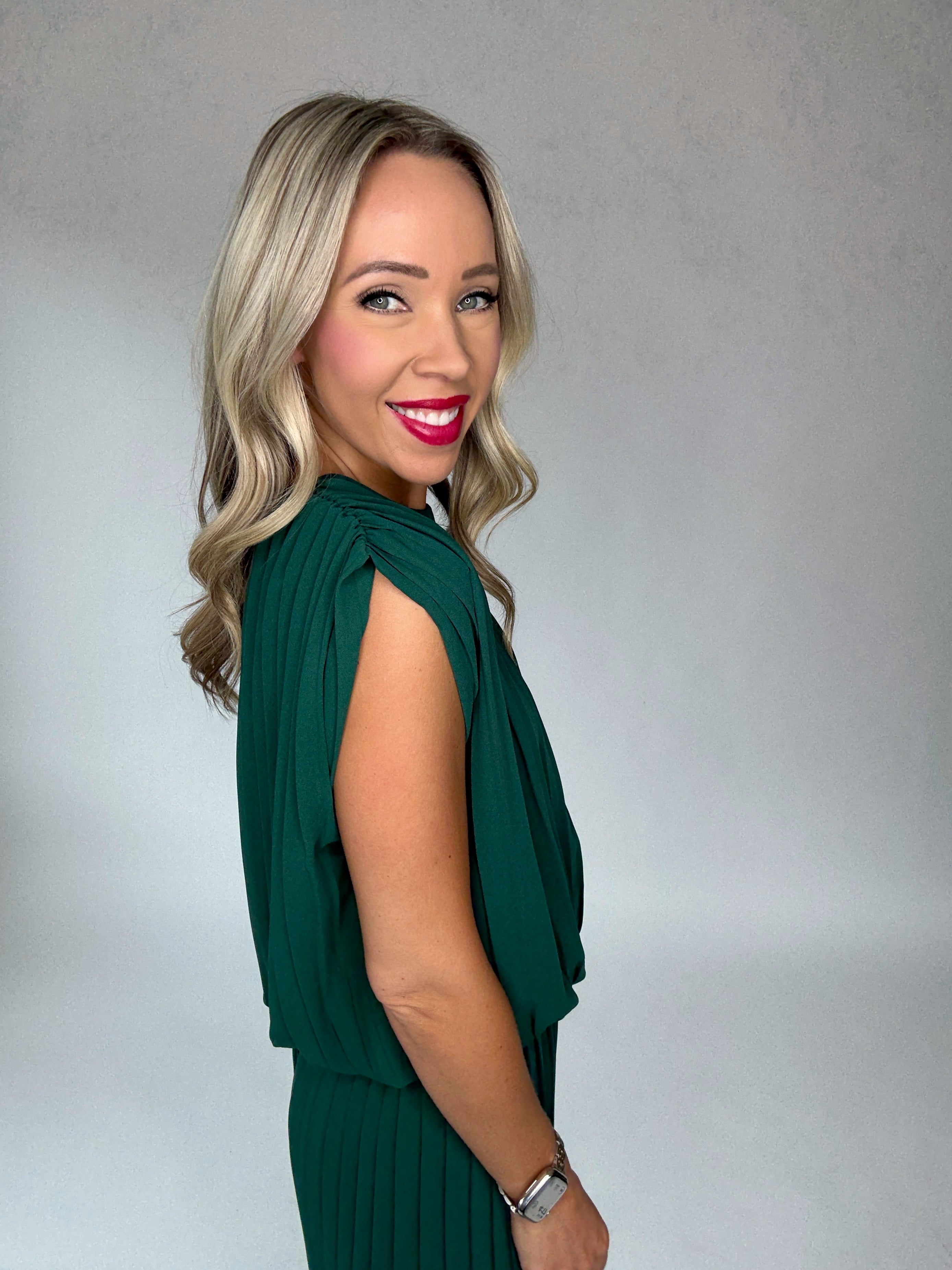 Elegant, refined, and perfectly festive — The Mistletoe Moments Top brings effortless sophistication to your holiday wardrobe. This sleeveless drop-shoulder top features delicate pleated detailing throughout, creating a graceful texture and elevated appeal. The elastic waist subtly cinches for a flattering, tailored silhouette, while the button-hook closure at the back of the neck adds a polished finishing touch.