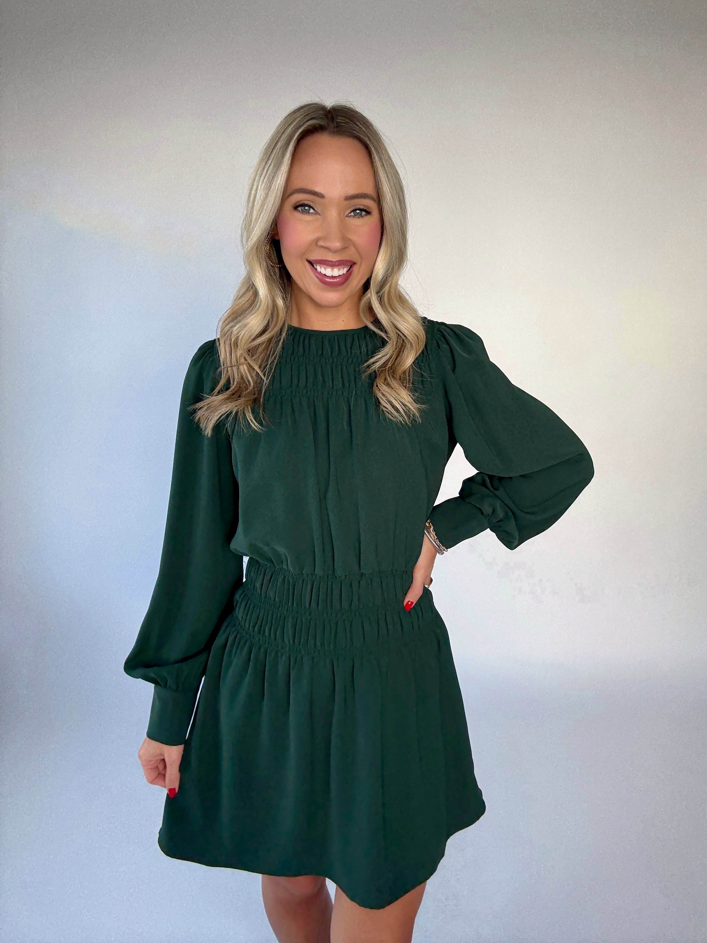 Elegant and effortlessly timeless, The Holly Dress captures the essence of sophisticated holiday style. Designed in a stunning evergreen hue, this shirred mini dress features long sleeves with delicate three-button closures at the wrist, subtle ruching at the shoulders, and a flattering elastic waist that defines your silhouette with ease. Fully lined for a smooth, comfortable fit, it’s finished with a refined two-button closure at the back of the neck for a polished touch.