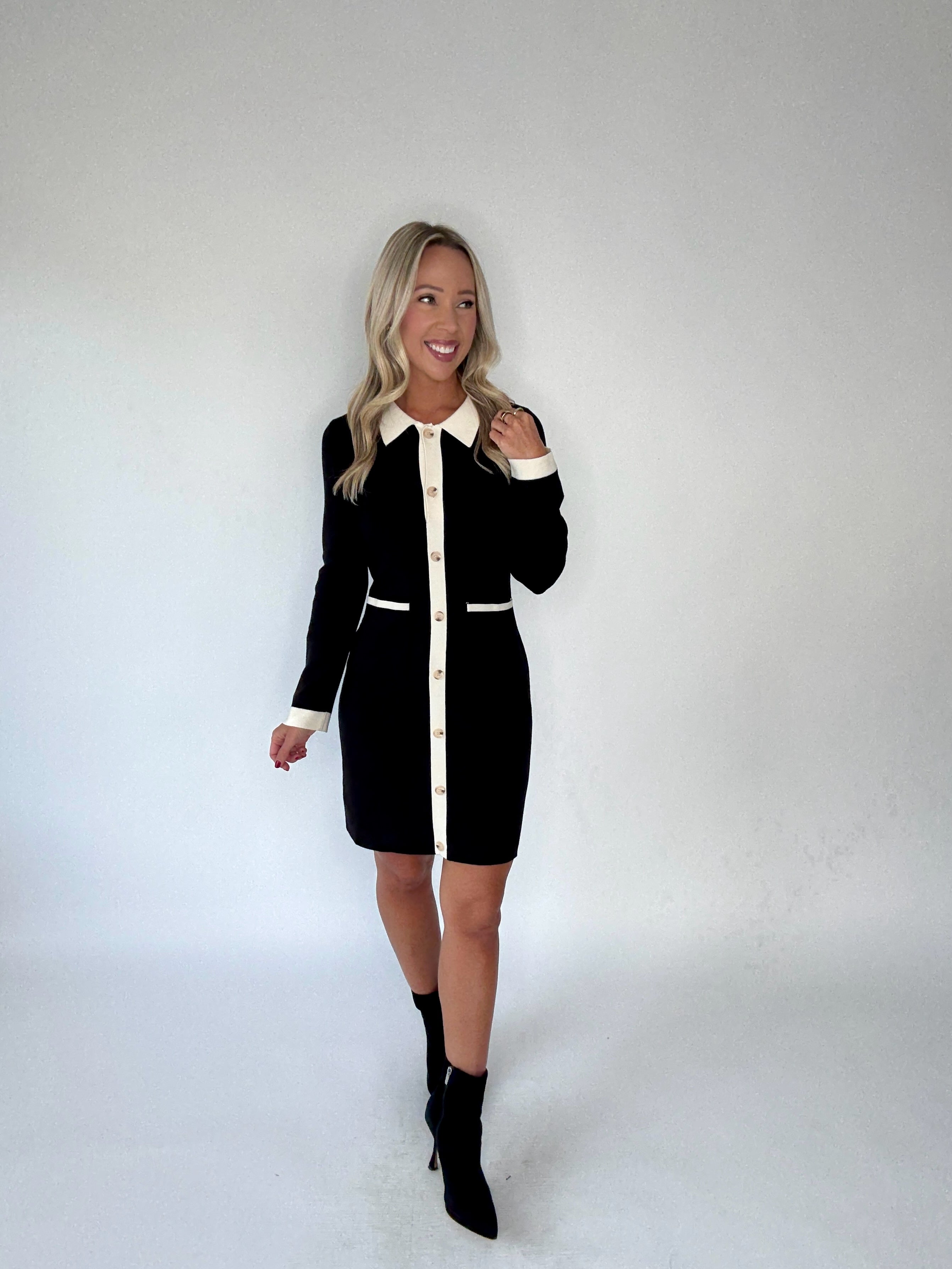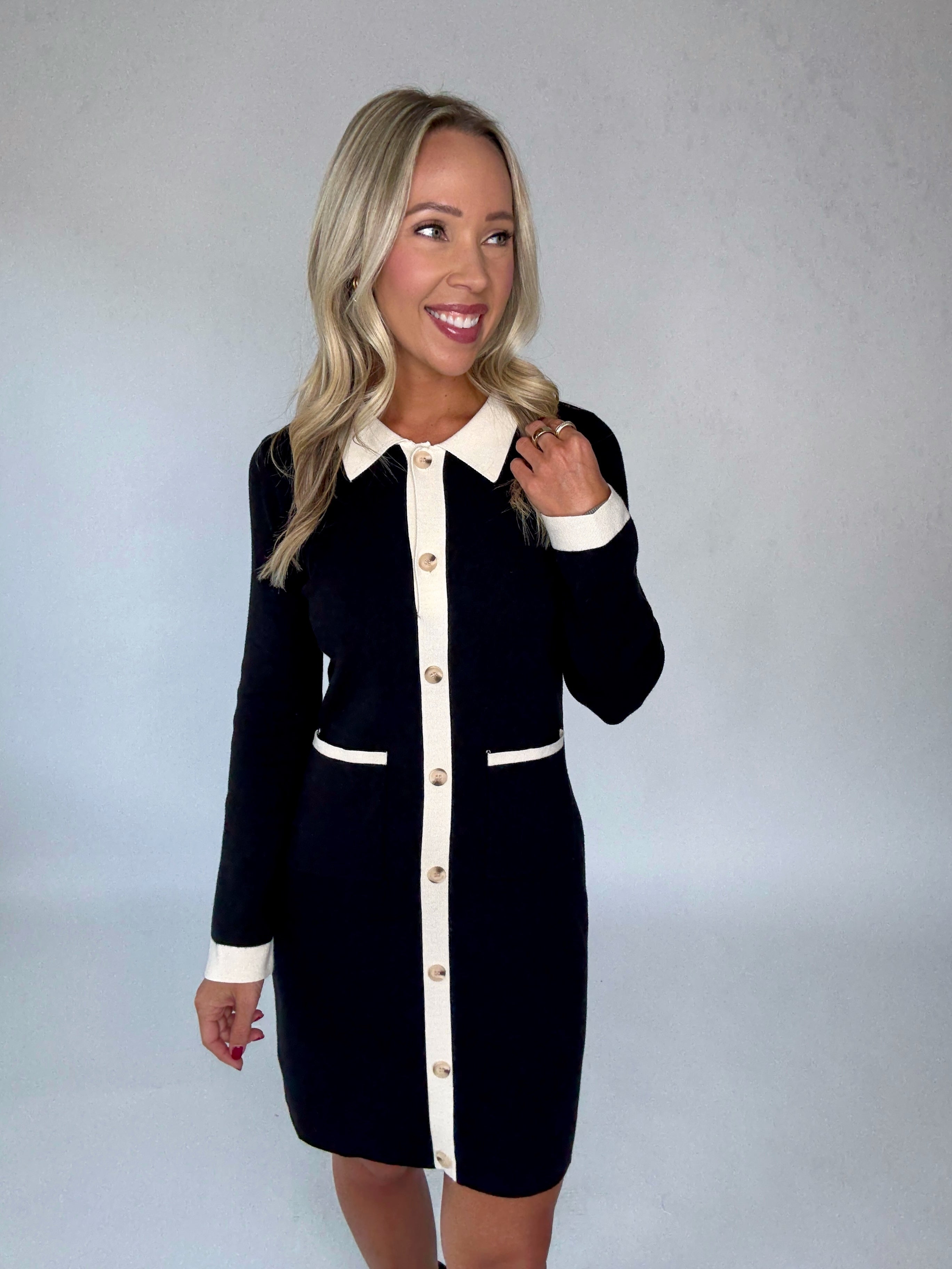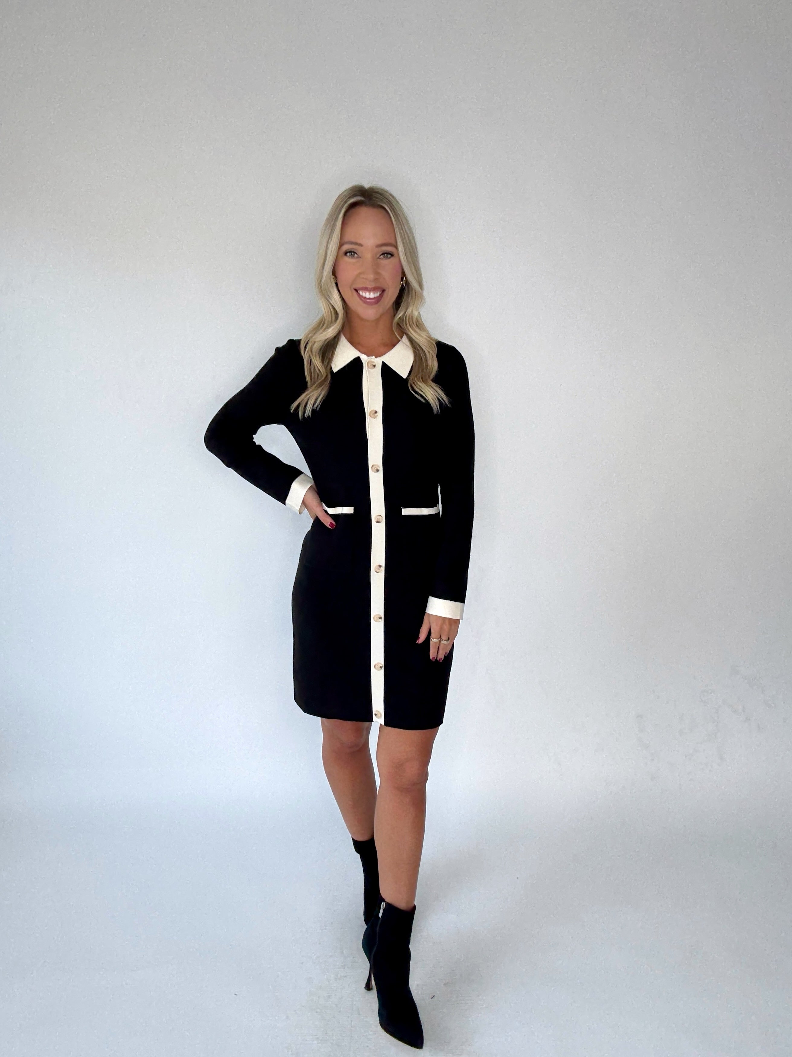 Elevate your fall wardrobe with the Modern Contrast Dress, a timeless piece with a contemporary twist. Crafted from a luxuriously soft knit, this long-sleeve button-down dress features striking black and cream contrasts, including a crisp cream collar and matching trim along the button placket. Two front pockets, finished with subtle cream detailing, add both style and practicality.