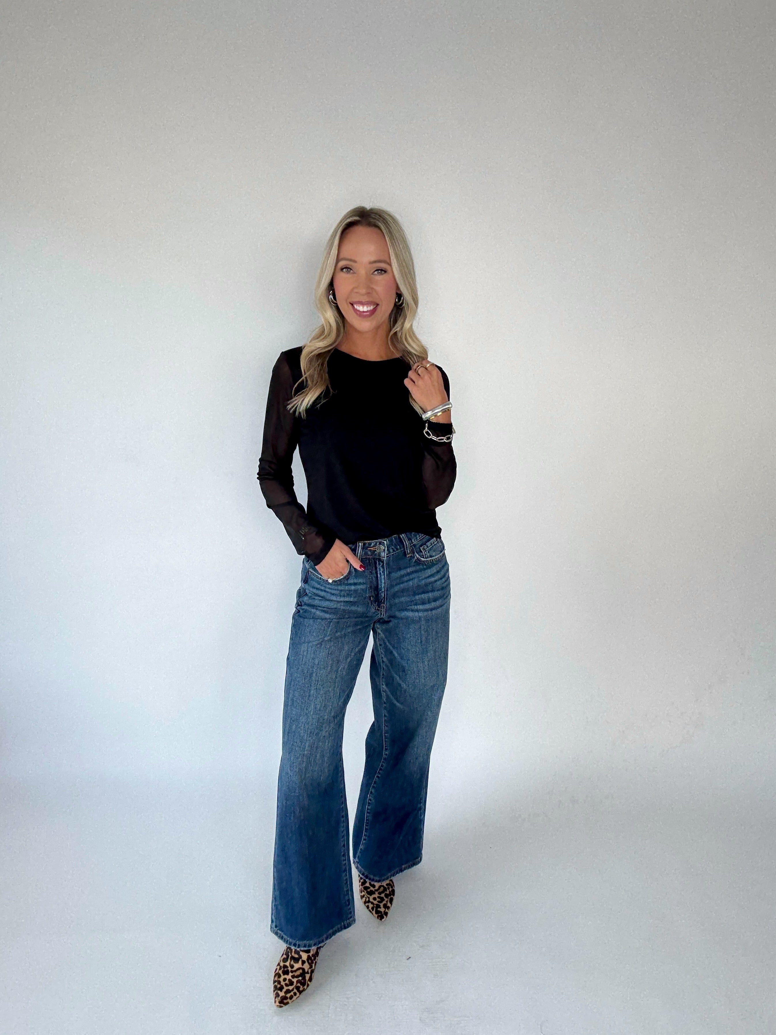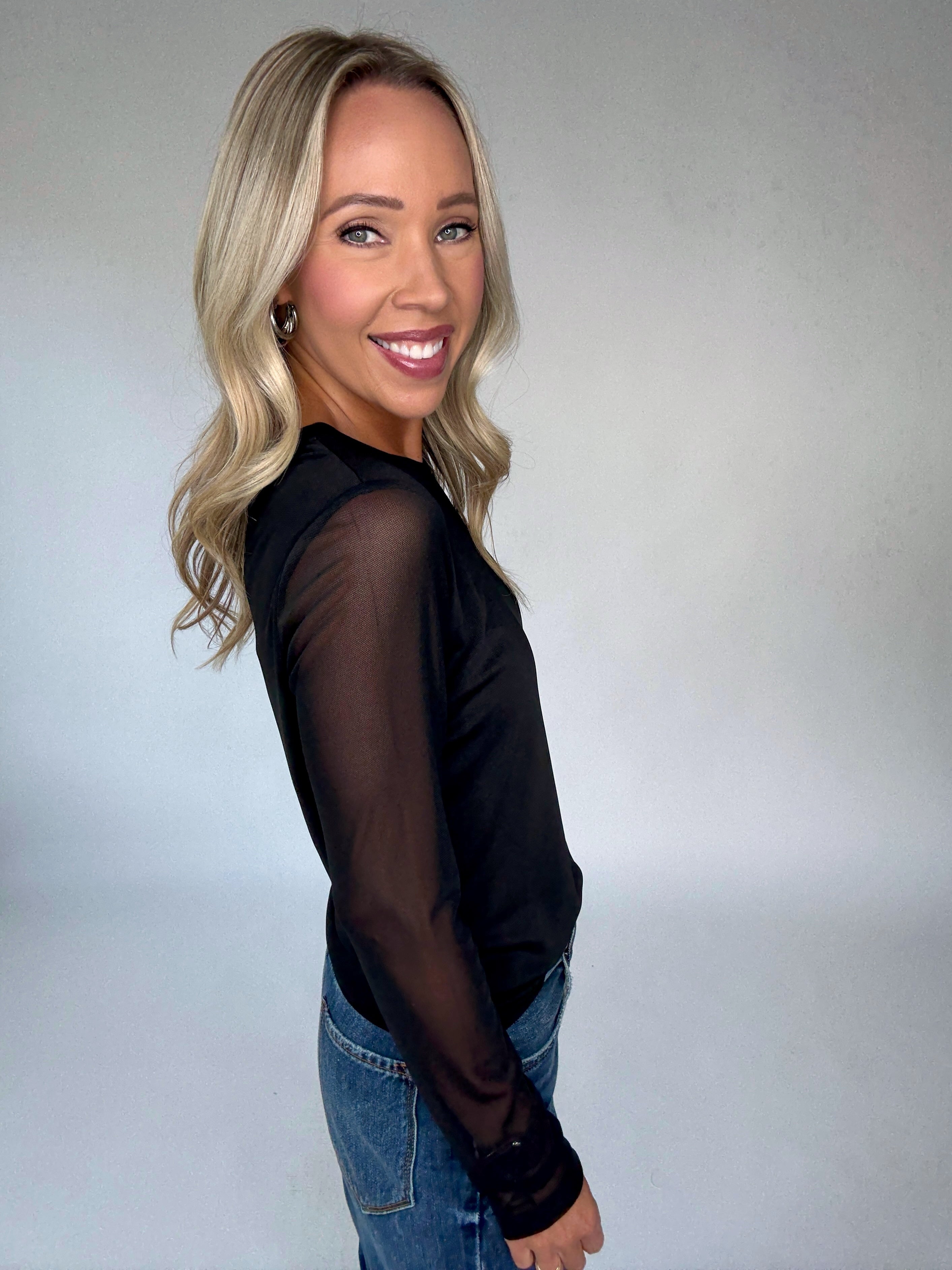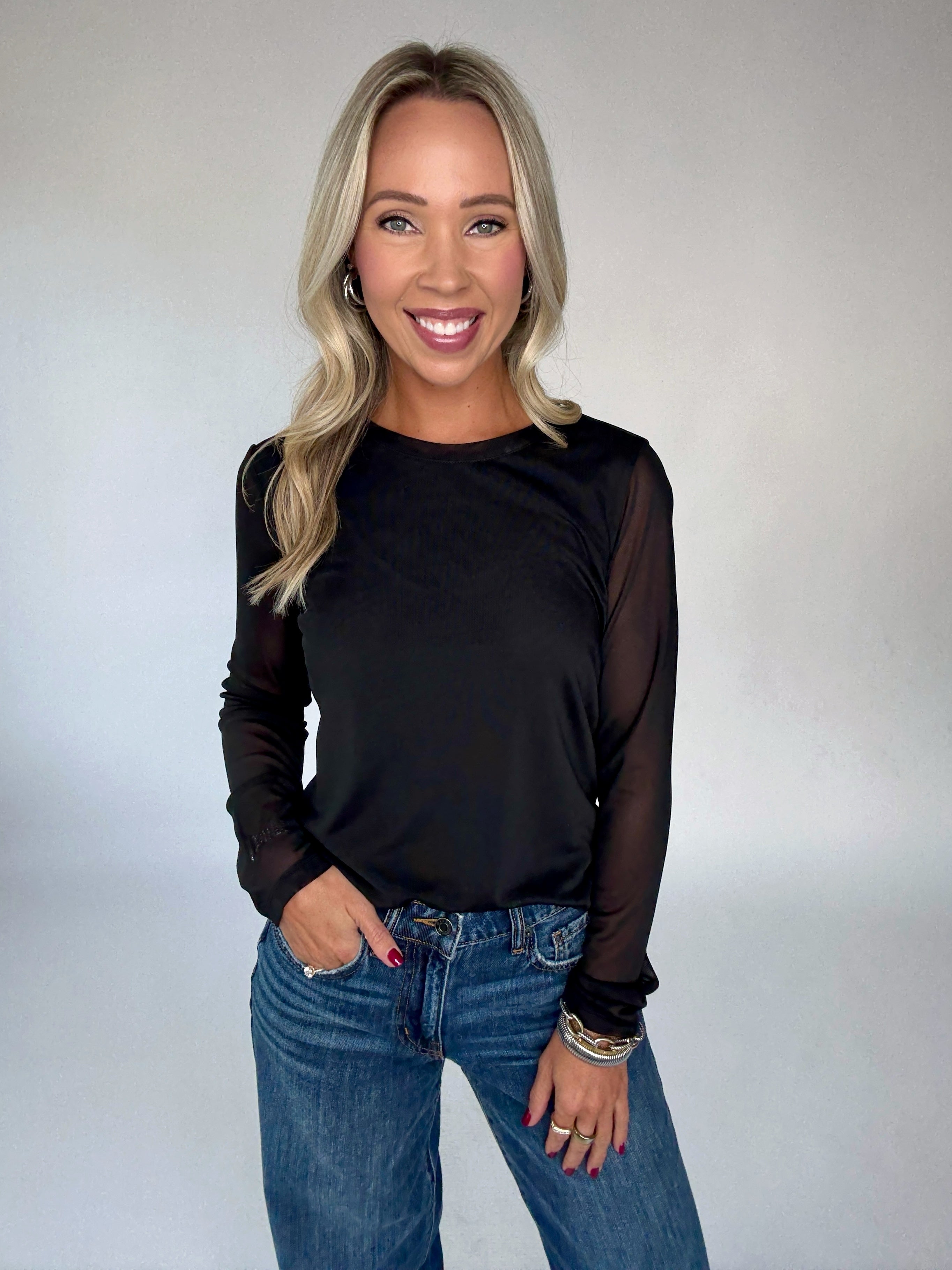 Effortless elegance meets modern style in the Sanctuary Perfect Mesh Tee. This black long-sleeve top features a silky-soft lining beneath the body for comfort and coverage, while leaving the arms in delicate sheer mesh for a subtle, sophisticated edge. Designed with a classic round neckline, the lining is seamlessly attached at the shoulders and armholes for a polished, refined finish.