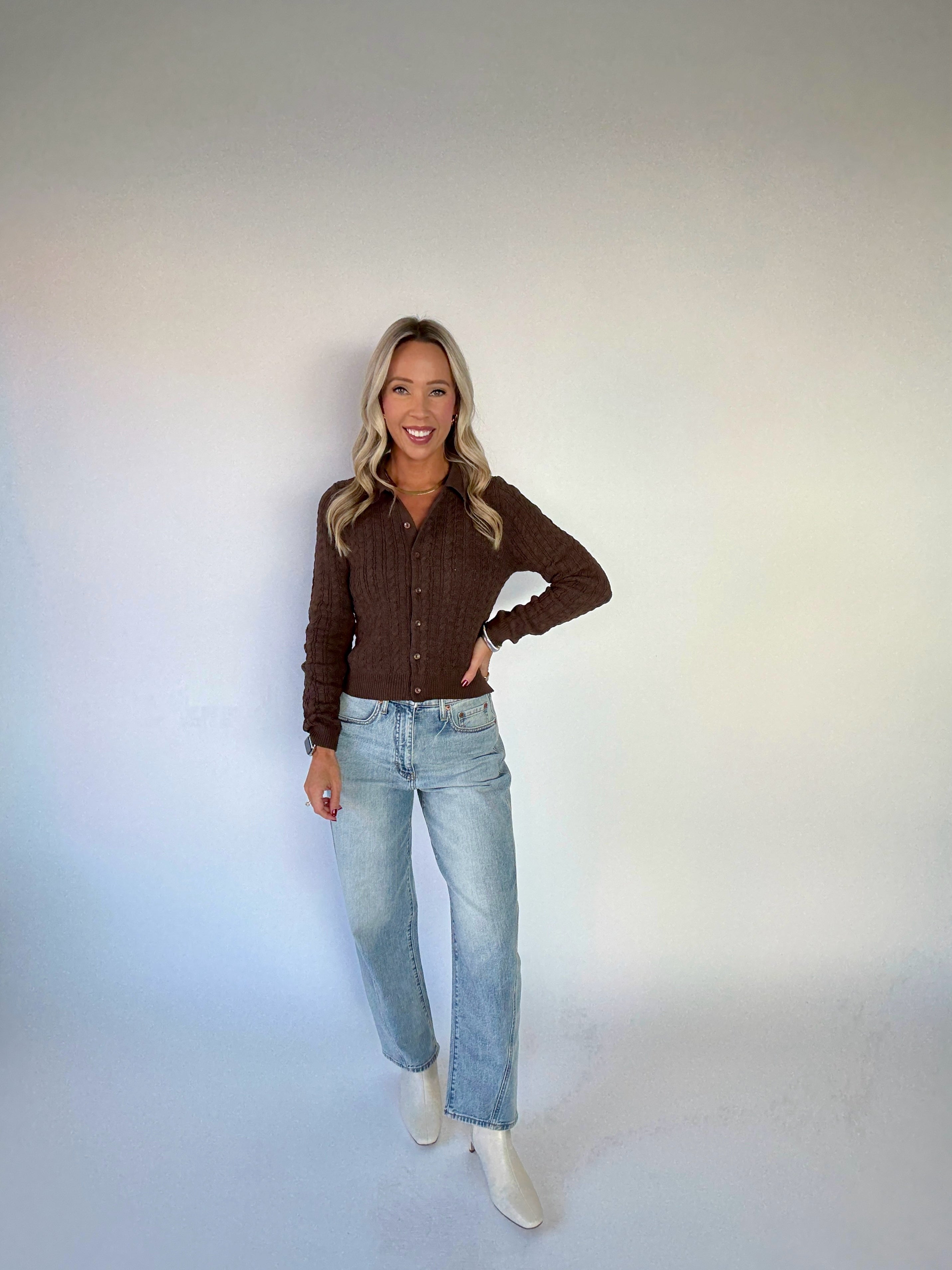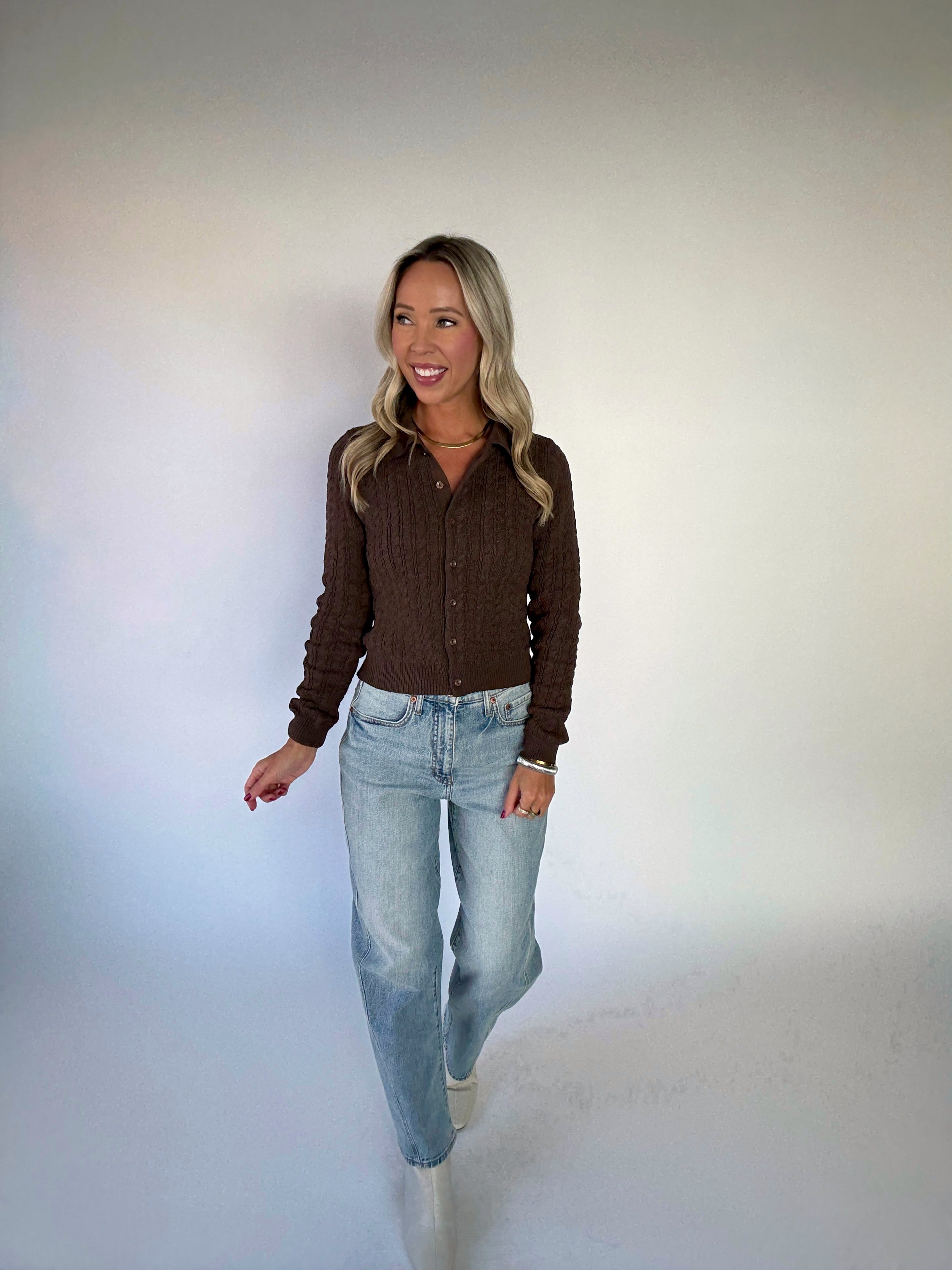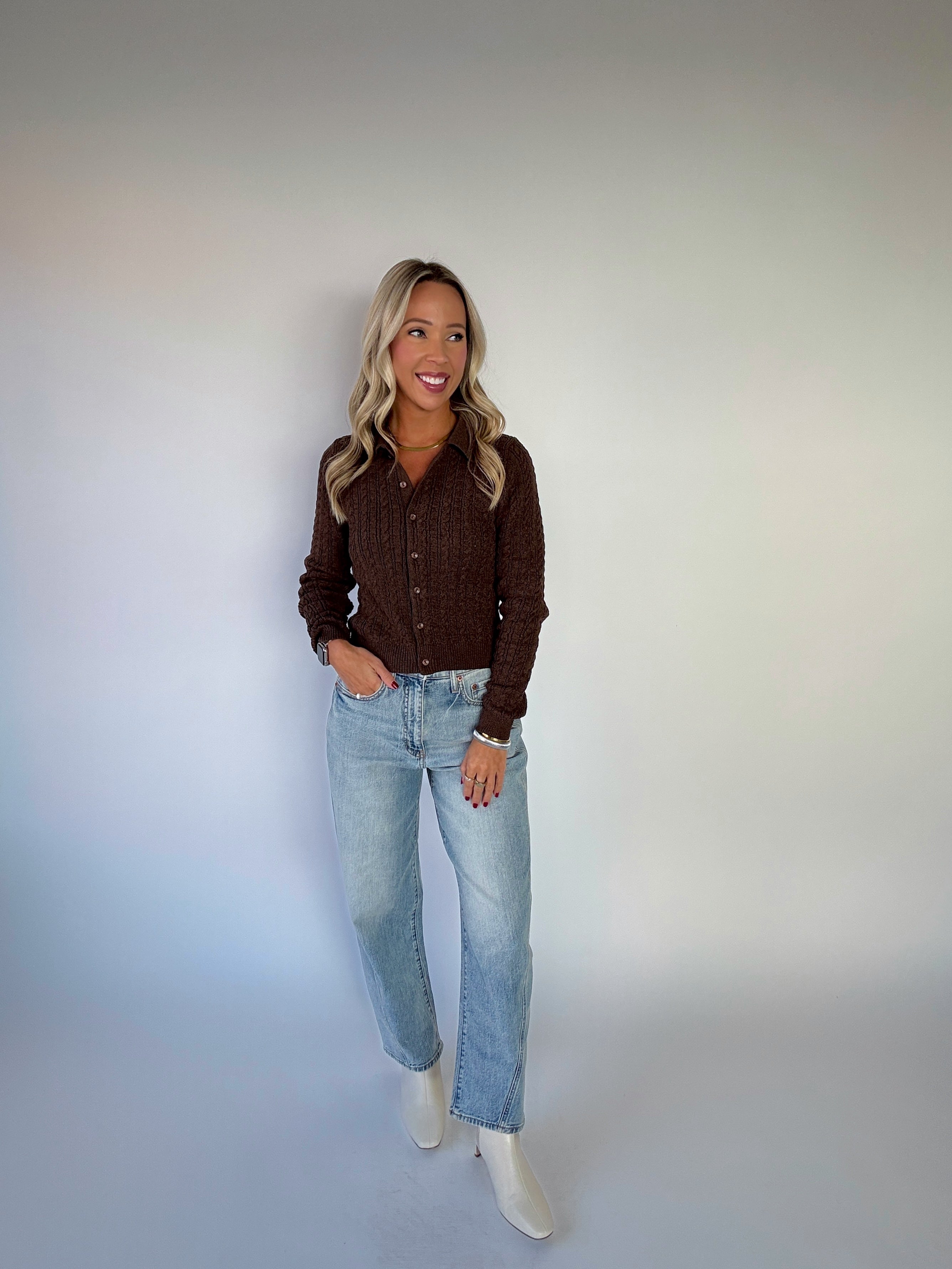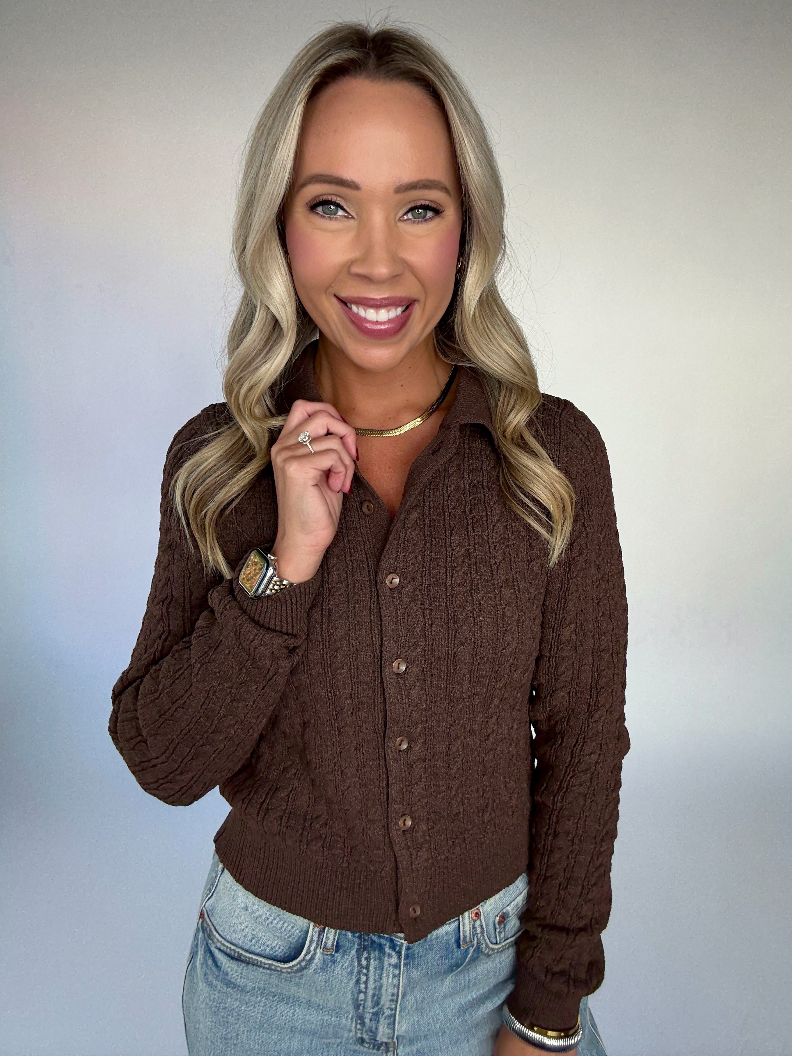 Refined yet versatile, the Gather Round Cardigan brings timeless charm to your wardrobe. Crafted in a classic cable knit with a collared neckline, this tailored design features matching buttons down the front and a flattering waist-length fit. Its polished silhouette makes it the perfect layer for both work and leisure—wear it over a tank for an effortless look, button it up for a more structured style, or pair it with denim and trousers alike.