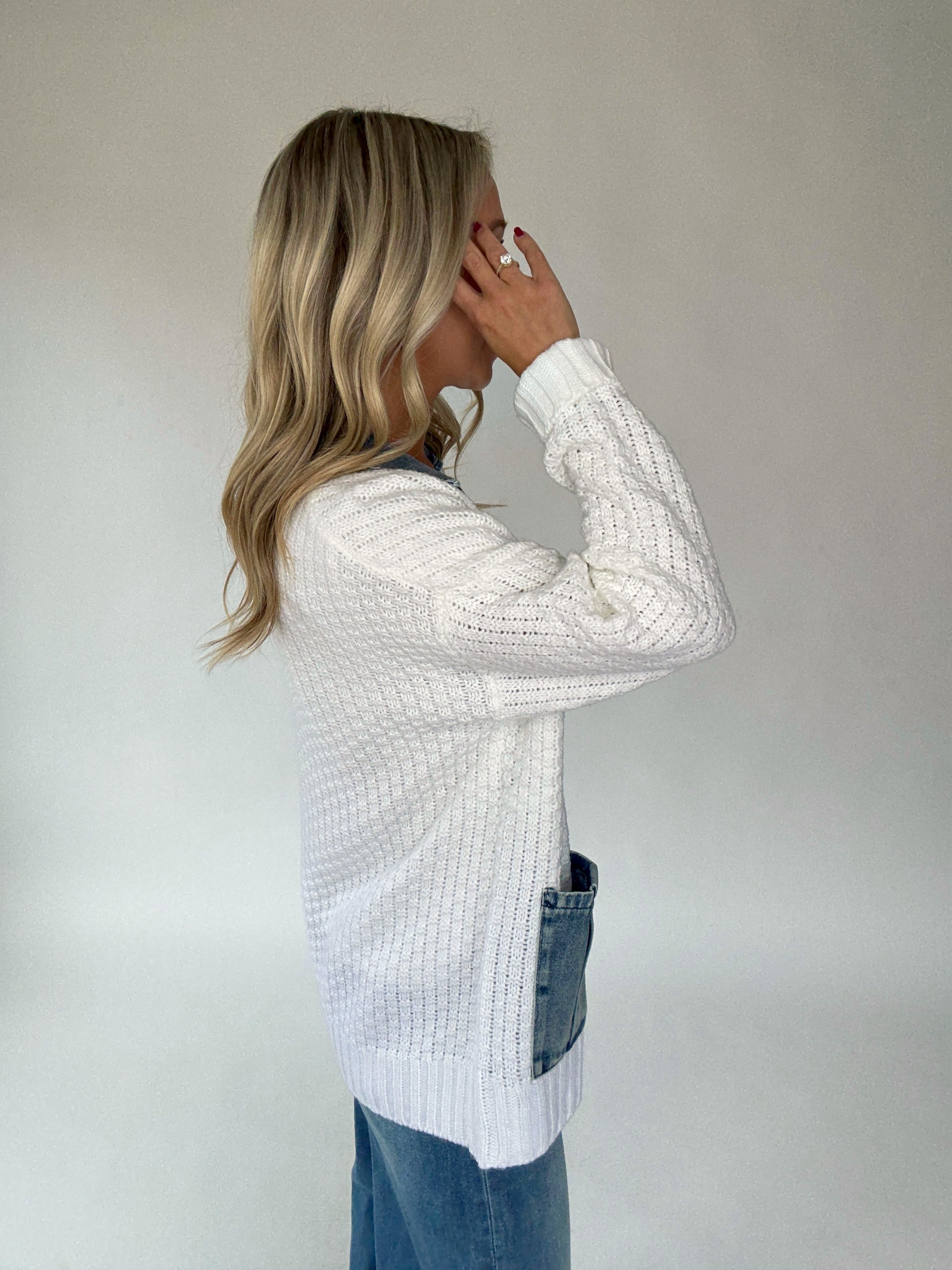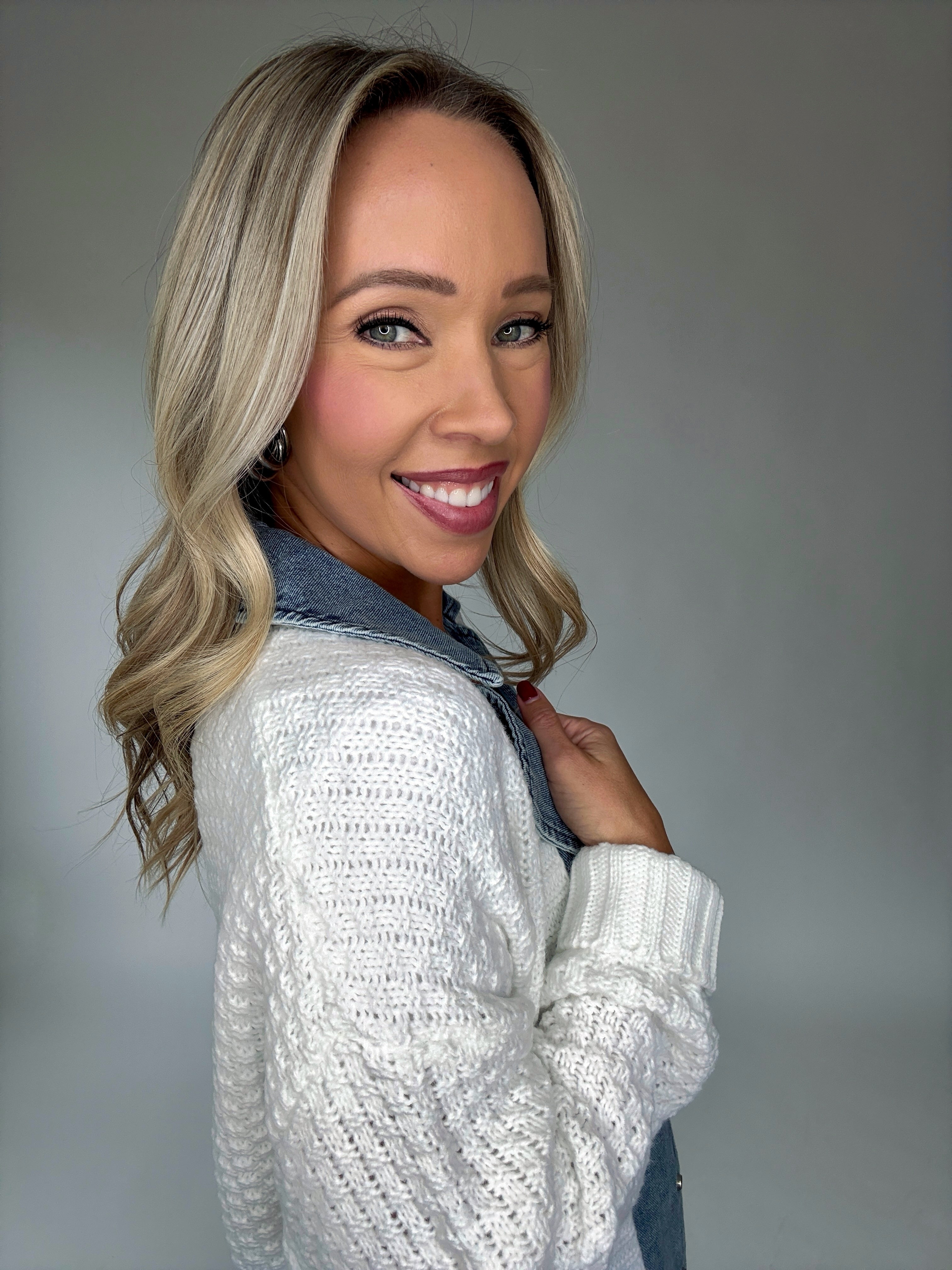 A timeless layer with a modern twist, the Denim Blend Cardigan combines classic knitwear with elevated denim accents. Crafted in a soft white knit, this button-front sweater features a crisp denim collar, coordinating front placket, and functional denim pockets finished with silver buttons for subtle shine. The tailored yet relaxed silhouette makes it easy to style—wear it open over a favorite tee for casual errands or buttoned for a polished, transitional look.