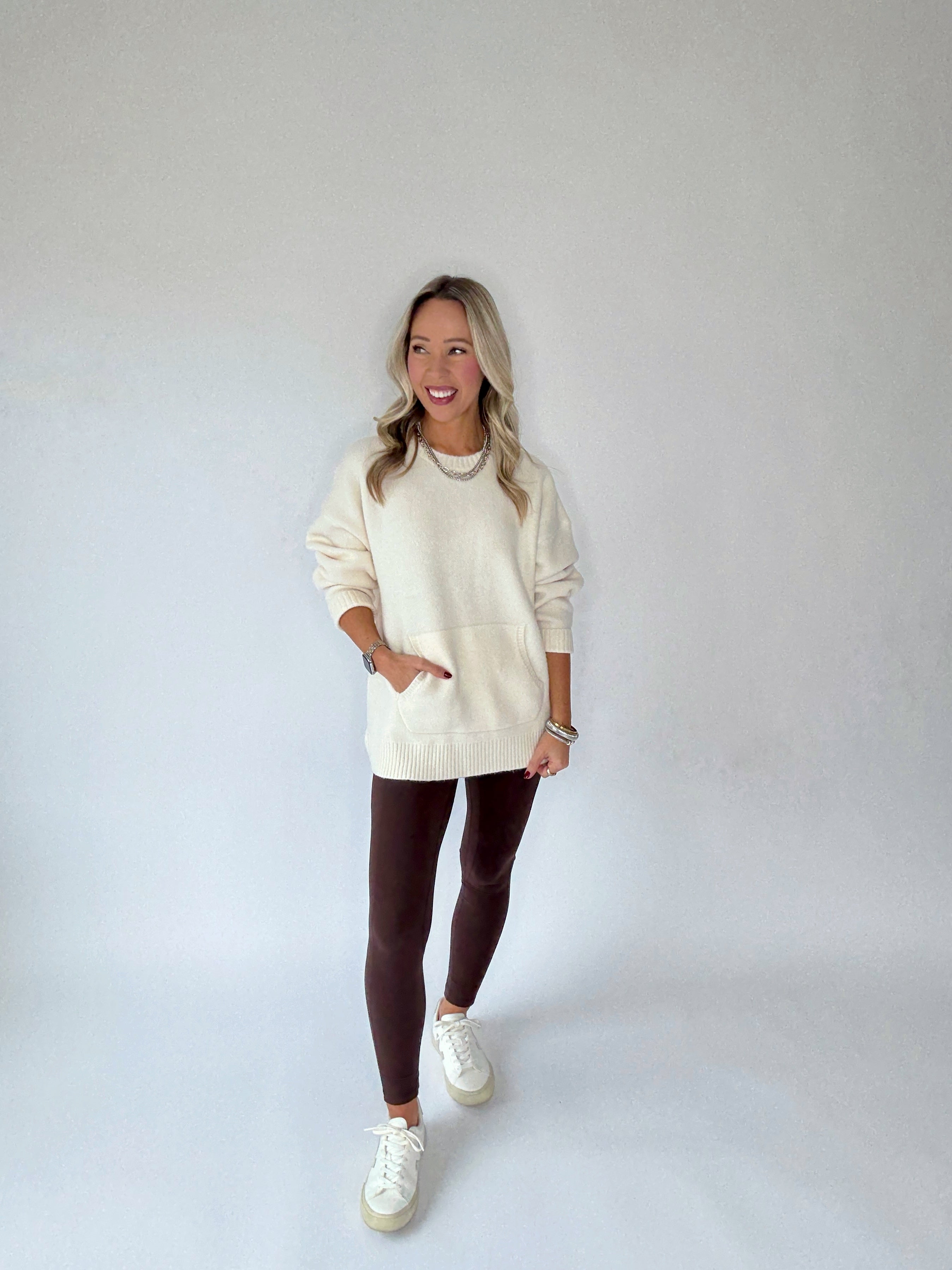 Crafted from a super soft, thicker knit with just the right amount of stretch, it provides warmth without bulk, making it ideal for transitioning from fall into winter. Thoughtful ribbing at the neckline, waist, and wrists adds a touch of structure, while the generously sized front pocket brings both style and functionality.