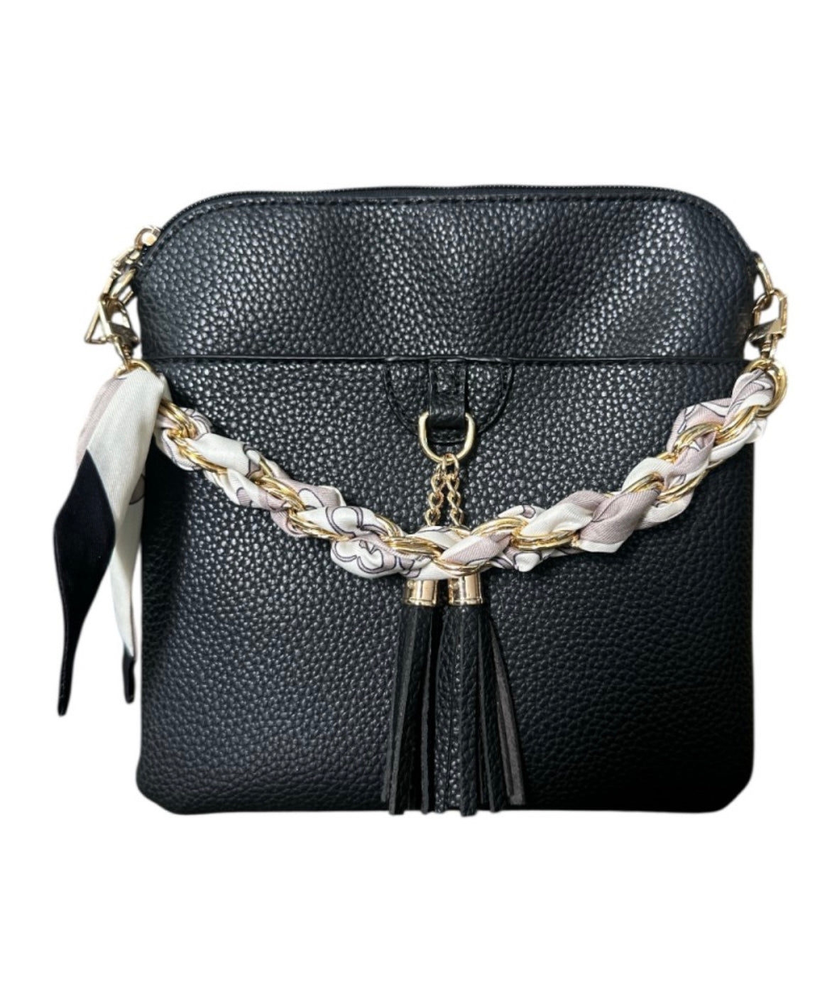 Featuring a bold scarf pattern detail, accented with gleaming gold clasps and hardware, it brings effortless elegance to even the simplest look. Functional yet refined, this accessory offers a polished way to carry your phone while doubling as a statement charm. Perfect for busy days, nights out, or whenever style and convenience go hand in hand.