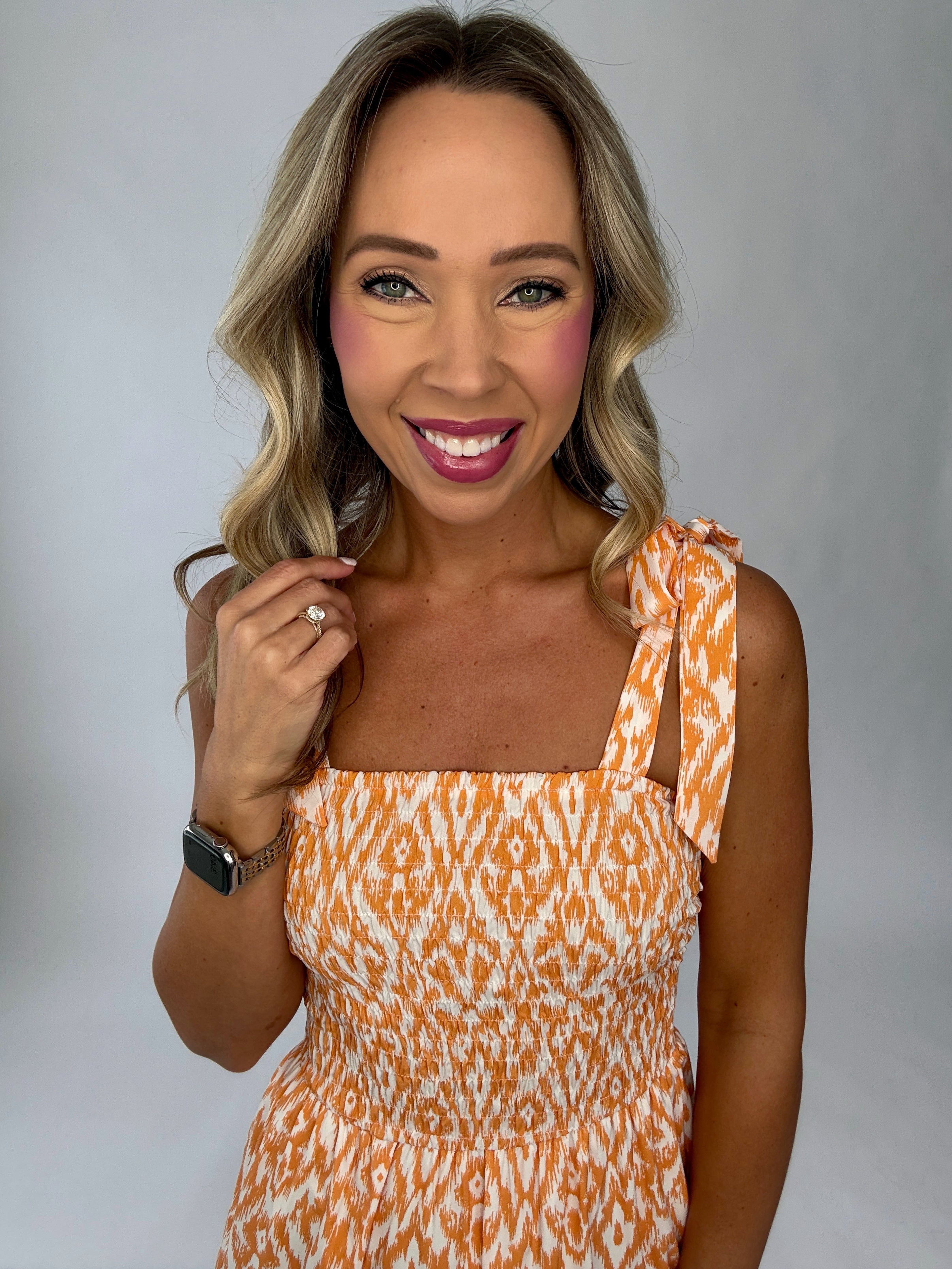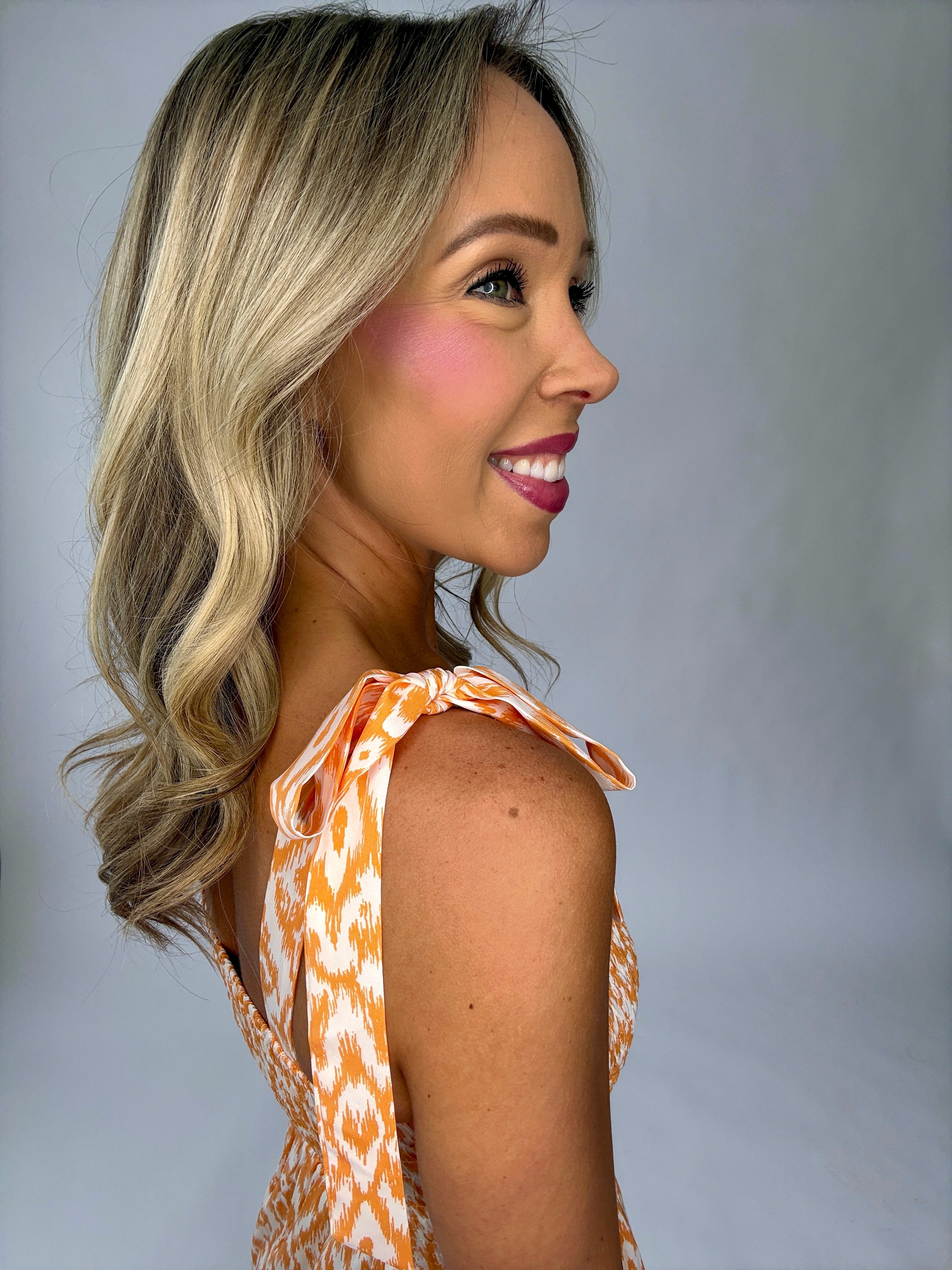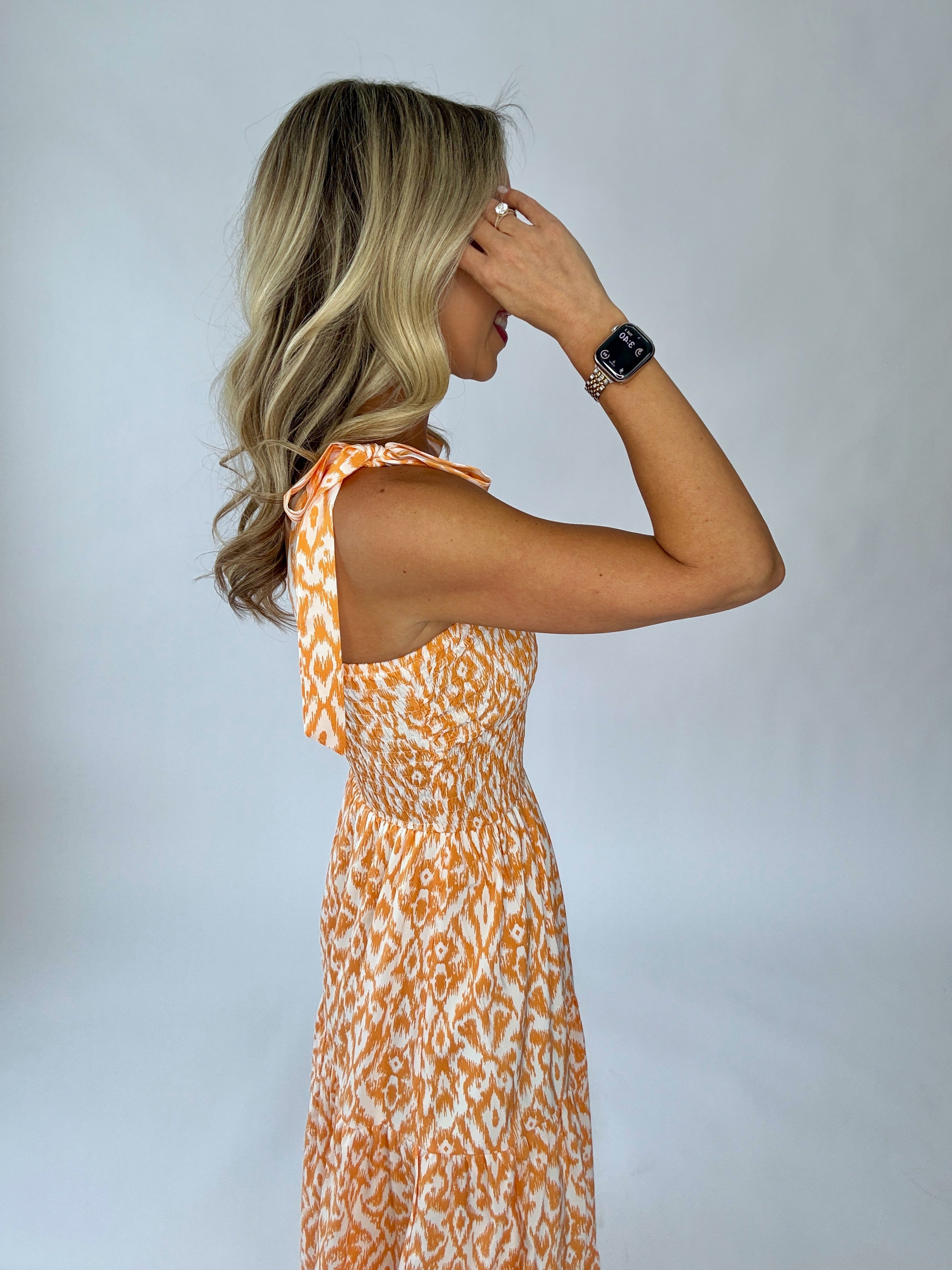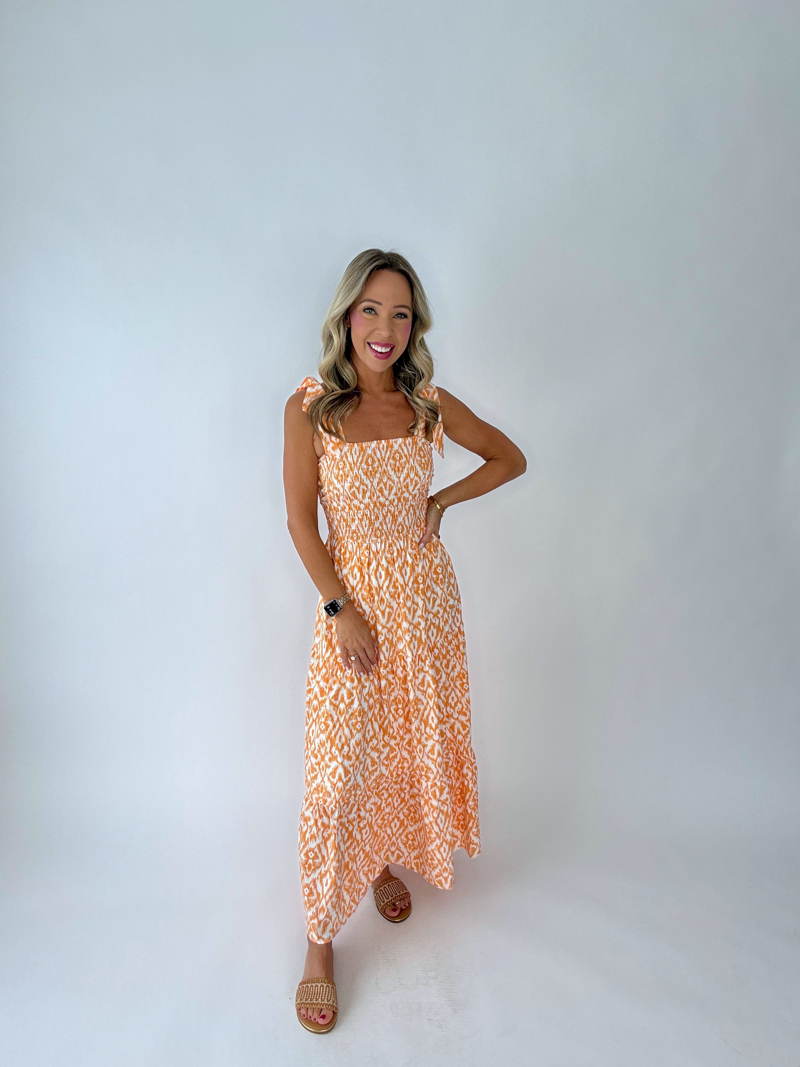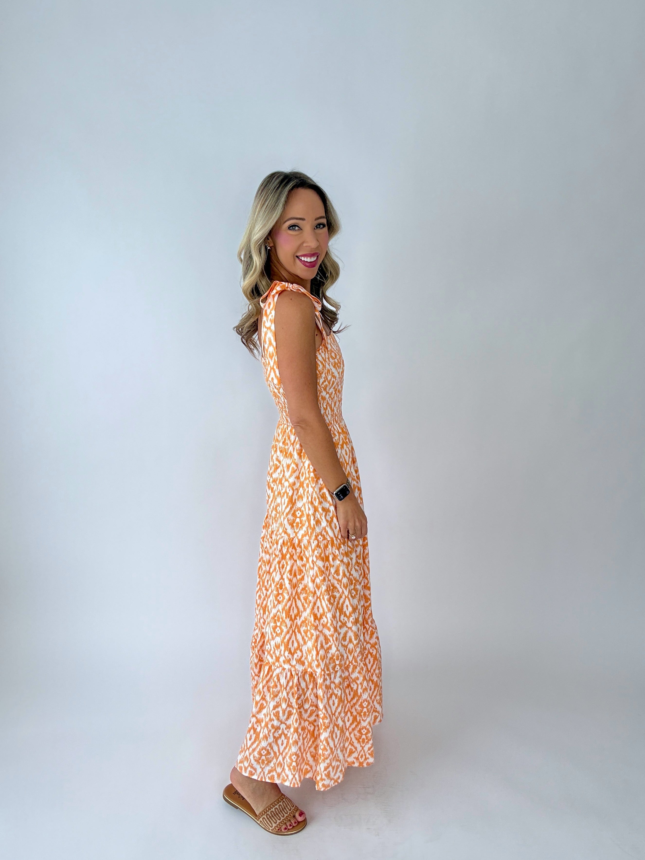 The All Eyes On You Tiered Maxi Dress is designed to make a statement with effortless elegance. Rendered in a beautiful tangerine and white palette, this dress brings a fresh, radiant charm to warm-weather dressing.