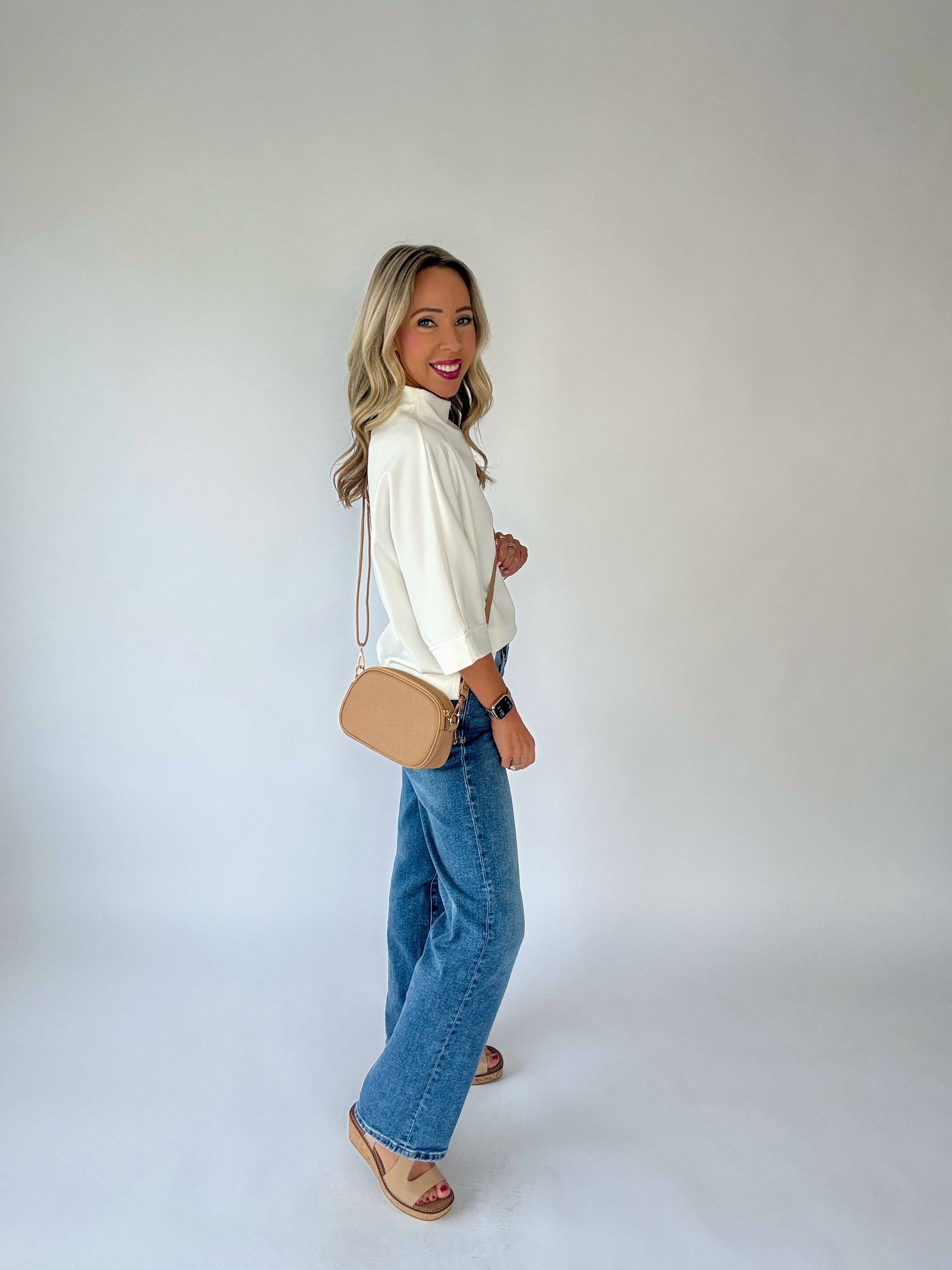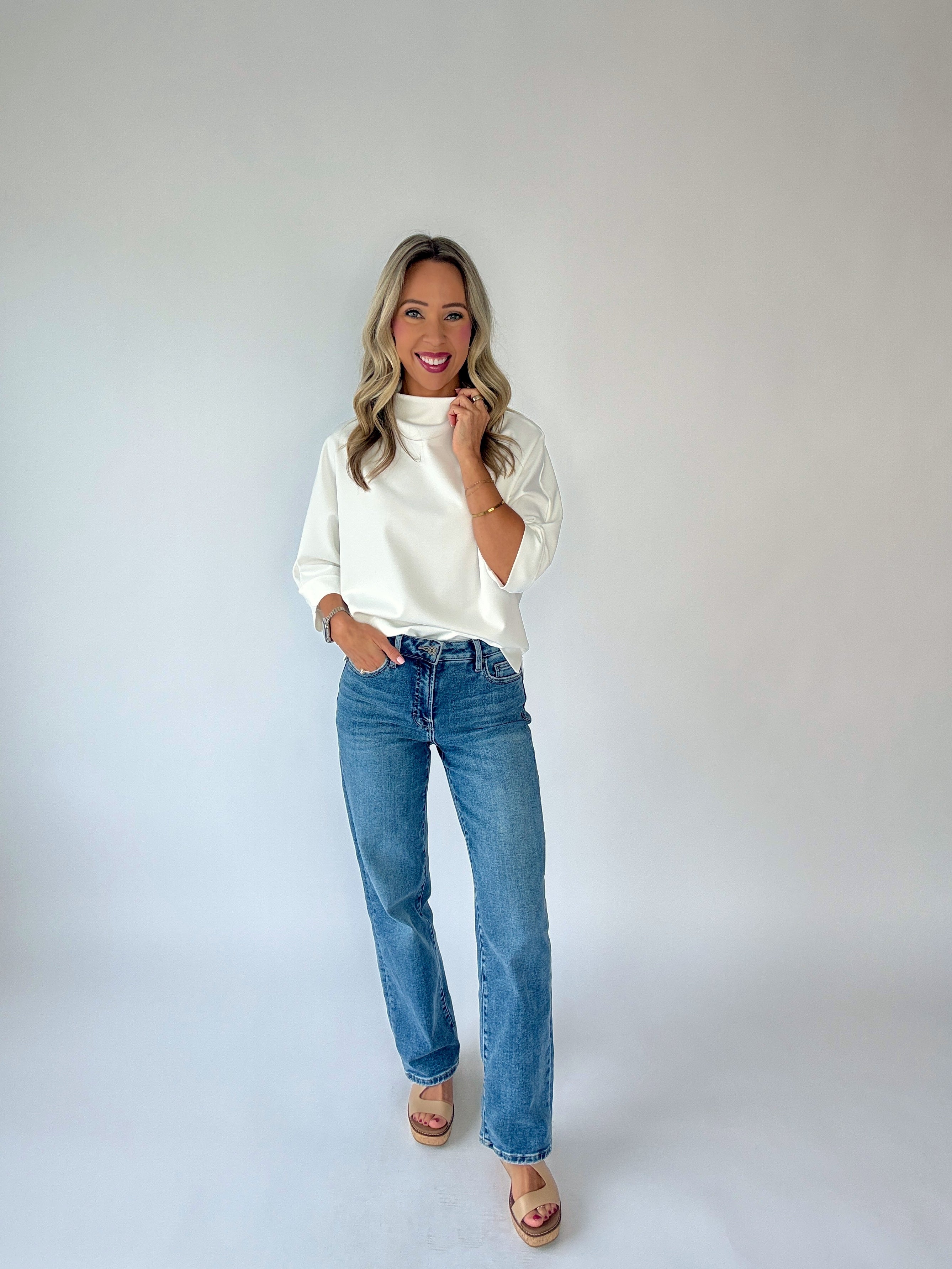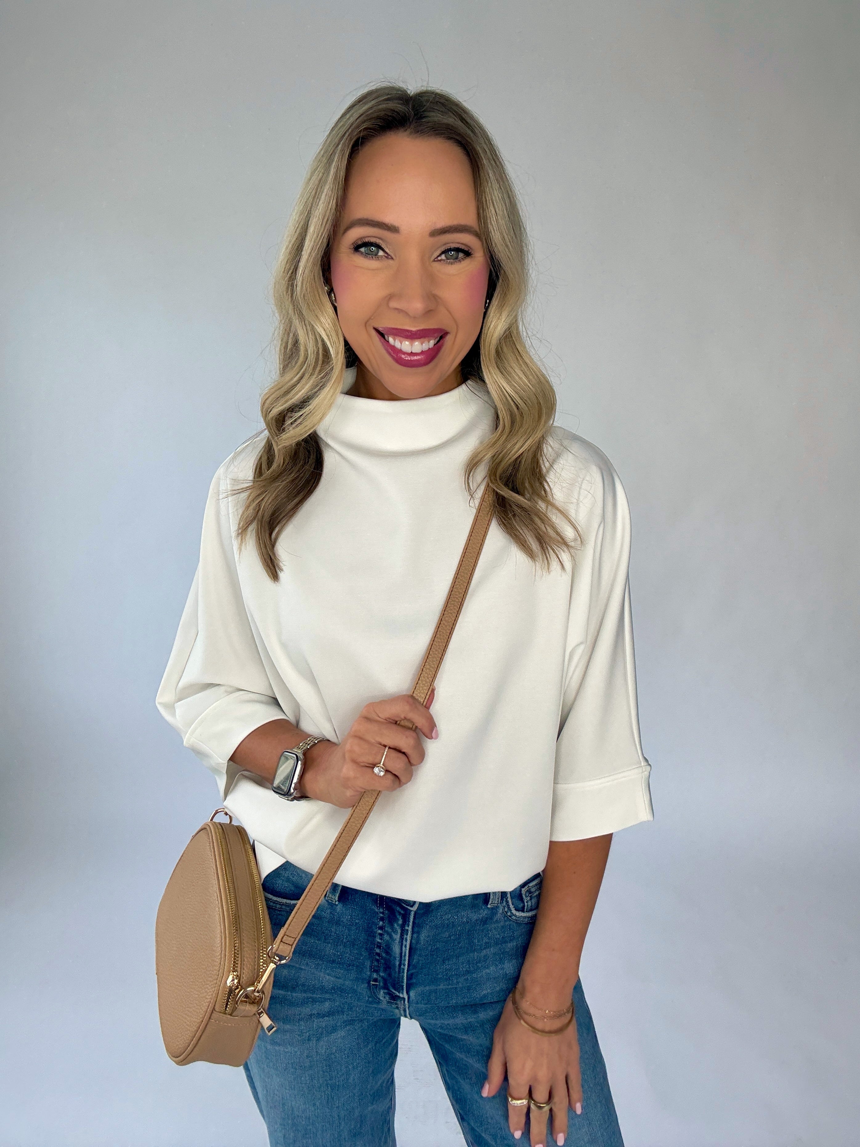 The Afternoon Plans Mock Neck Top is a refined blend of structure and softness, designed for effortless sophistication. Featuring a high mock neckline and relaxed dolman sleeves, this half-sleeve silhouette offers a modern yet timeless profile that drapes beautifully on the body.