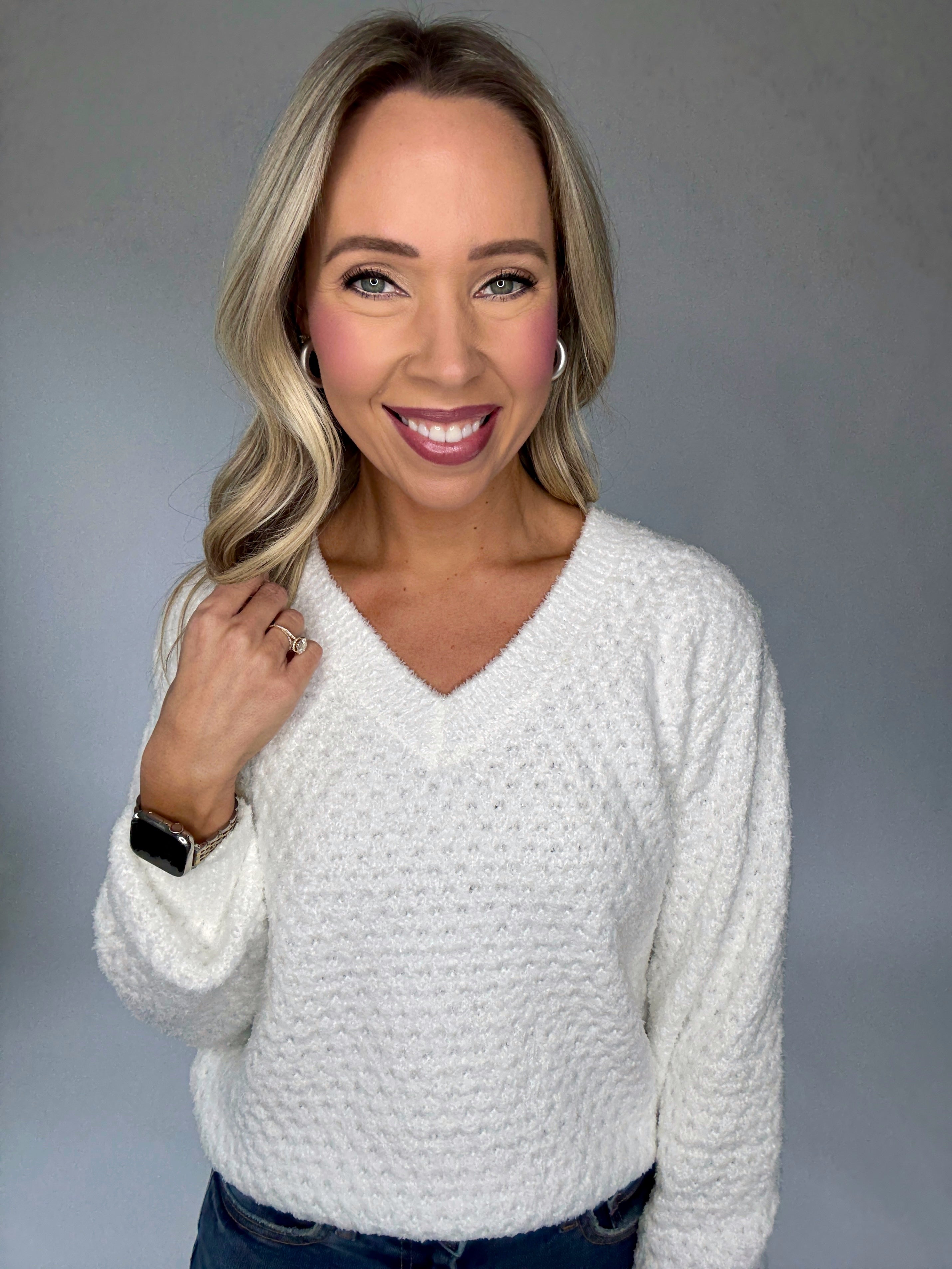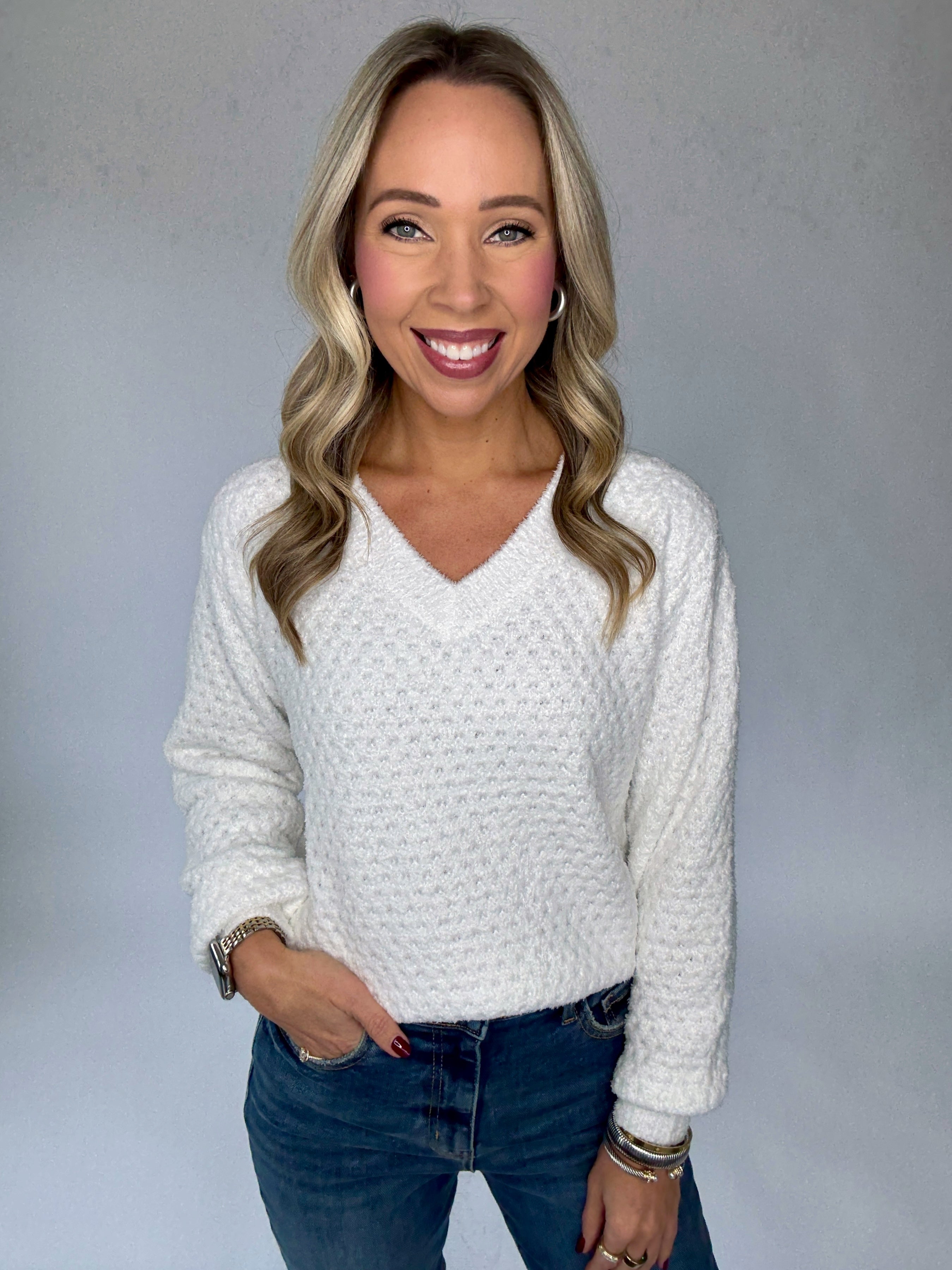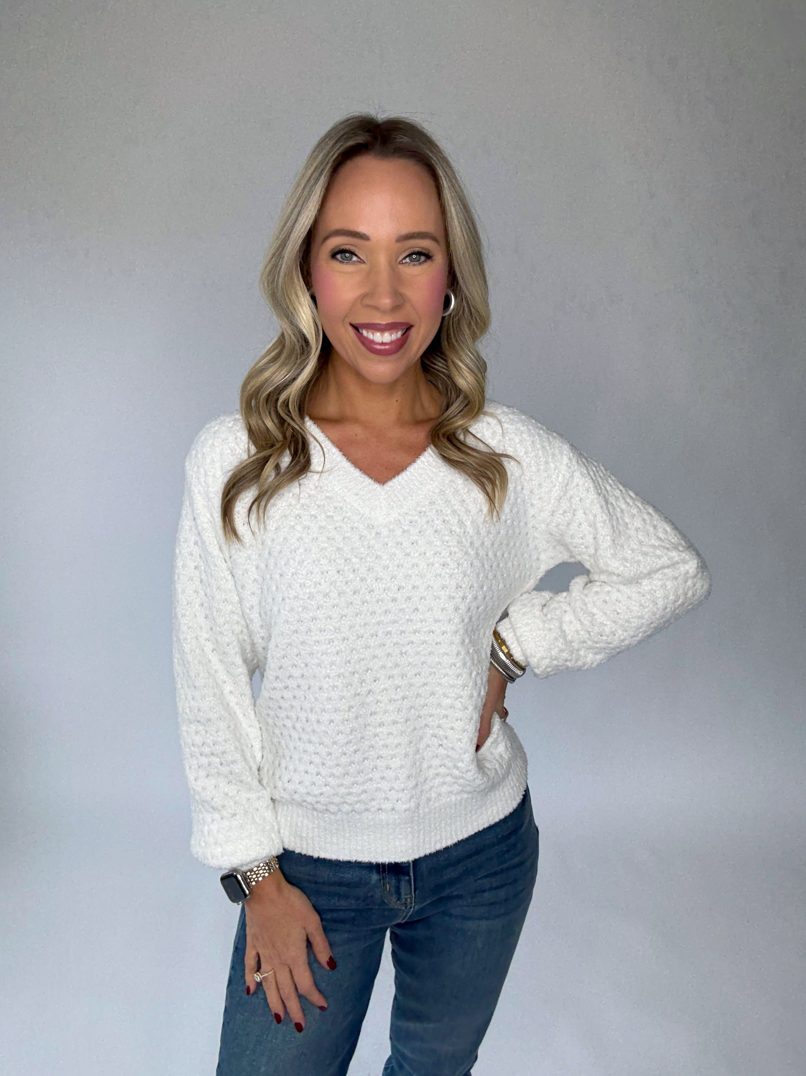 A classic V-neckline lends timeless femininity, while light ribbing at the sleeves, neckline, and waist provides gentle structure in the same luxe fabric. The subtle pique texture throughout adds quiet visual interest, giving this piece a sophisticated appeal that stands beautifully on its own or layered beneath your favorite outerwear.