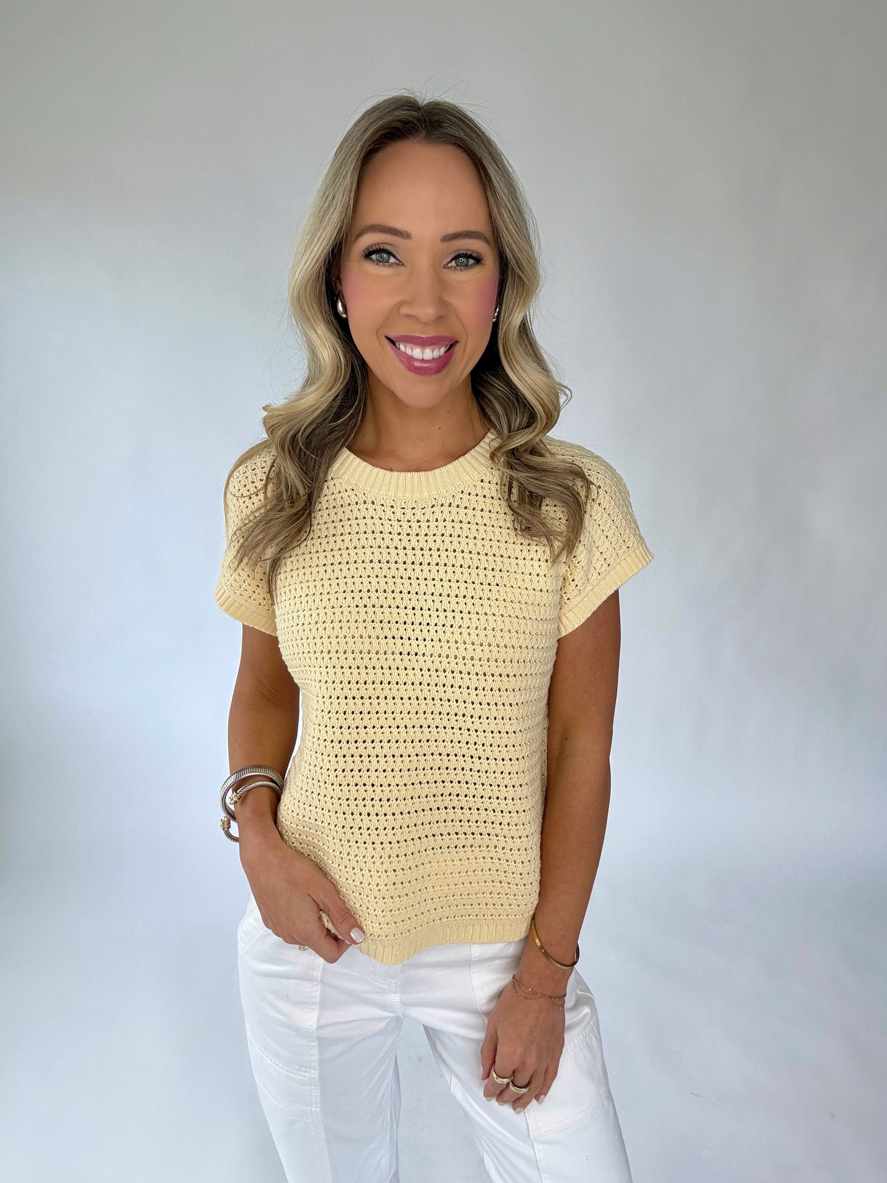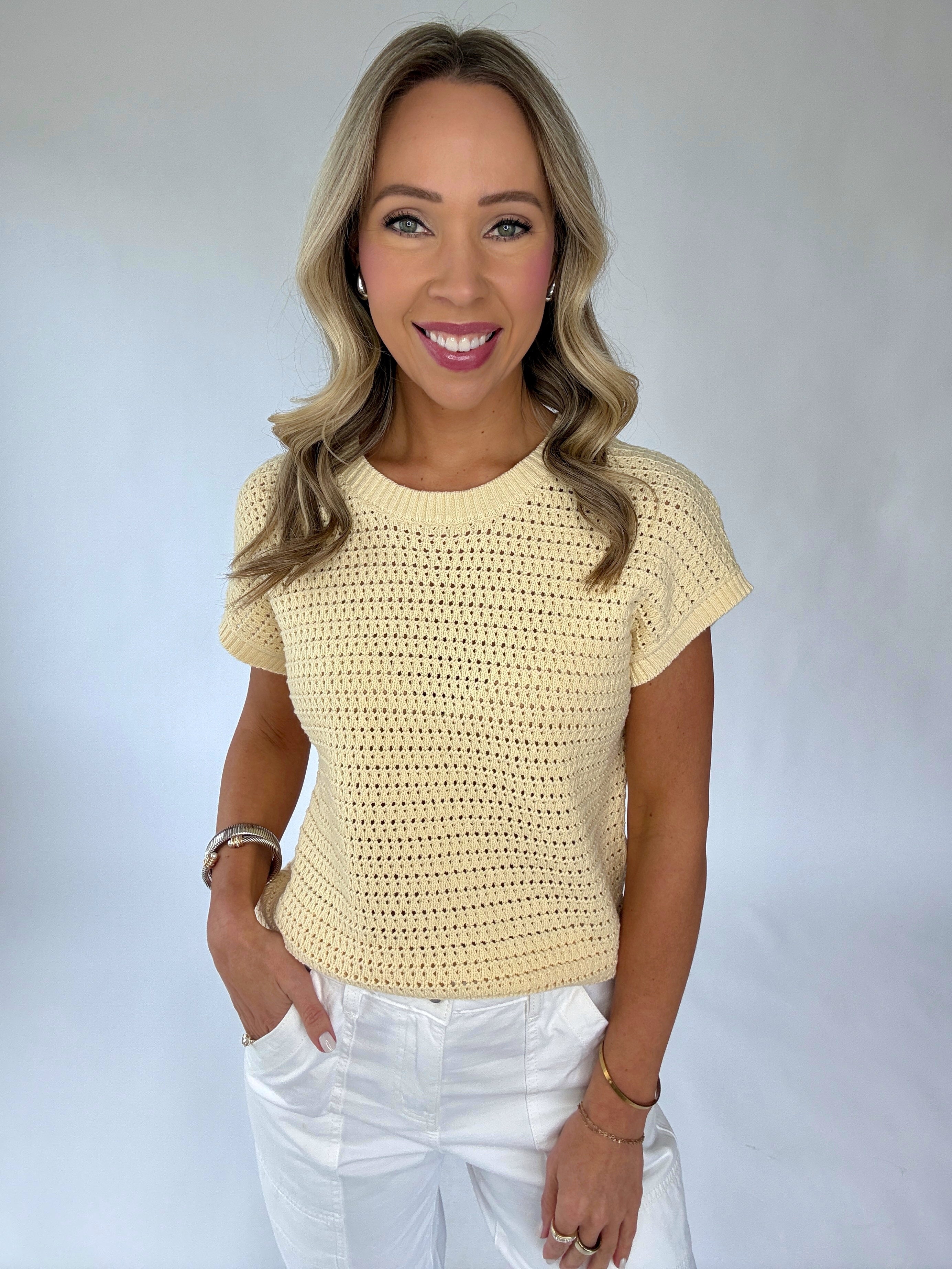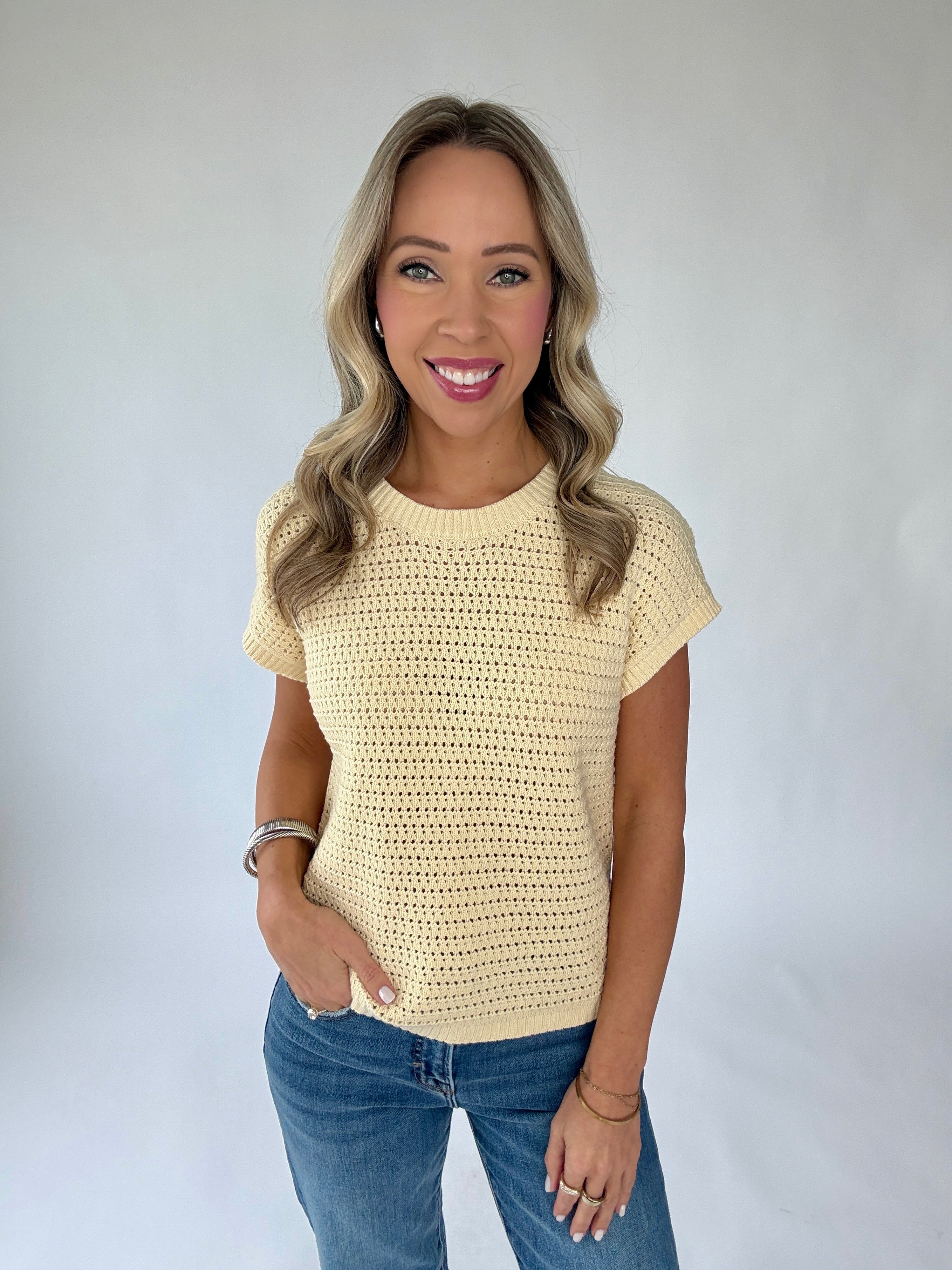 The Couldn’t Be Happier Knit Top is a radiant expression of effortless style and timeless simplicity. Designed in a soft, open-knit construction, this short-sleeve pullover features a classic round neckline and a beautifully lightweight feel that is perfect for the warmer seasons.