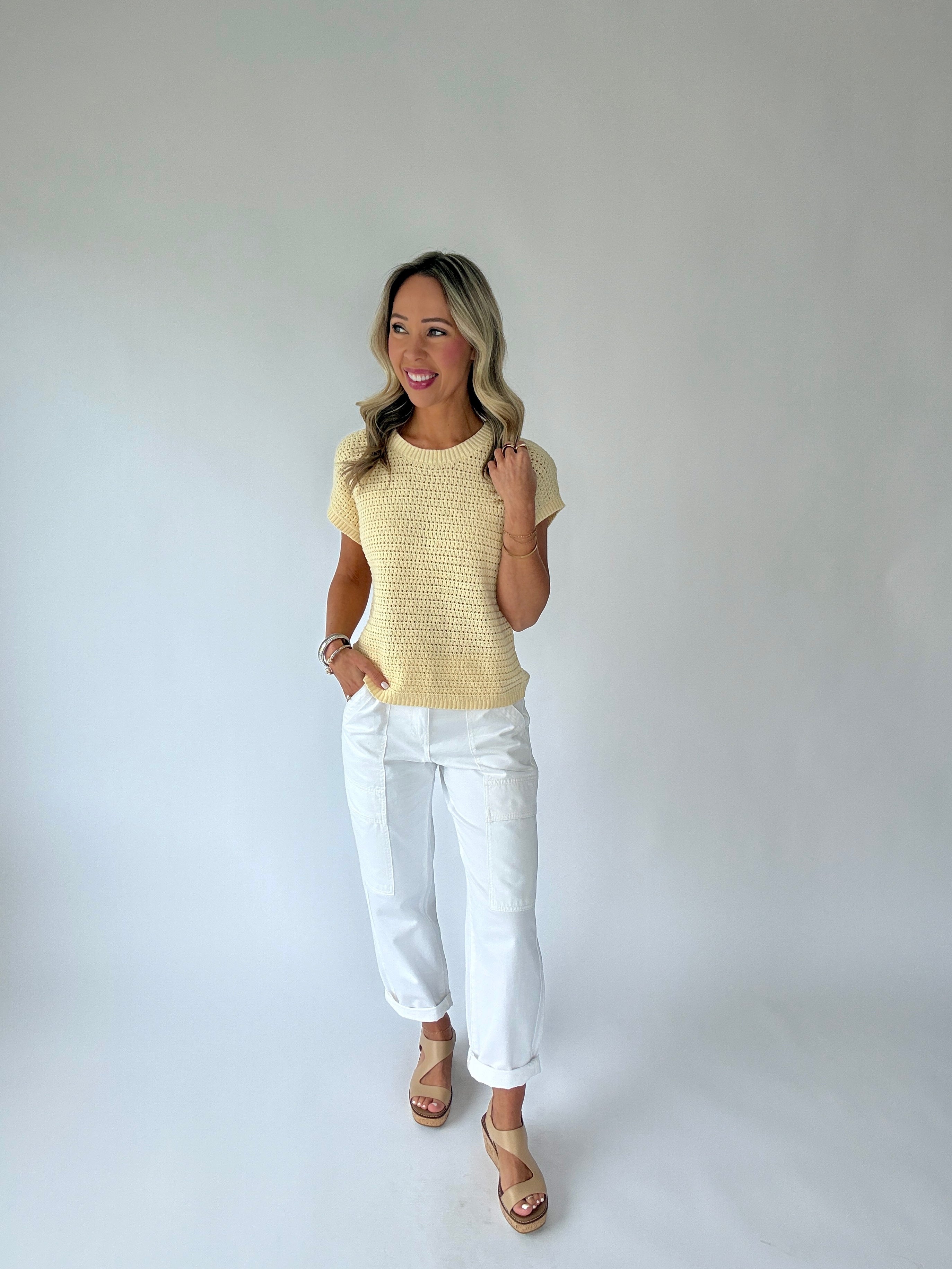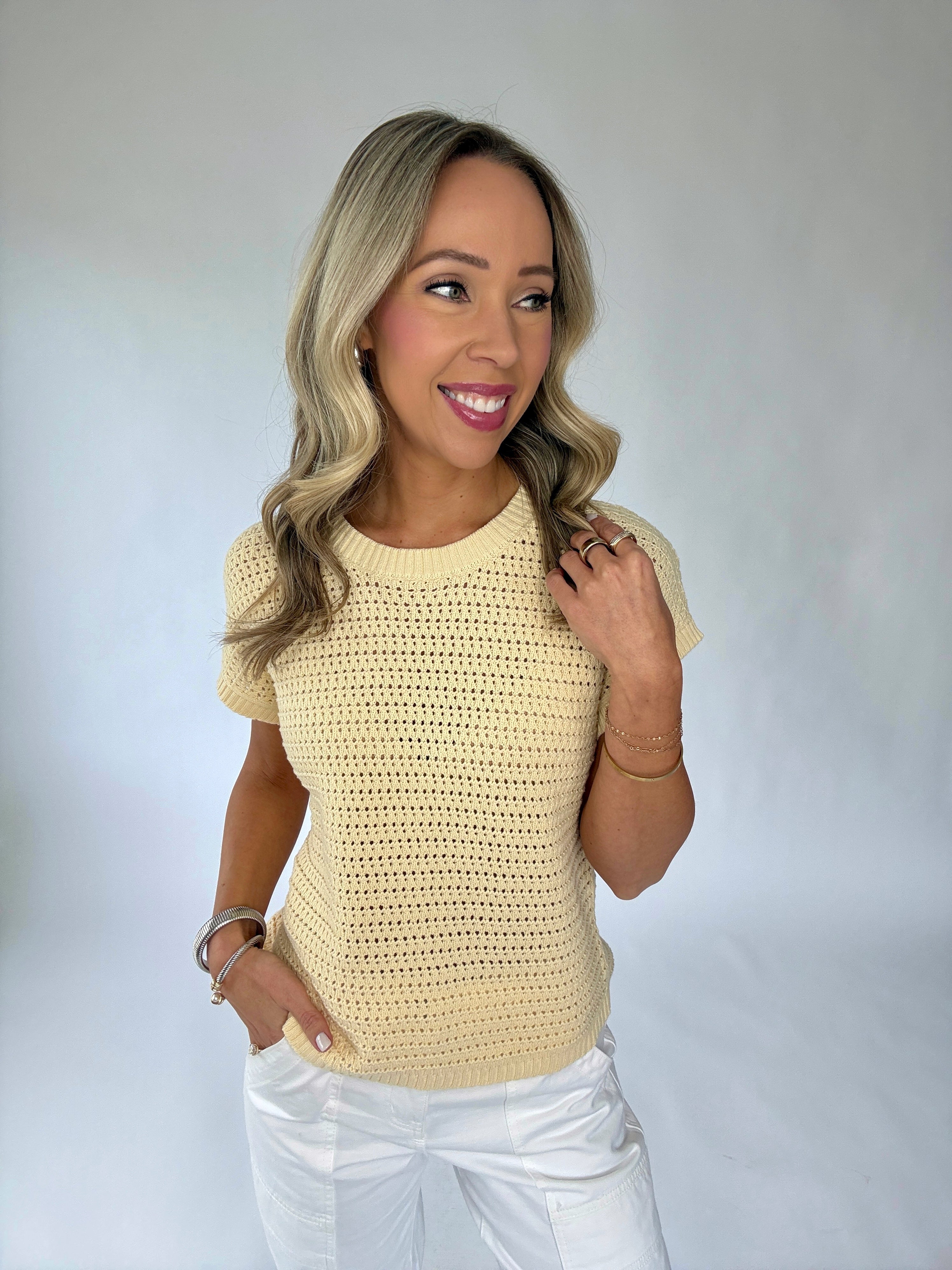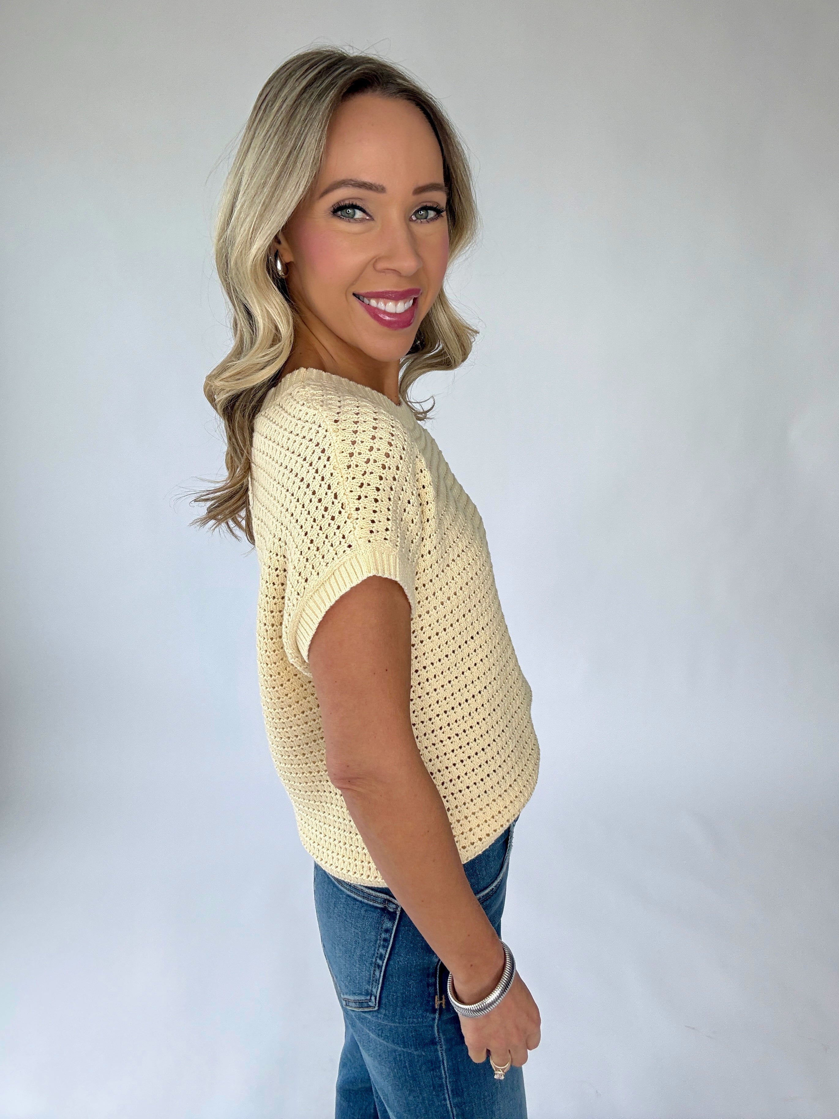 The Couldn’t Be Happier Knit Top is a radiant expression of effortless style and timeless simplicity. Designed in a soft, open-knit construction, this short-sleeve pullover features a classic round neckline and a beautifully lightweight feel that is perfect for the warmer seasons.