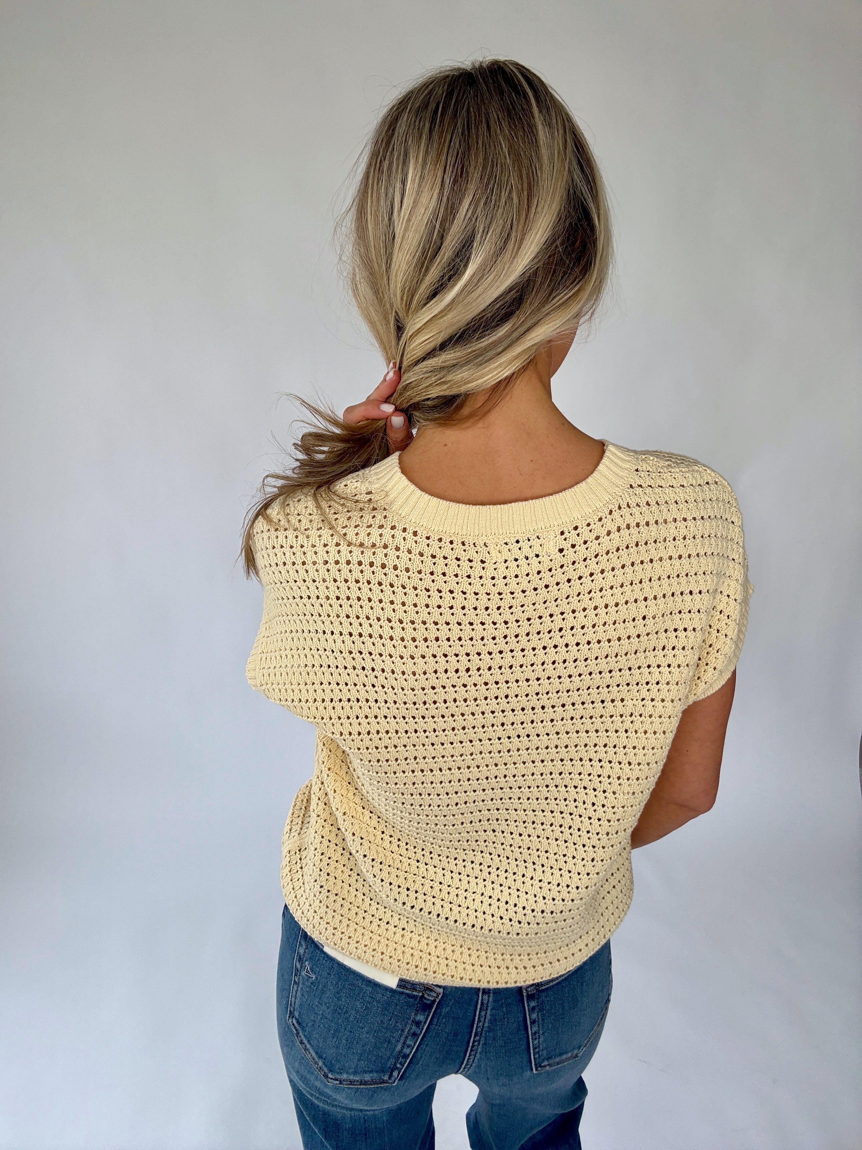 Rendered in a delicate light yellow hue, this piece brings a subtle touch of sunshine to any outfit while maintaining a refined, understated elegance. The airy knit allows for breathable comfort, and we recommend layering with a nude-toned bra or tank for a seamless finish.