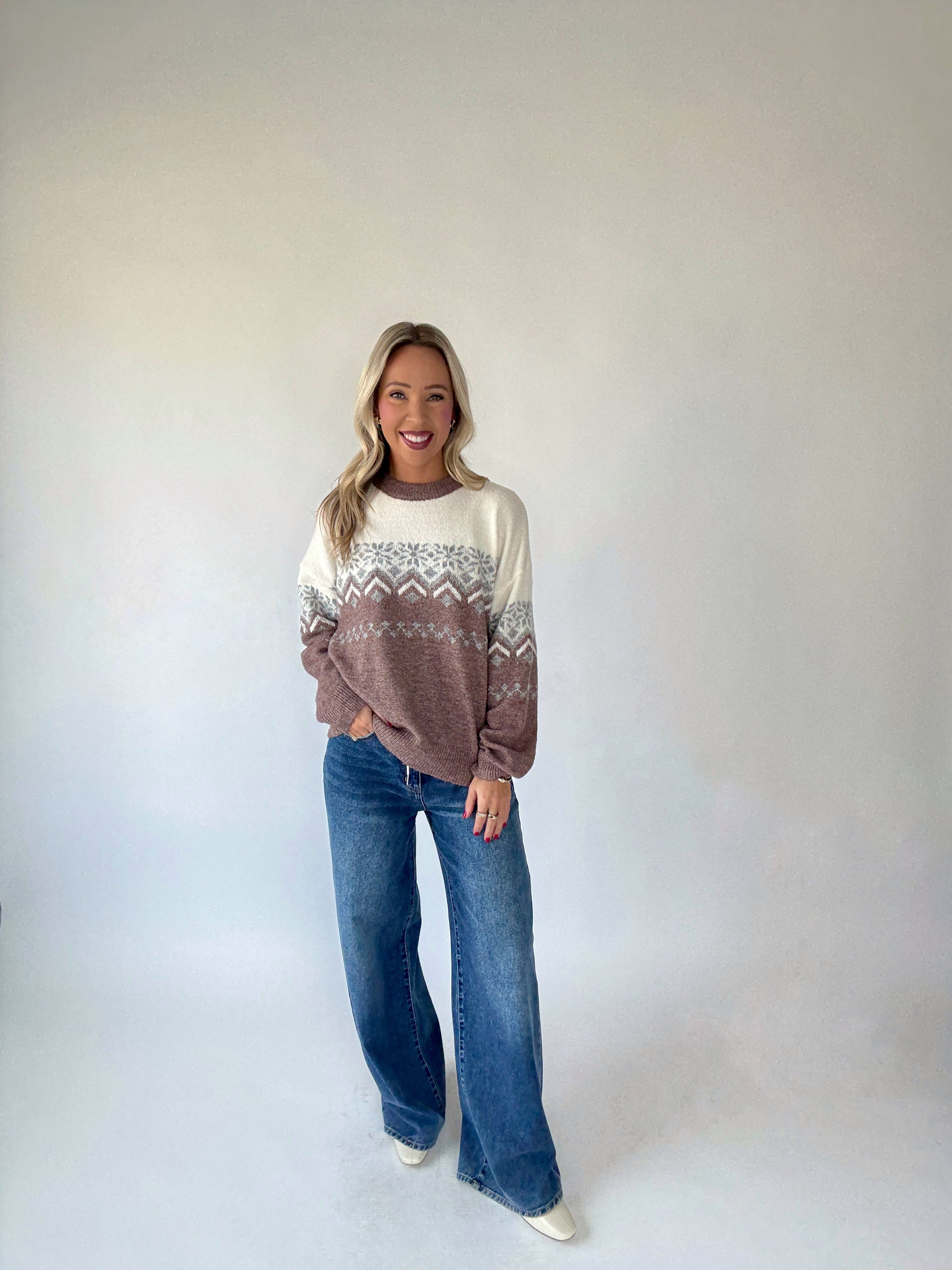 A timeless classic with a modern touch — the Fair Isle Pullover Sweater brings cozy sophistication to your seasonal wardrobe. Featuring a traditional Fair Isle pattern that transitions beautifully from a soft cream top to a contrasting hue at the hem, this long sleeve crew neck sweater captures the essence of effortless style. Crafted for comfort and everyday wear, it pairs perfectly with denim for a relaxed weekend look or with tailored trousers for a more polished, work-ready ensemble.