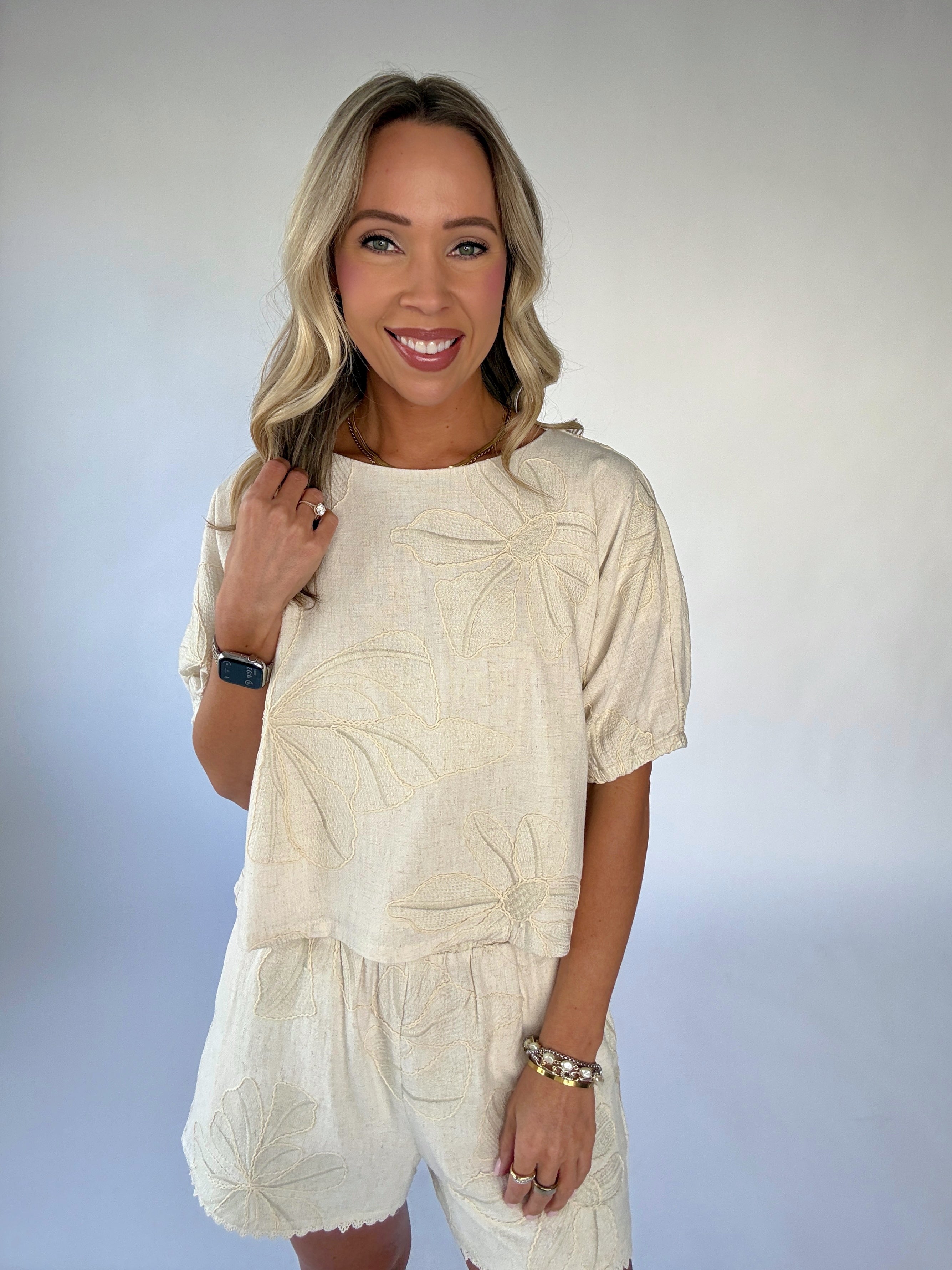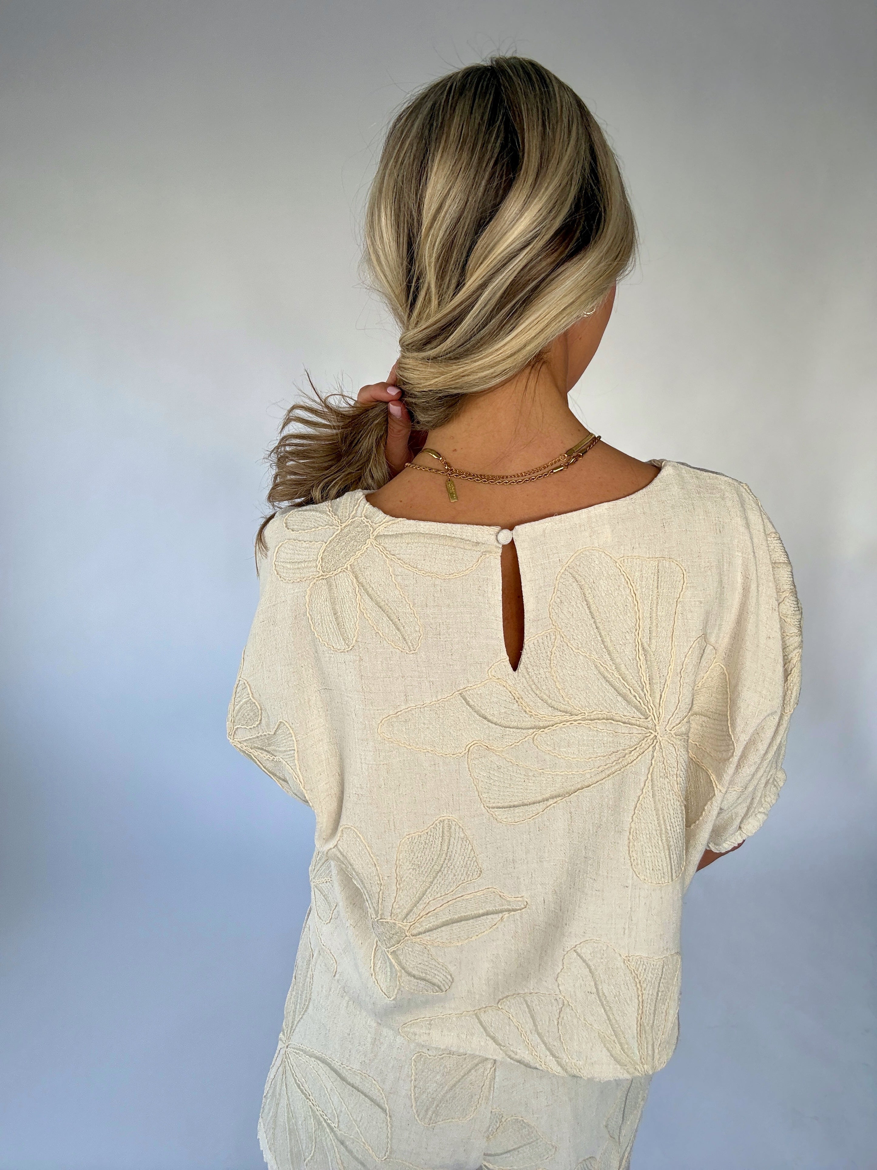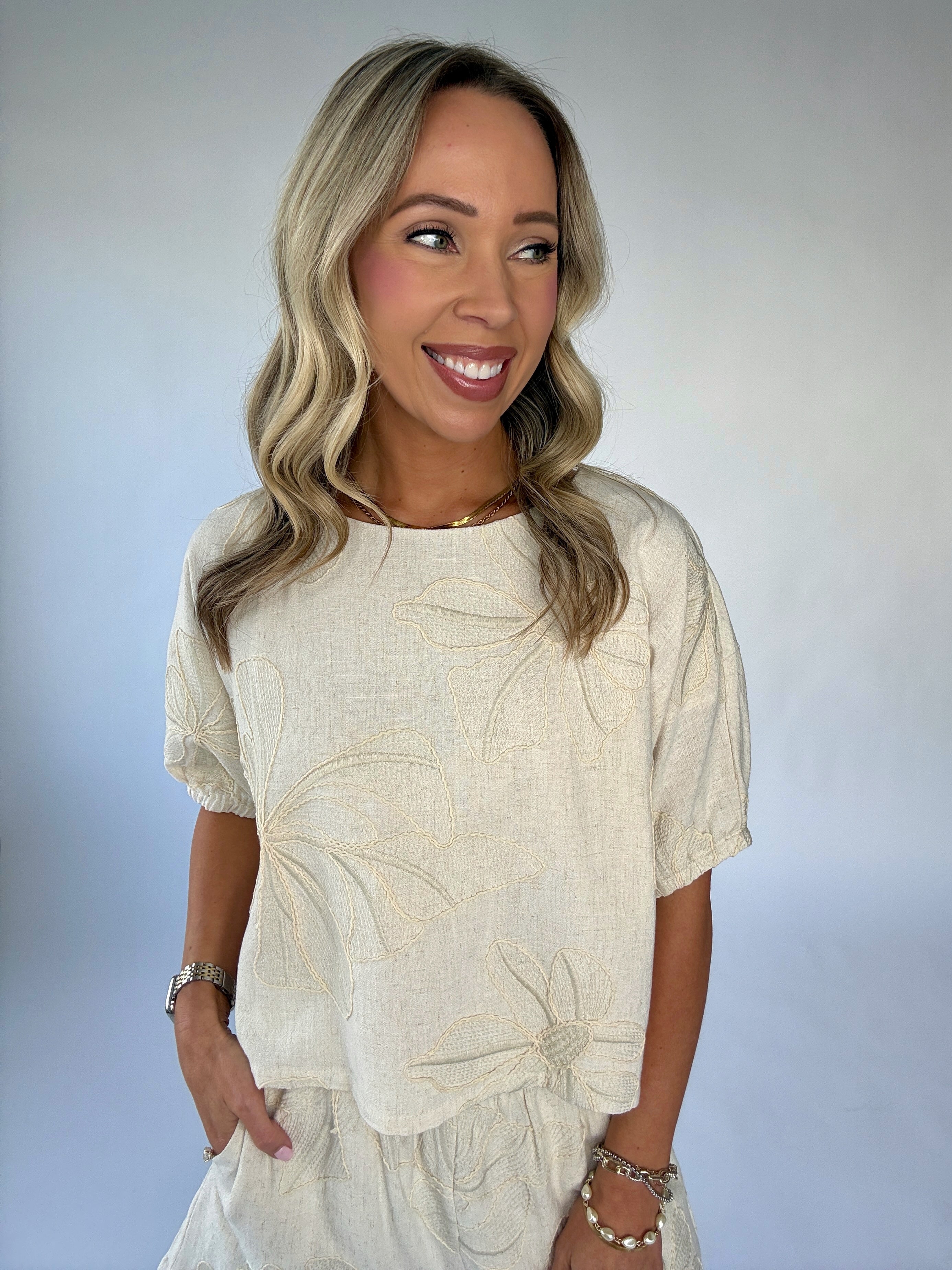 The Forever & Always Top is a graceful expression of timeless femininity and effortless charm. Crafted from a soft linen-blend fabric in a beautiful natural hue, this top is delicately adorned with floral embroidery throughout, creating a look that feels both refined and romantic.