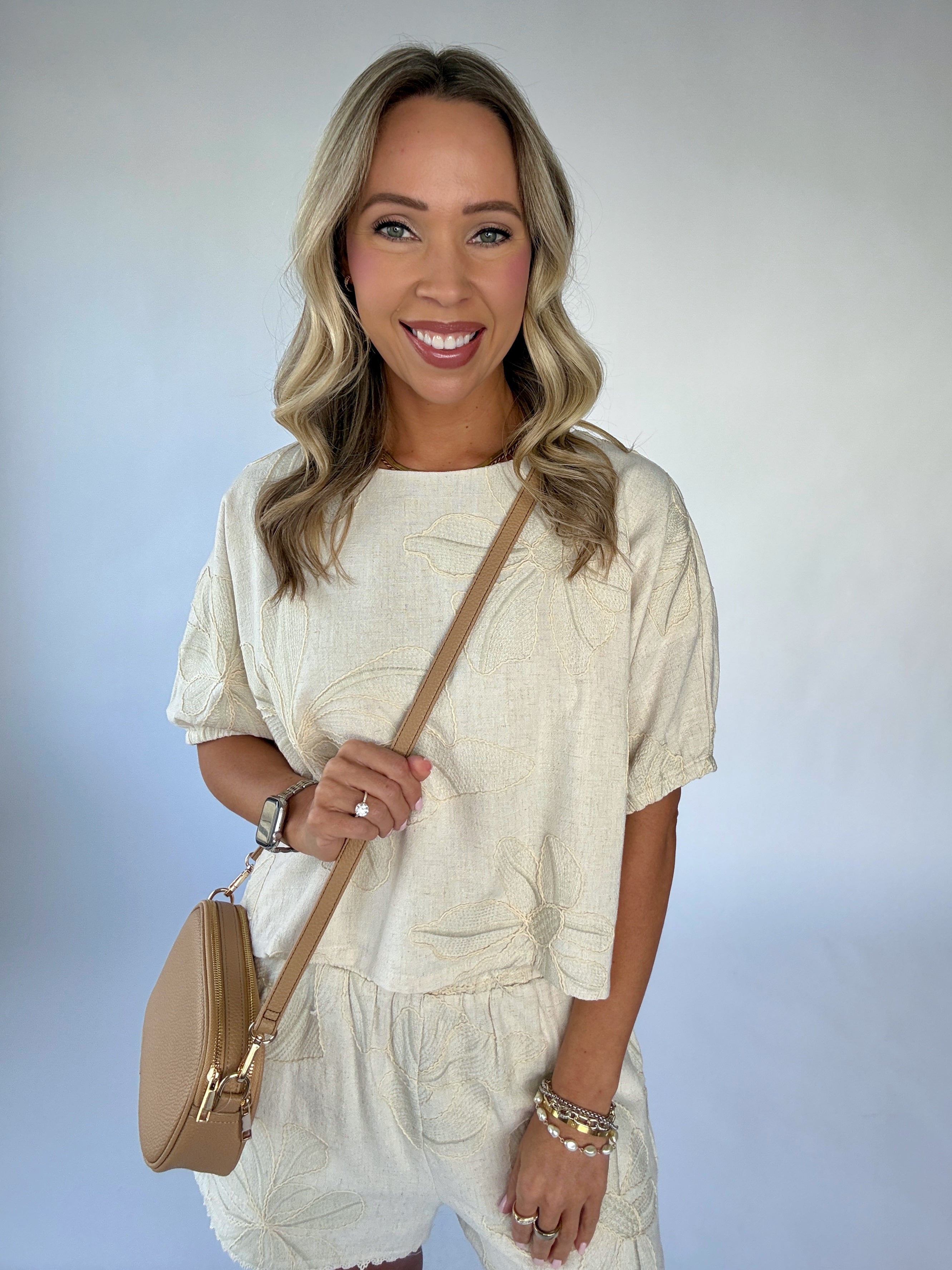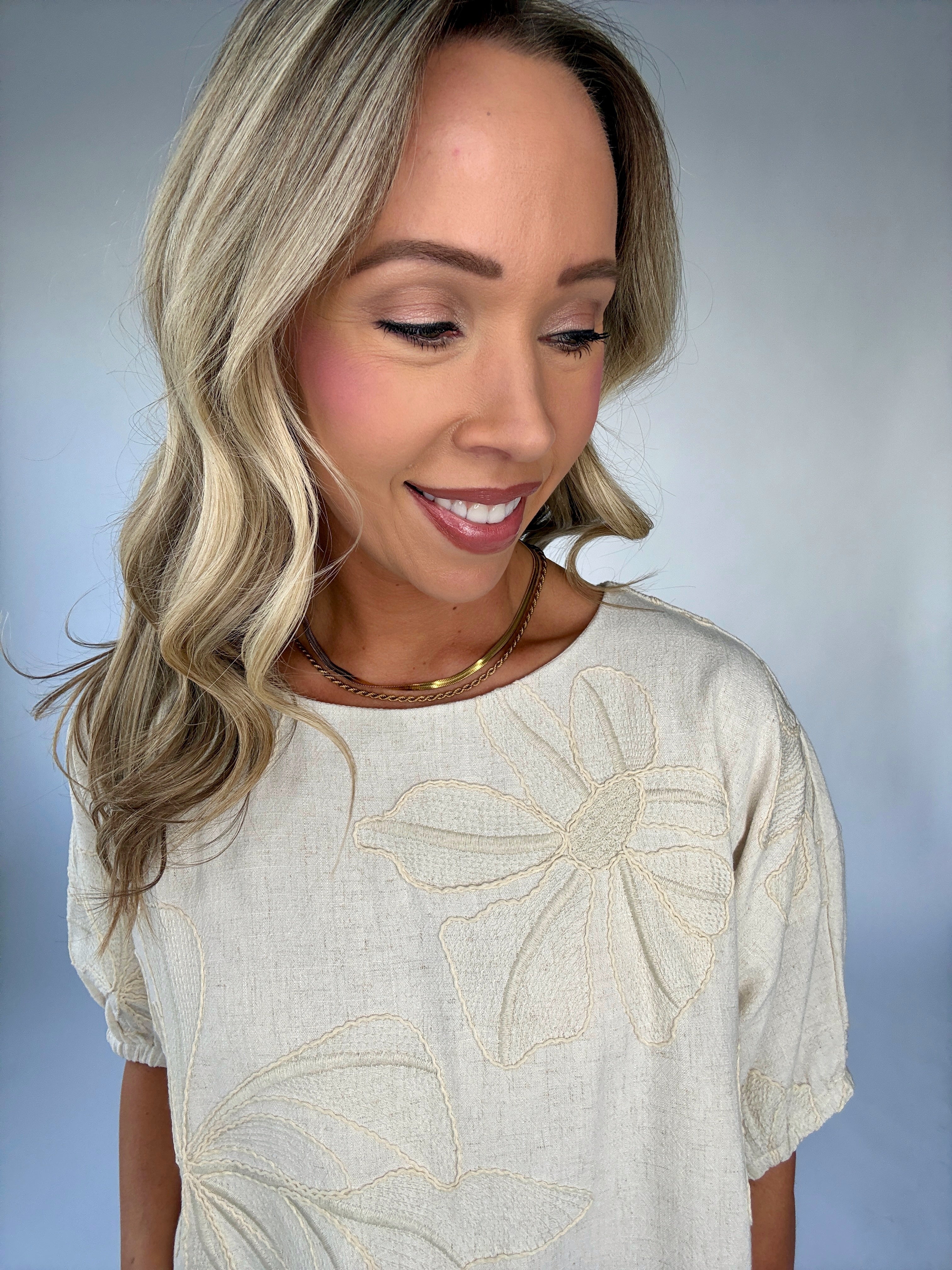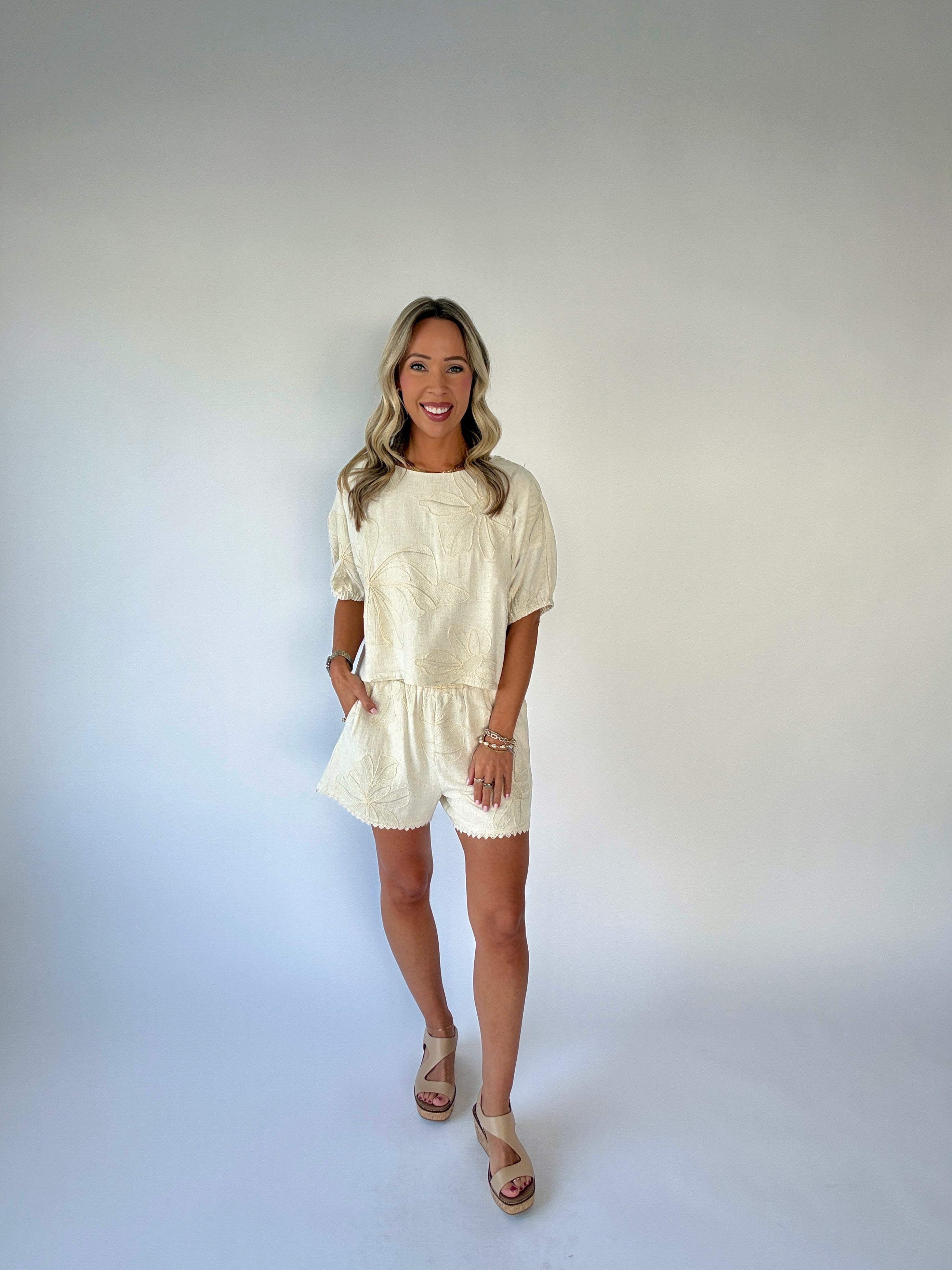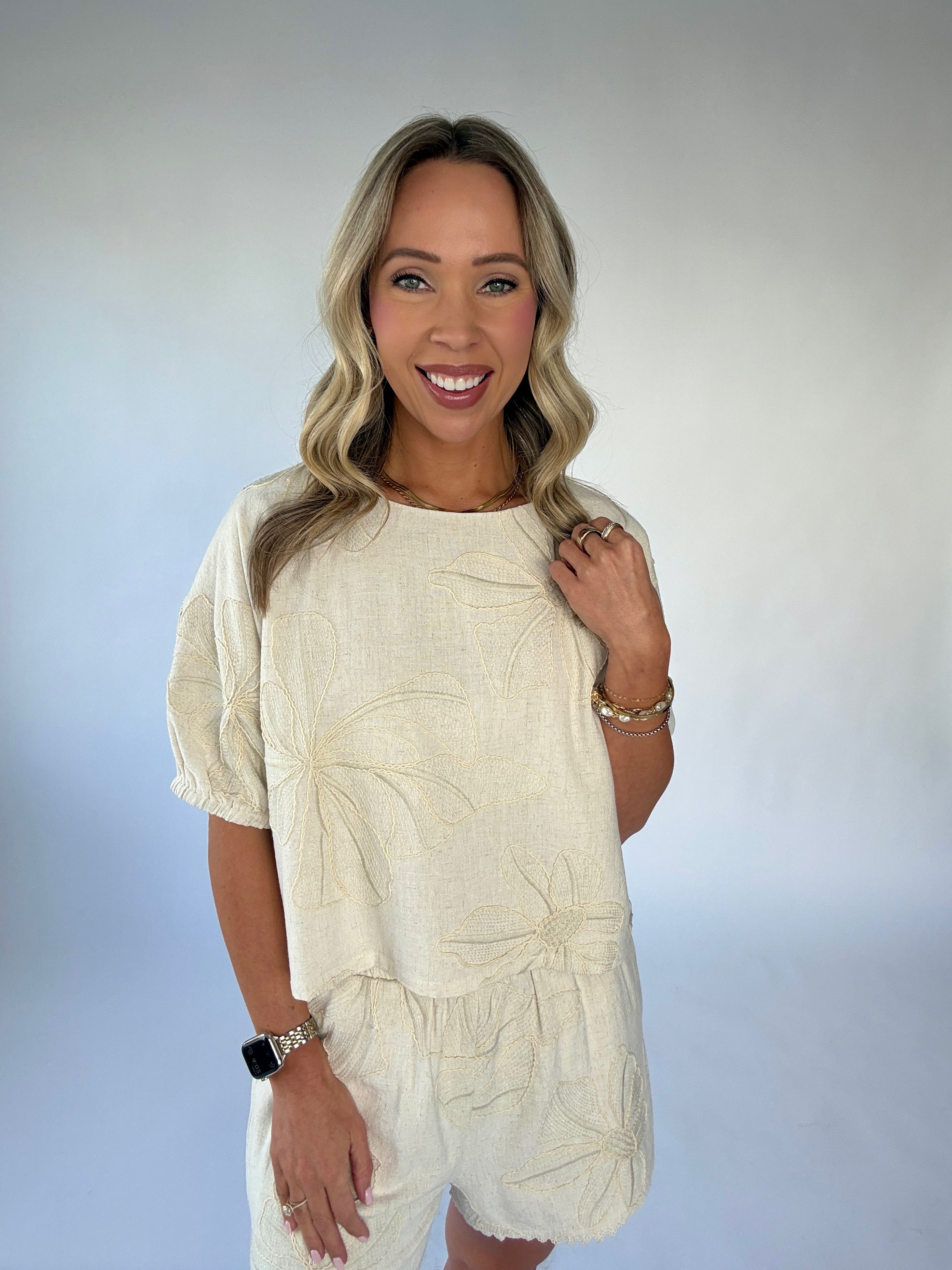 The Forever & Always Top is a graceful expression of timeless femininity and effortless charm. Crafted from a soft linen-blend fabric in a beautiful natural hue, this top is delicately adorned with floral embroidery throughout, creating a look that feels both refined and romantic.