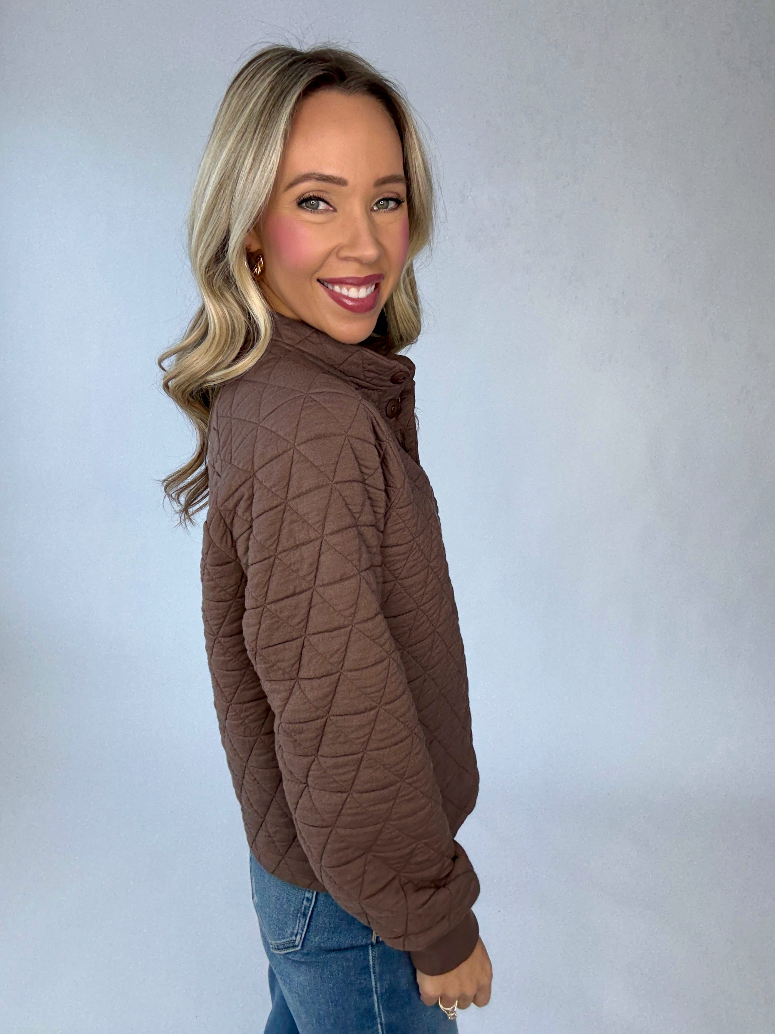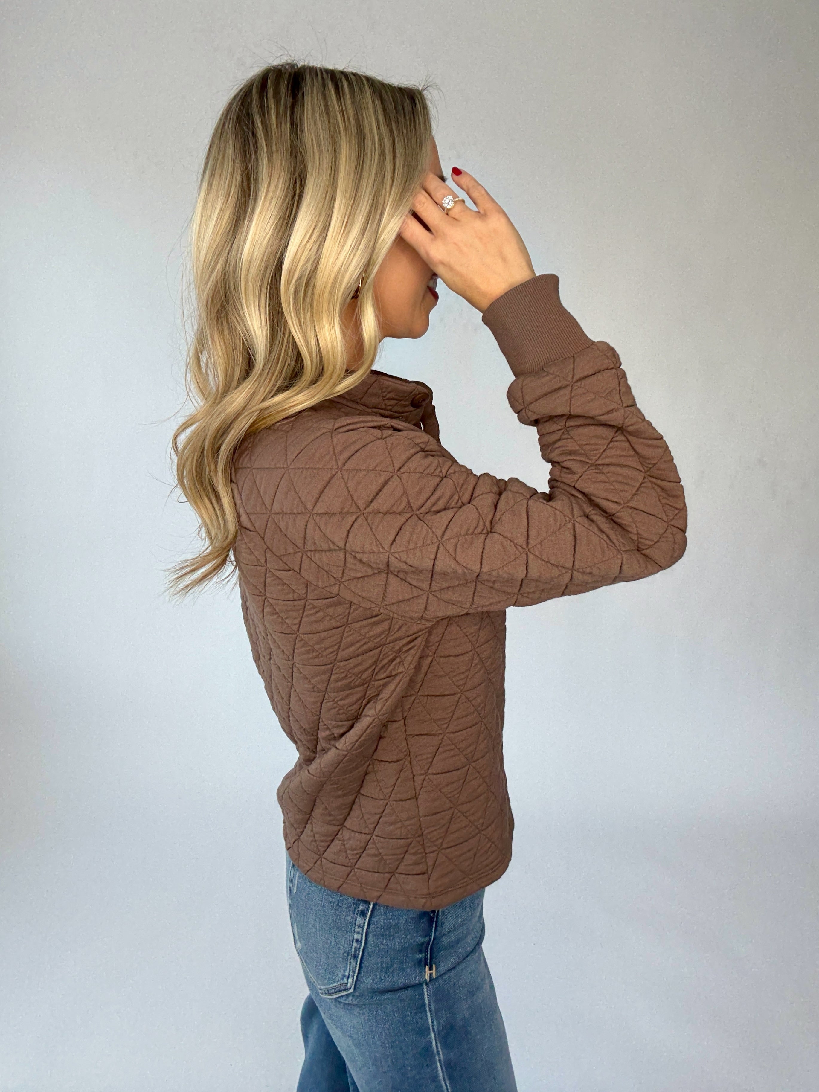 The Quilted Button Popover in Morel brings effortless sophistication to cozy, everyday style. Crafted from an ultra-soft quilted fabric, this elevated essential blends comfort with refined detail. The classic crewneck silhouette features a relaxed fit and long sleeves—perfect for layering or wearing on its own as the temperature drops.