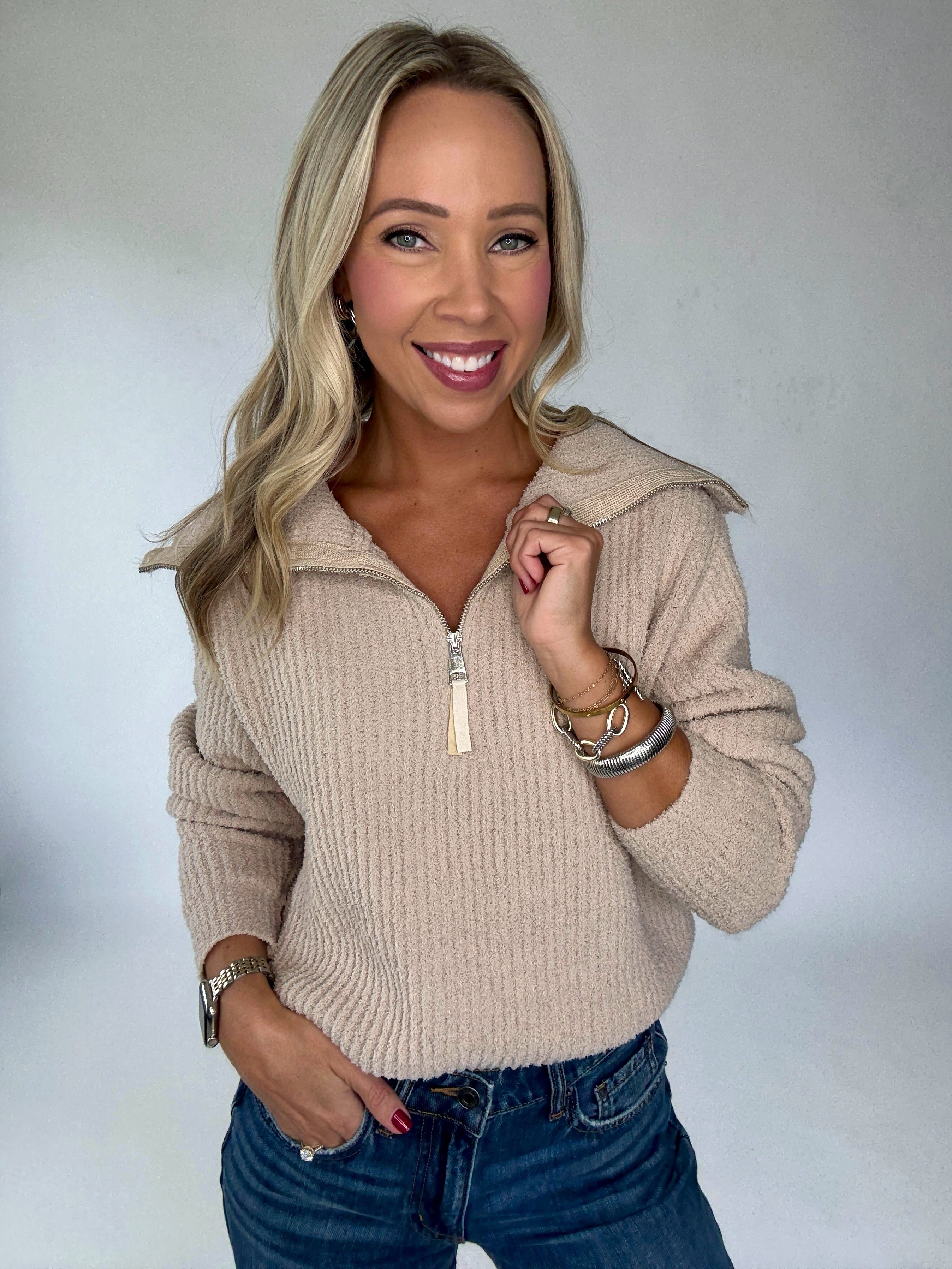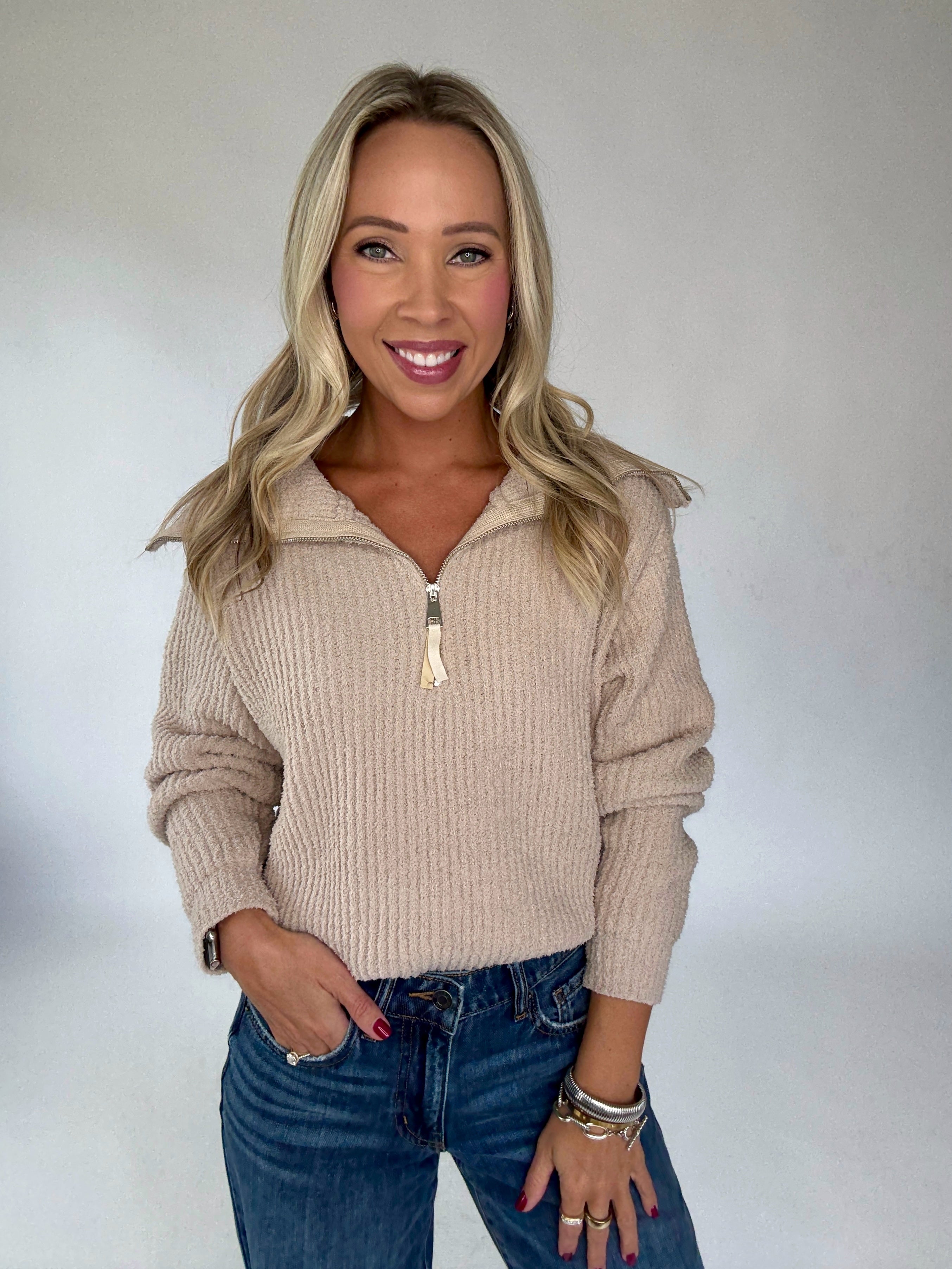 Part of The Comfort Capsule Collection, this frosted almond pullover is crafted from an irresistibly plush fabric you’ll never want to take off. The waist-length silhouette features subtle vertical ribbing for a touch of texture, while a polished silver half-zip closure with a refined pull detail adds both function and style. Designed for ultimate comfort, it’s the perfect everyday throw-on piece—easy with denim for a casual look, yet cozy and elevated enough for lounging all season long.