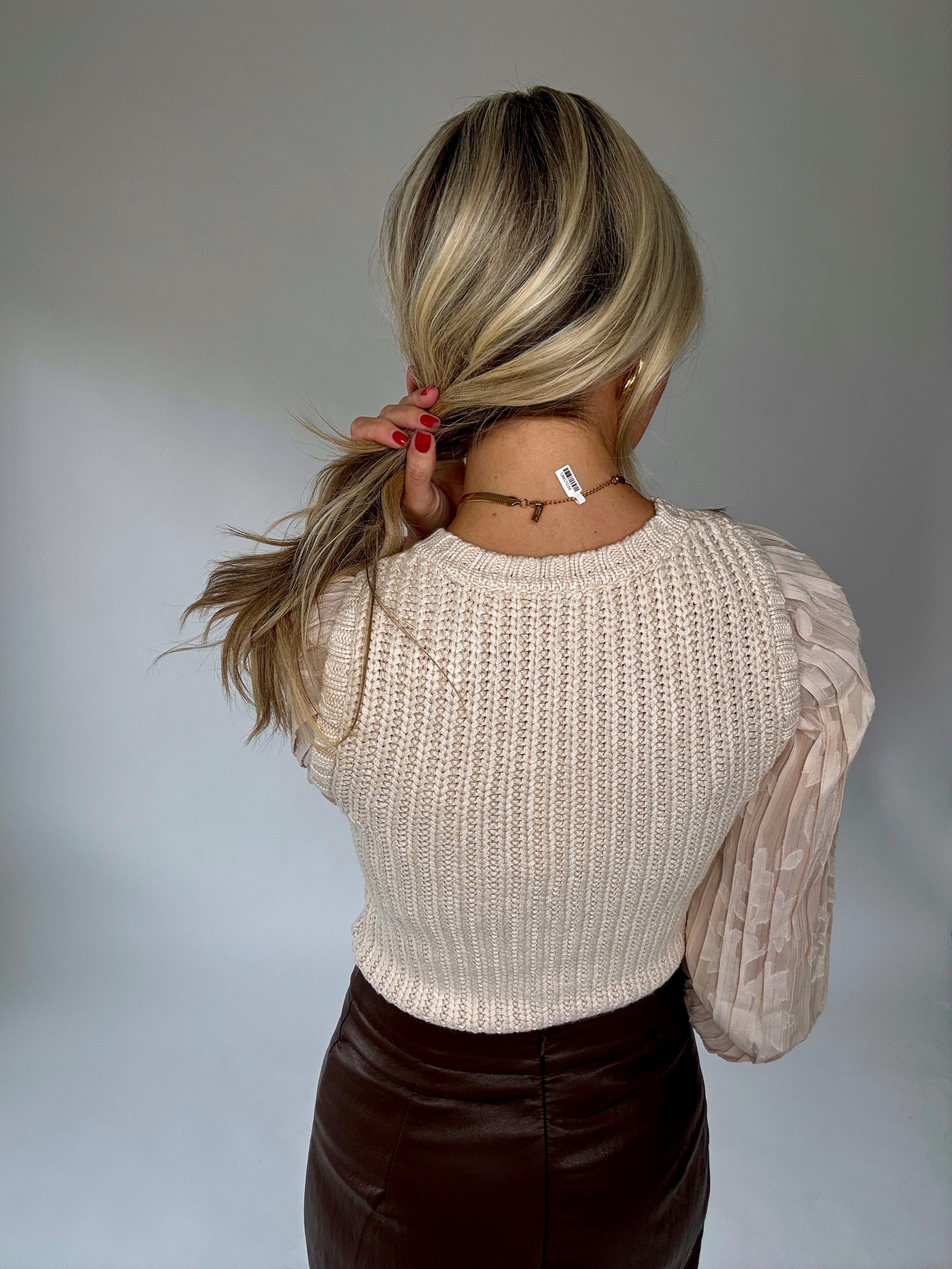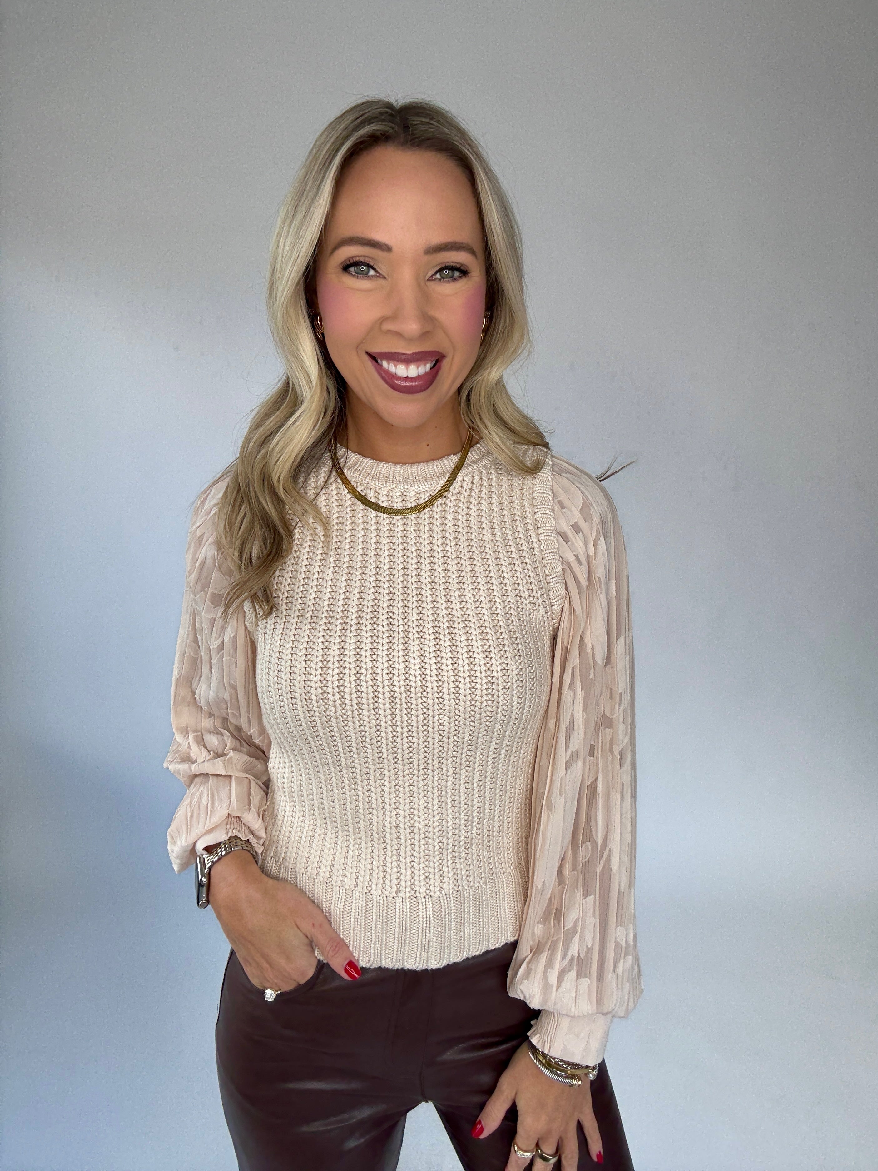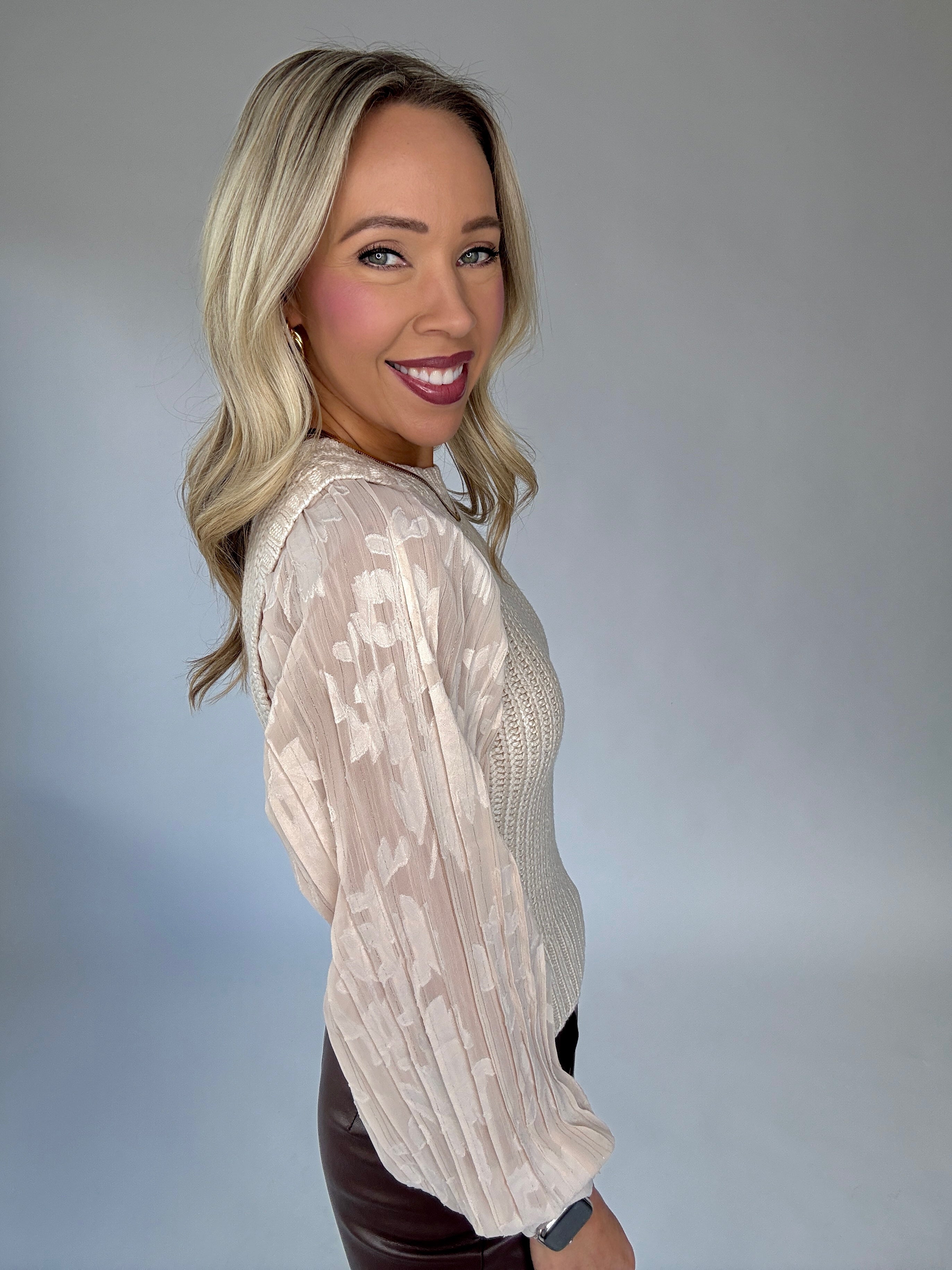Elevate your fall wardrobe with the Vintage Blush Contrast Sweater, a sophisticated pullover featuring a soft, classic knit body paired with sheer, patterned sleeves adorned with delicate floral and leaf motifs. Thoughtful button details at the cuffs enhance the refined design, while thick ribbing at the neckline and waist ensures a flattering fit.