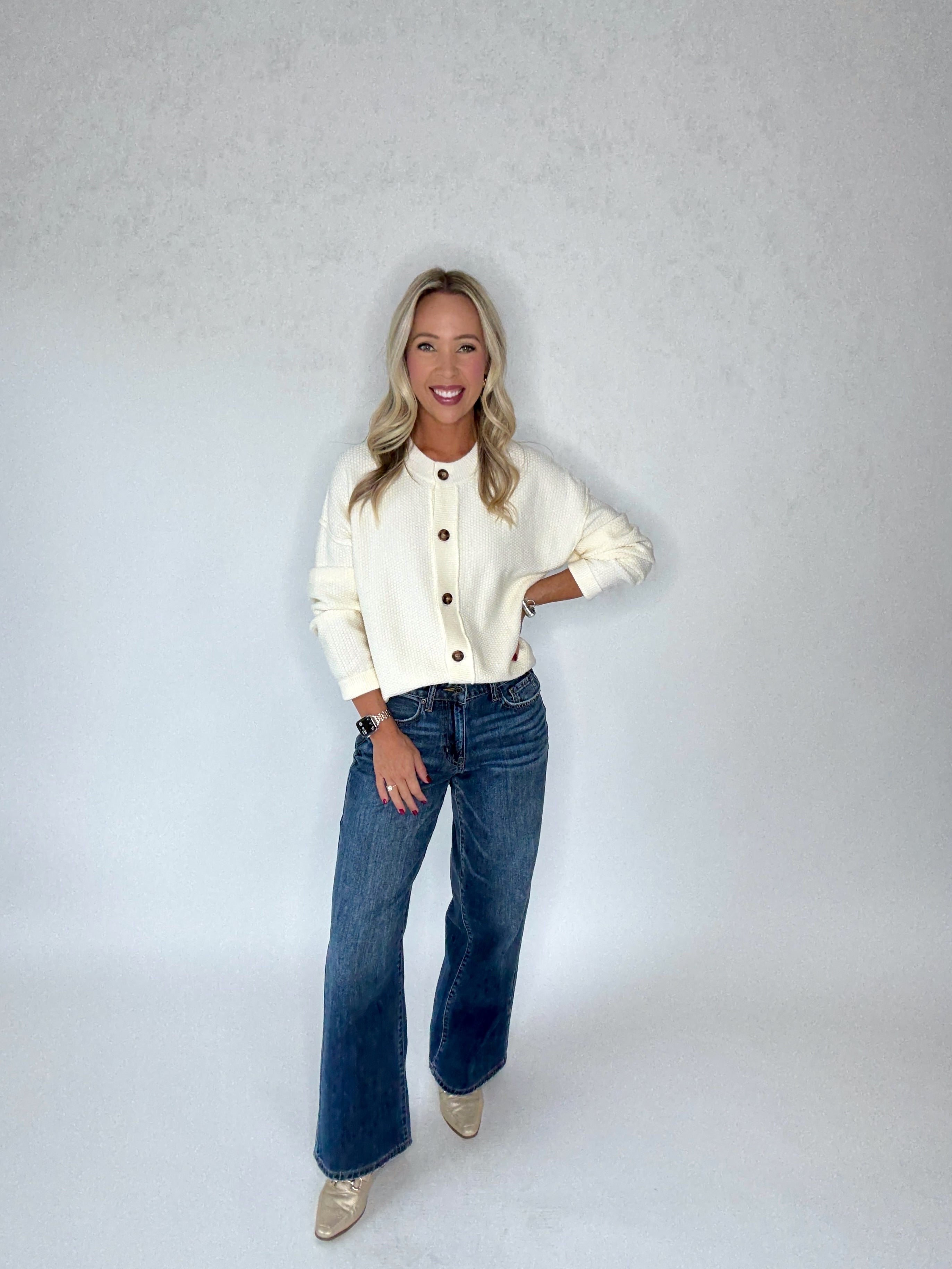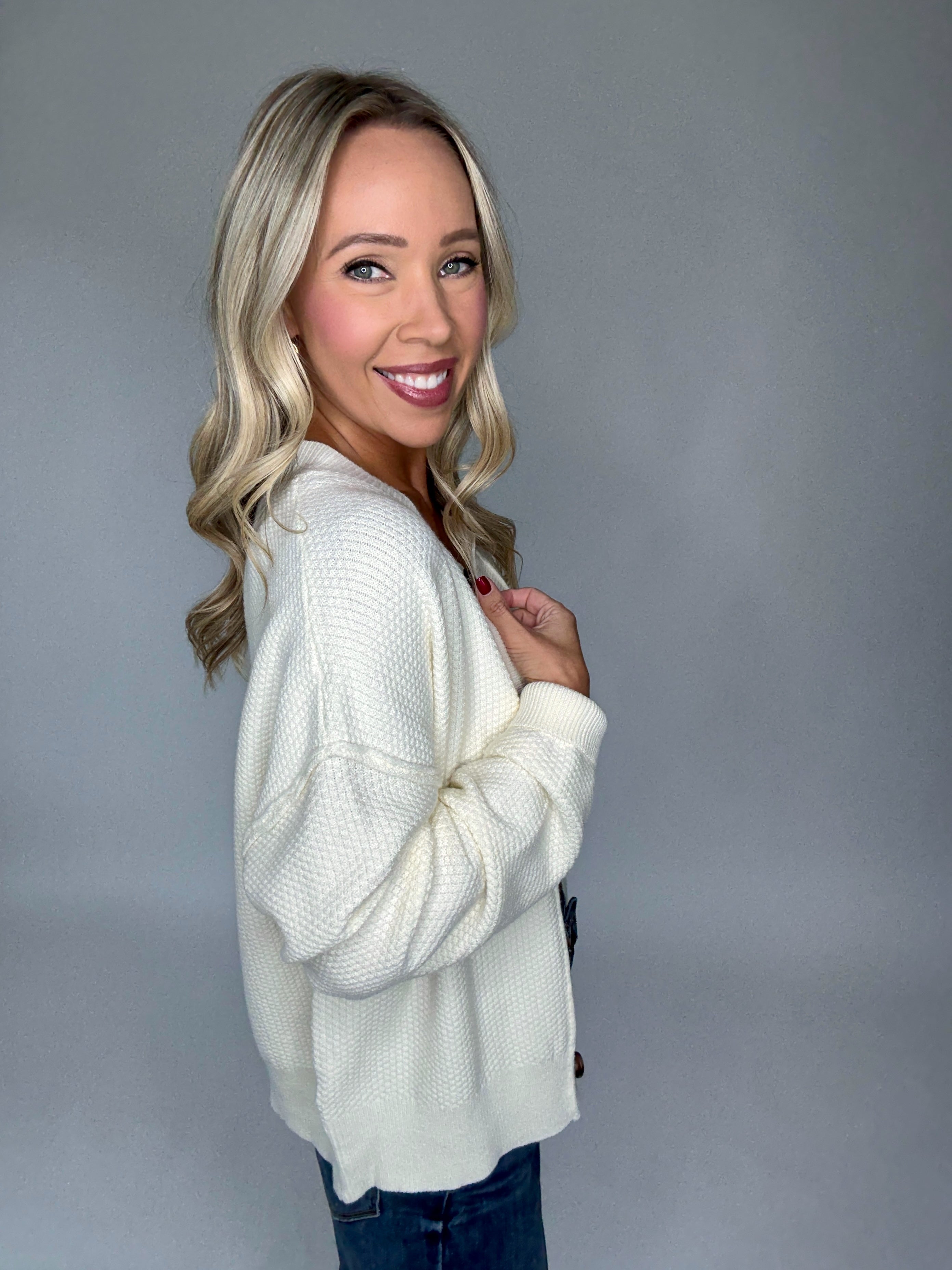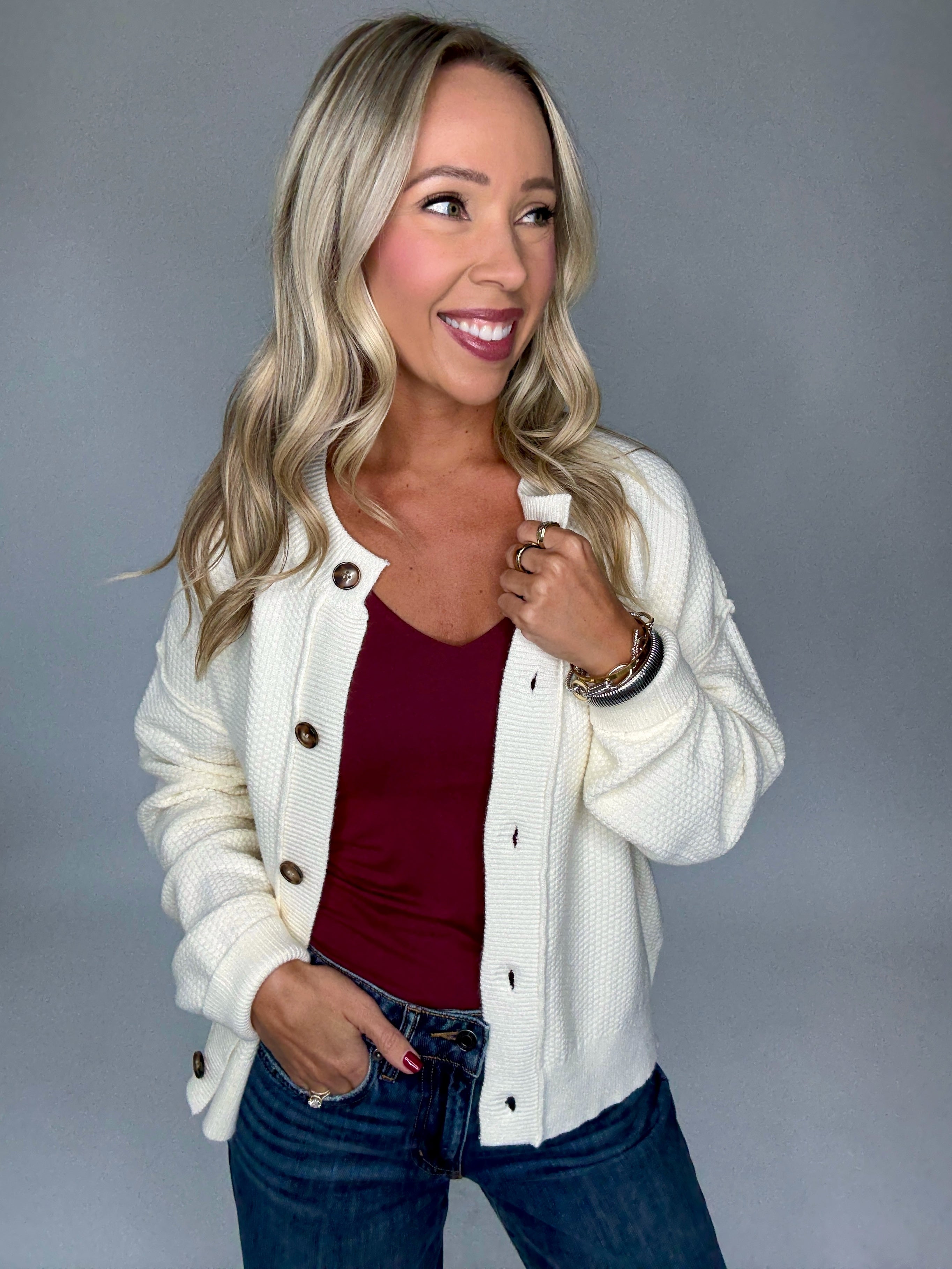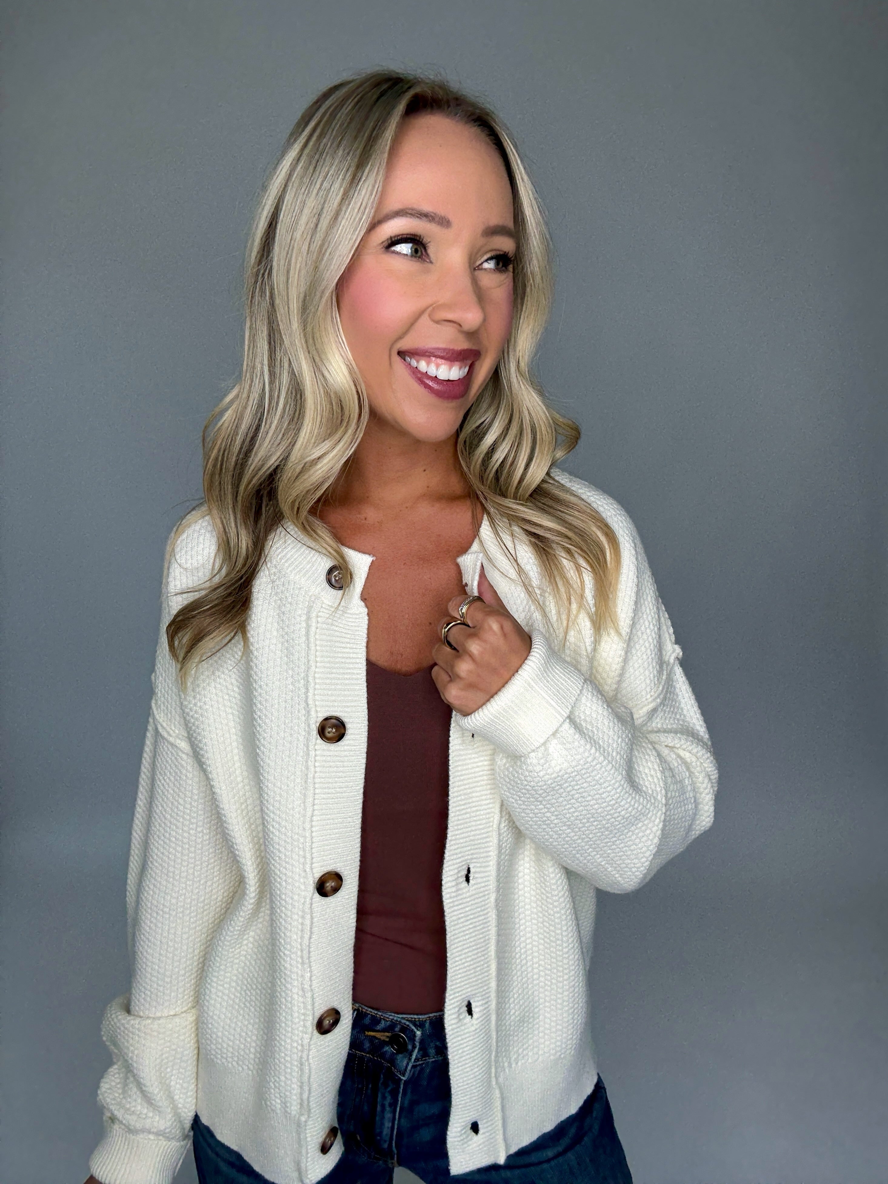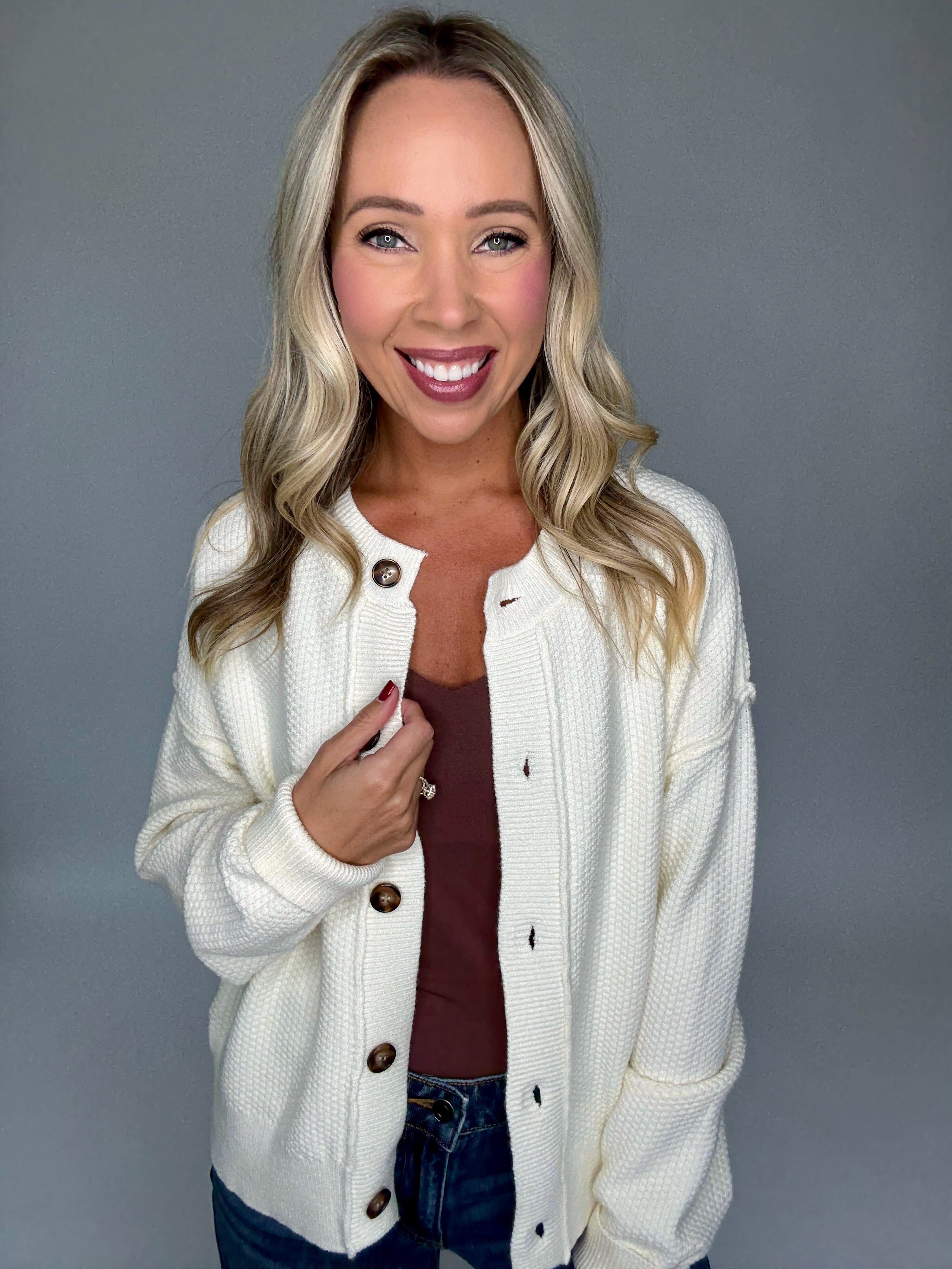 Designed in a soft, stretchy waffle knit, this button-down cardigan combines comfort with effortless style. Exposed seams along the button line and shoulders bring a touch of modern detail, while ribbing at the neckline, cuffs, and waist adds a classic finish. Whether layered over your favorite tops or worn on its own, this versatile piece transitions seamlessly from weekday polish to weekend ease.