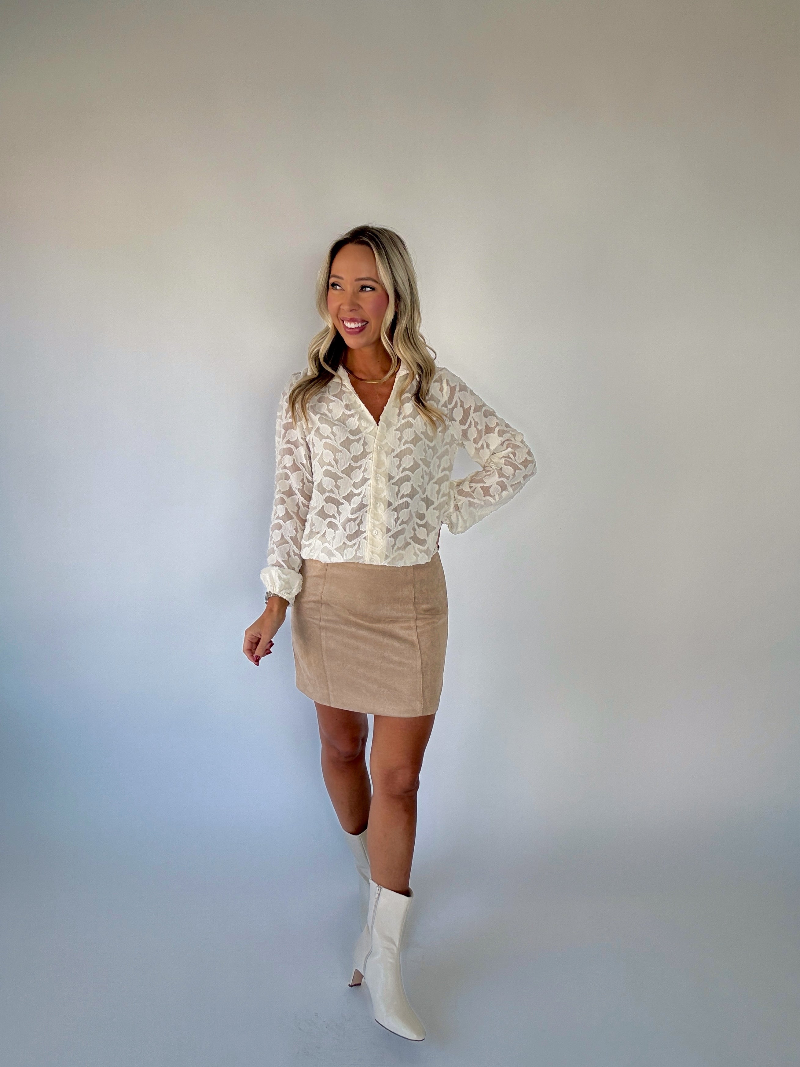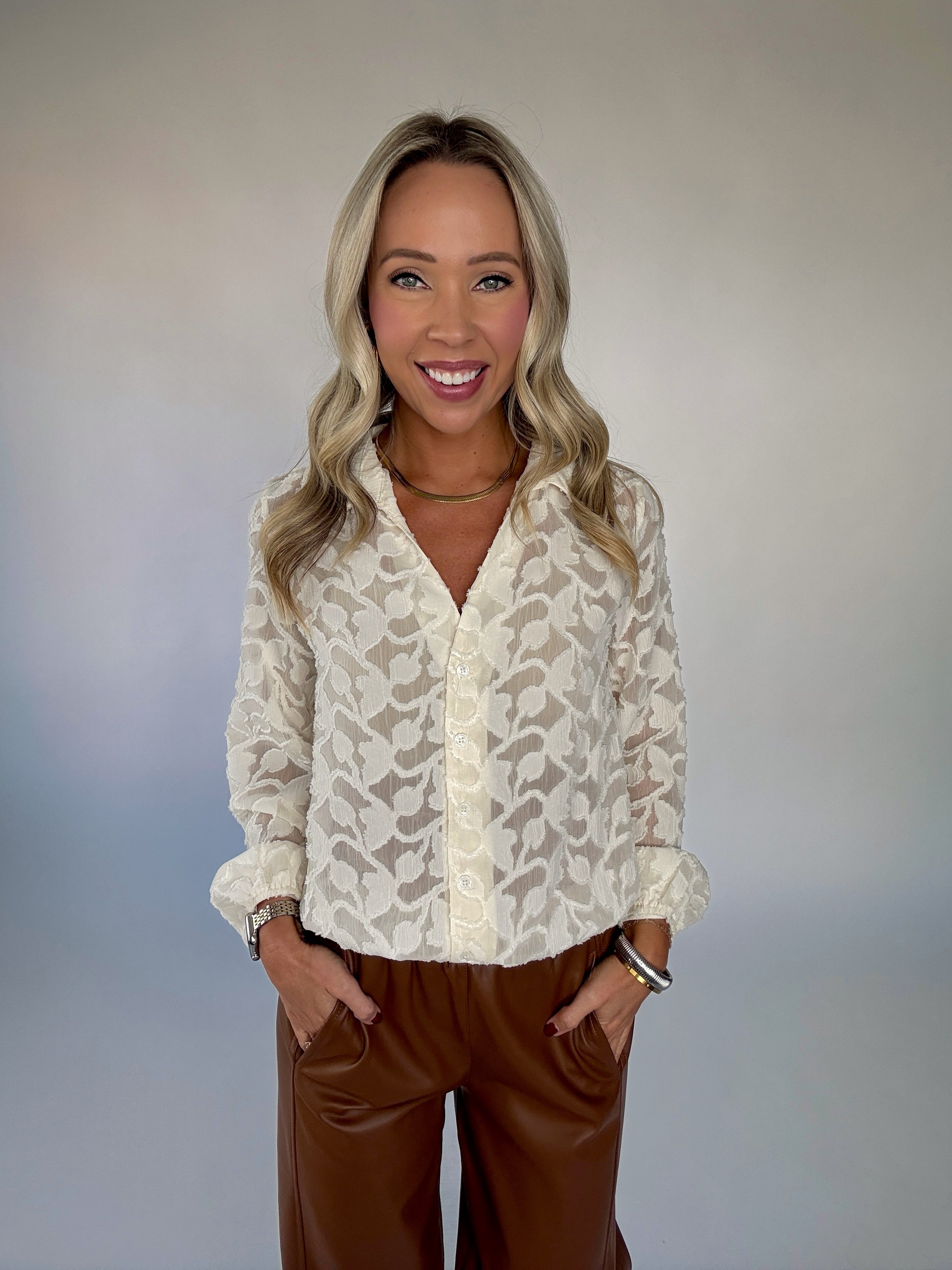 The Heritage Jacquard Blouse blends timeless elegance with modern versatility. Crafted in a delicate jacquard burnout fabric, this button-up blouse features a subtle floral pattern woven throughout, adding depth and sophistication to every look. The collared v-neckline and button-front design create a polished silhouette, while the elastic waist and cuffs offer ease and a flattering shape.
