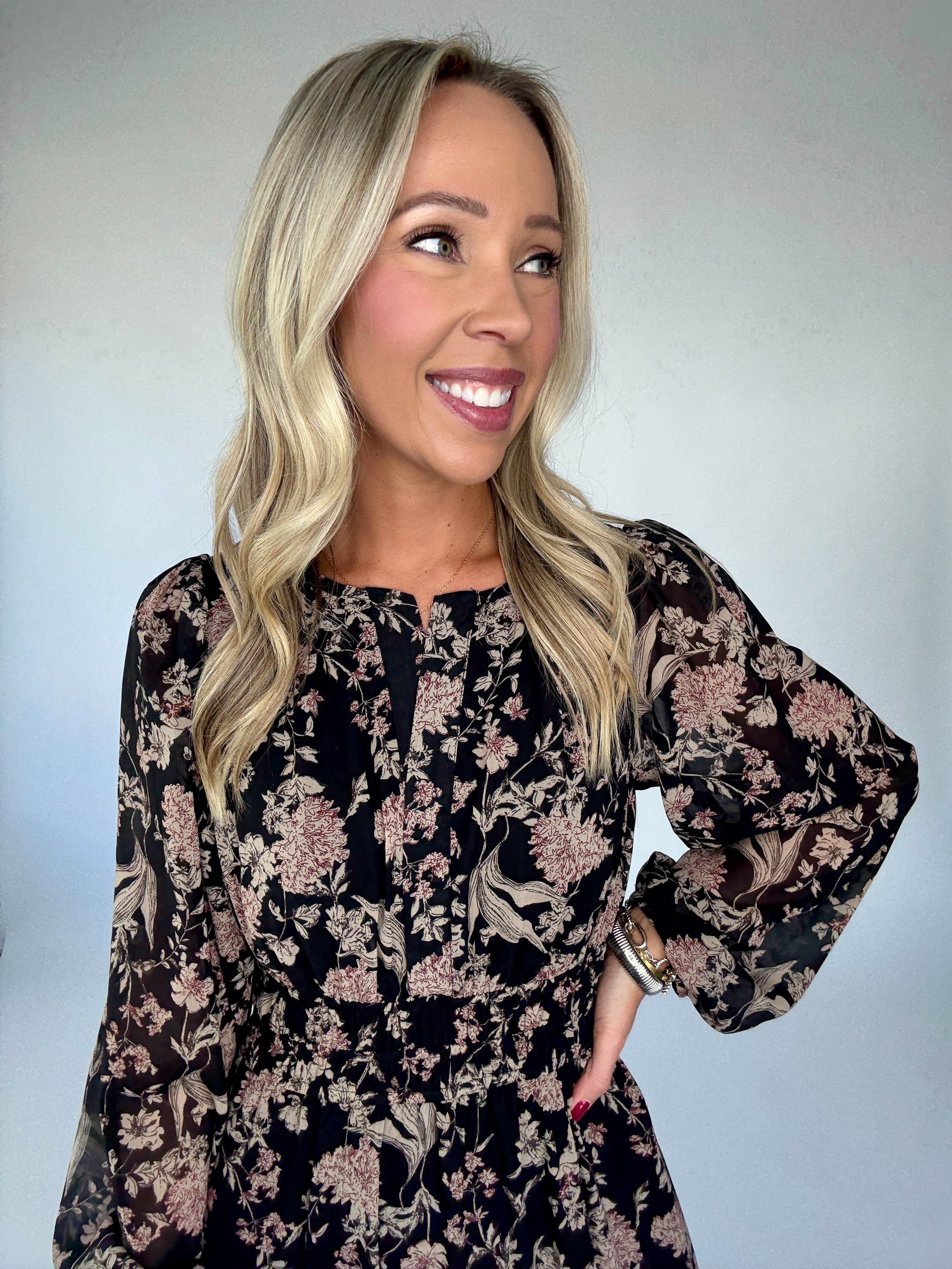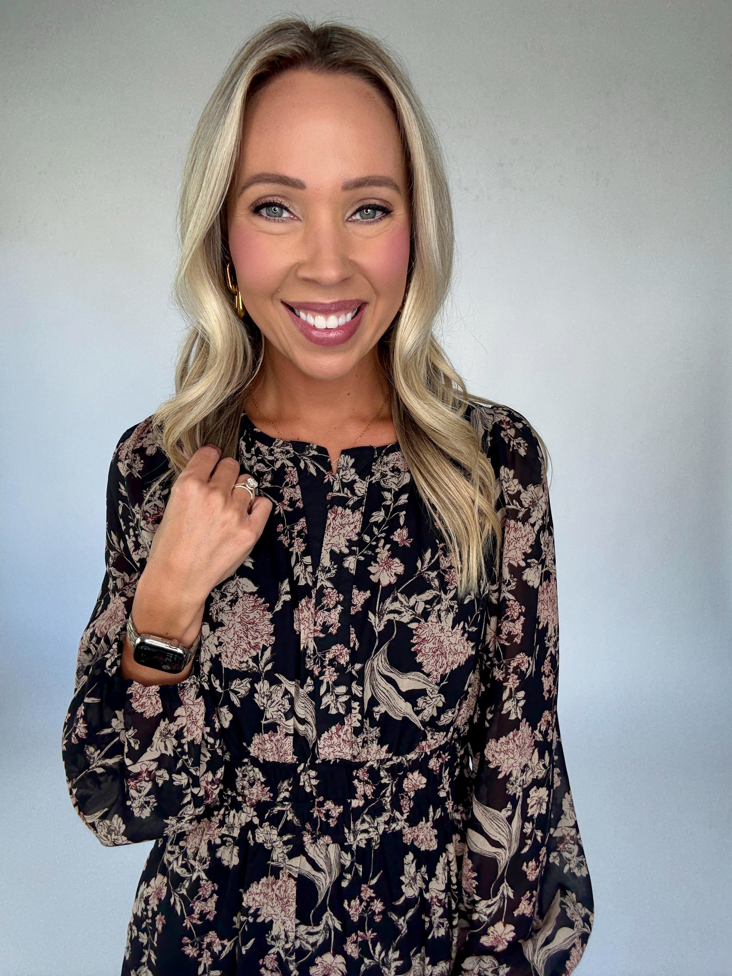 The Moonlit Bloom Maxi Dress is a timeless piece designed with effortless elegance in mind. Crafted in a flowing woven fabric, this black maxi dress features a delicate floral print that brings a touch of romance to your fall wardrobe. Thoughtful tiered detailing creates graceful movement, while side pockets add a hint of practicality. The long sleeves finish with elastic at the wrists for a comfortable fit, and the bust closes with two discreet snap buttons for ease and polish.
