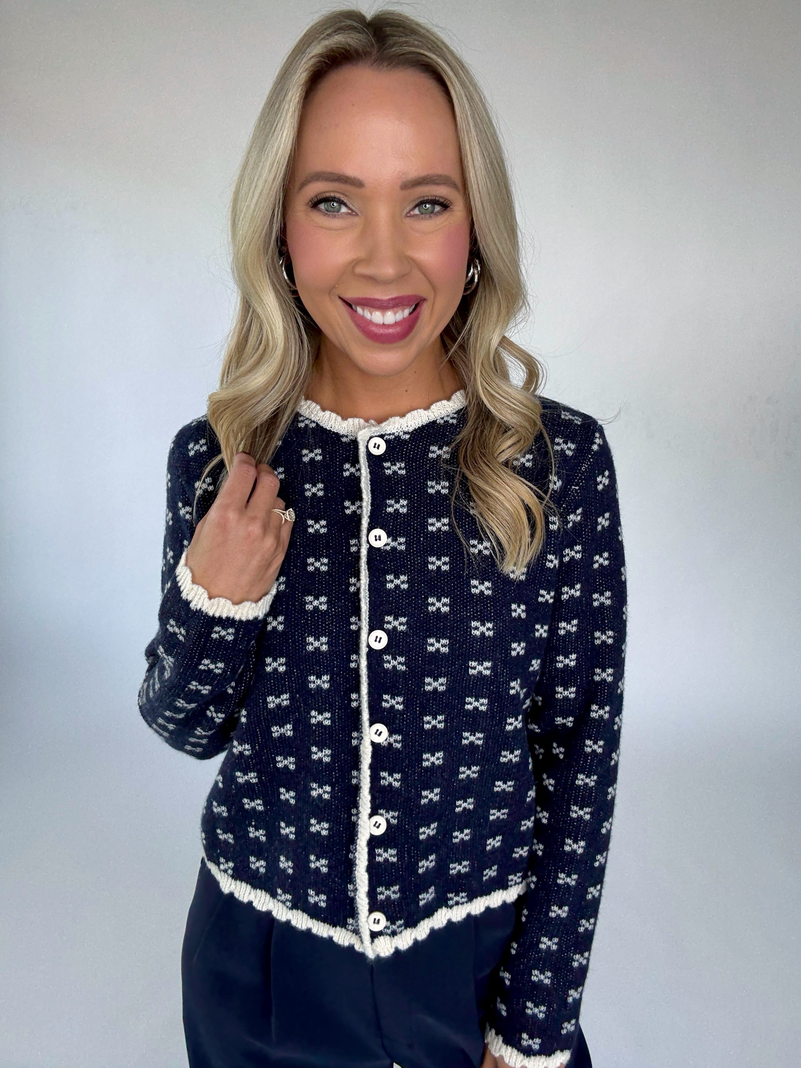 Designed at a flattering waist length, this cardigan features delicate scalloped trim along the neckline, waist, and sleeves, with a contrasting white detail framing the button front for an elegant finish. A subtle, intricate pattern is woven throughout, giving it a refined texture that feels elevated yet versatile. Crafted from a soft, comfortable fabric, The Harlow pairs beautifully with denim, trousers, or skirts—making it a go-to piece for both everyday occasions and polished evenings.