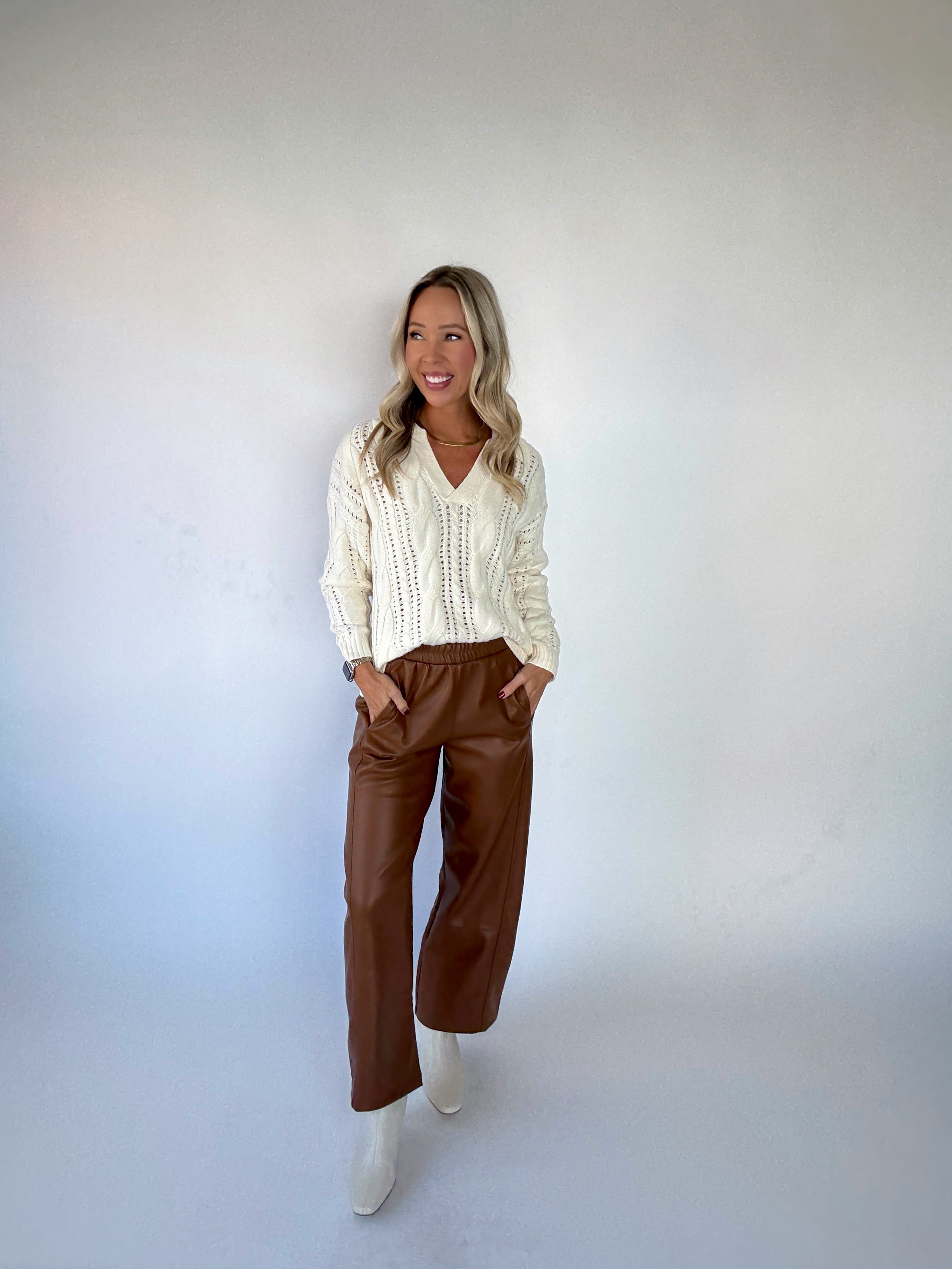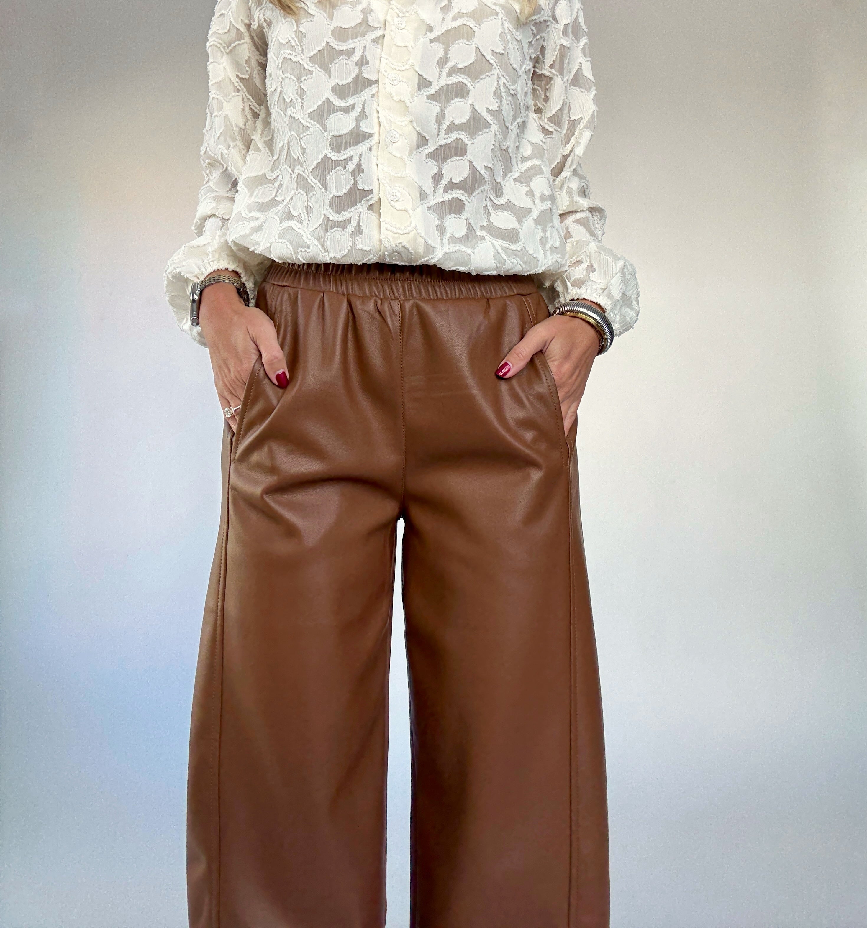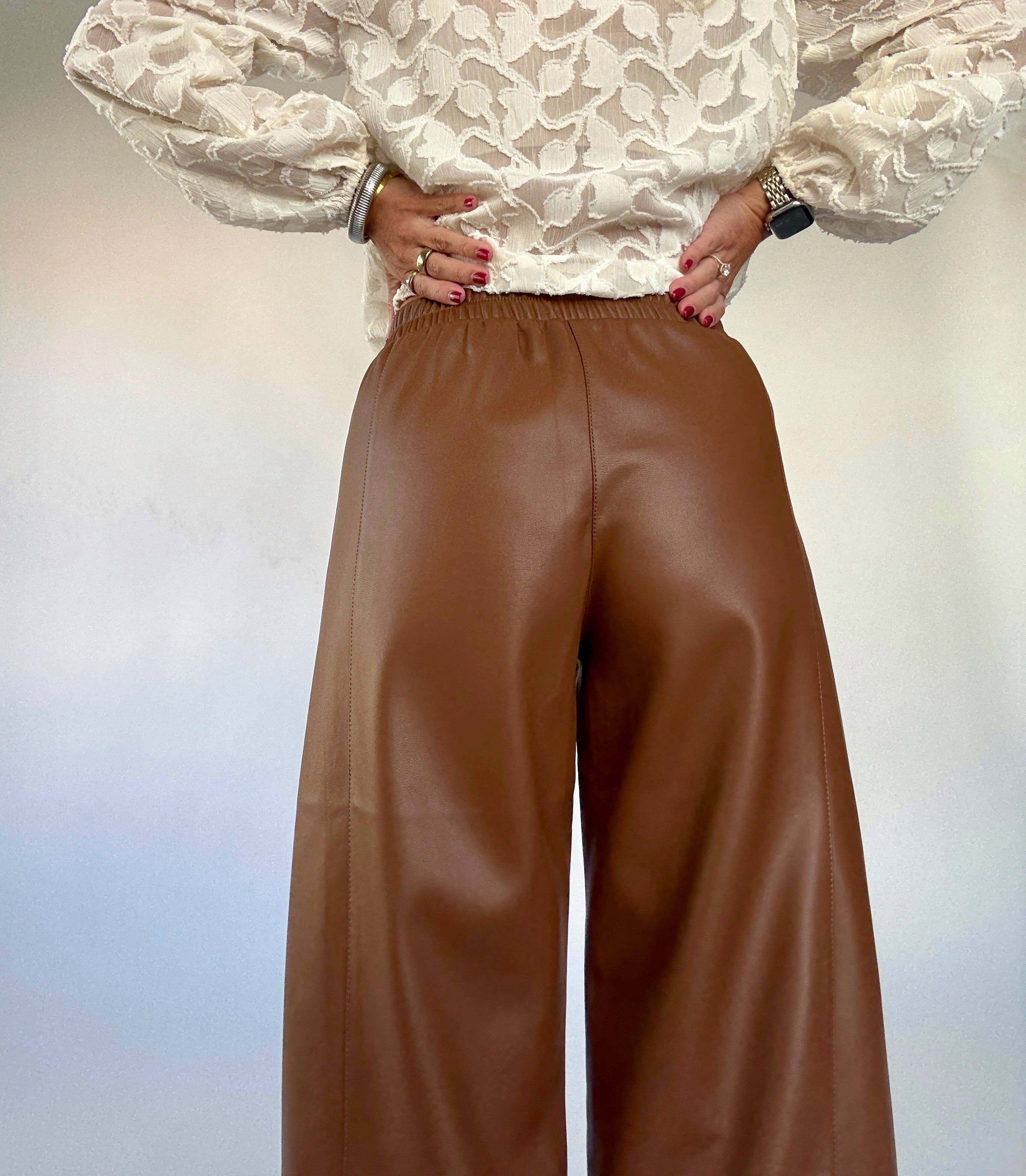 The Lennox Vegan Leather Pant delivers modern sophistication with effortless comfort. Designed with a wide ankle silhouette and crafted from supple vegan leather, these pants feature thoughtfully placed seaming along the front, back, and mid-calf for a tailored, elevated look. The elastic waist and soft interior lining ensure all-day ease, while functional side pockets add practicality without sacrificing style. Free of back pockets for a clean, streamlined finish, this pant transitions seamlessly from the office to evenings out.