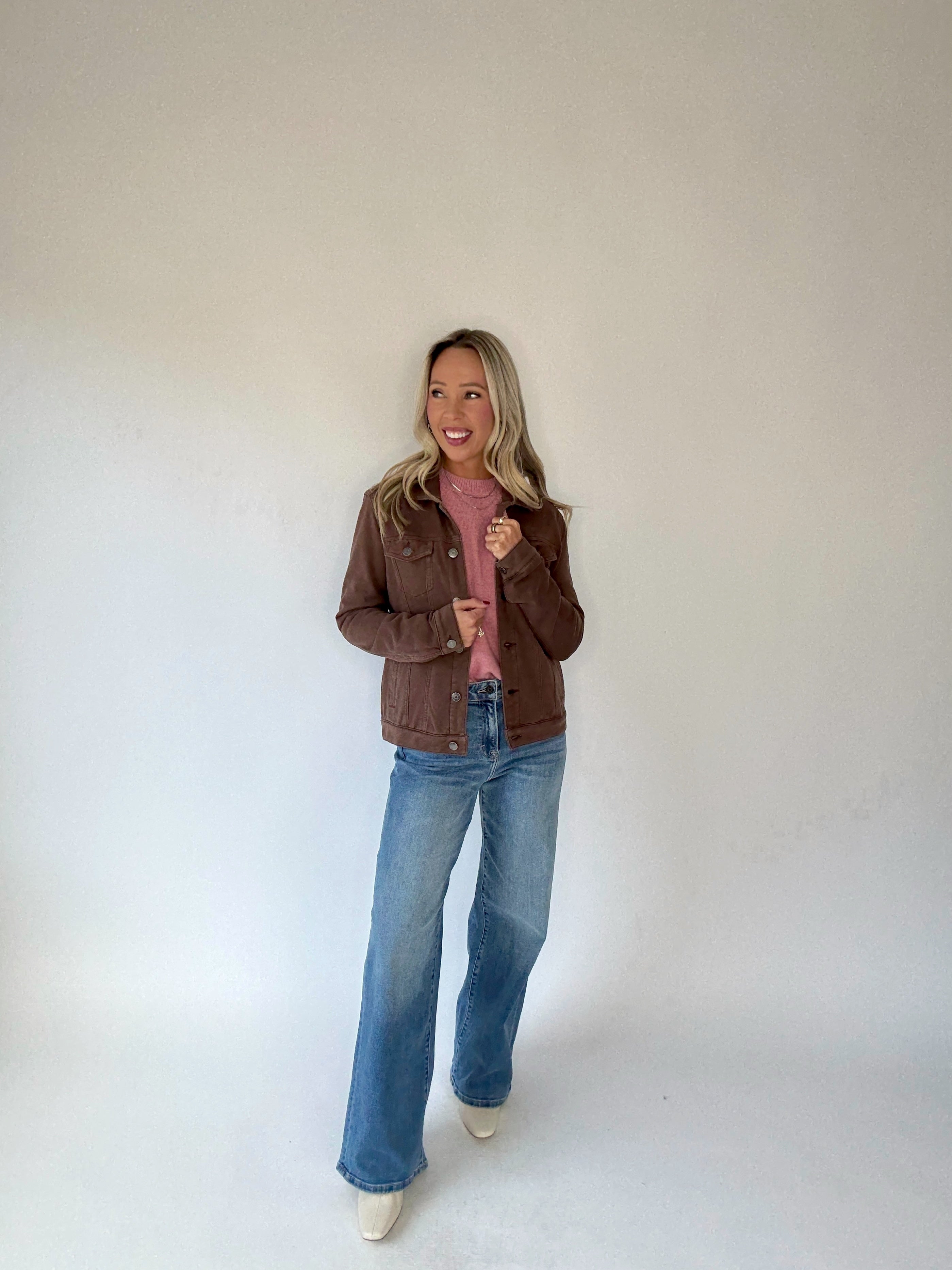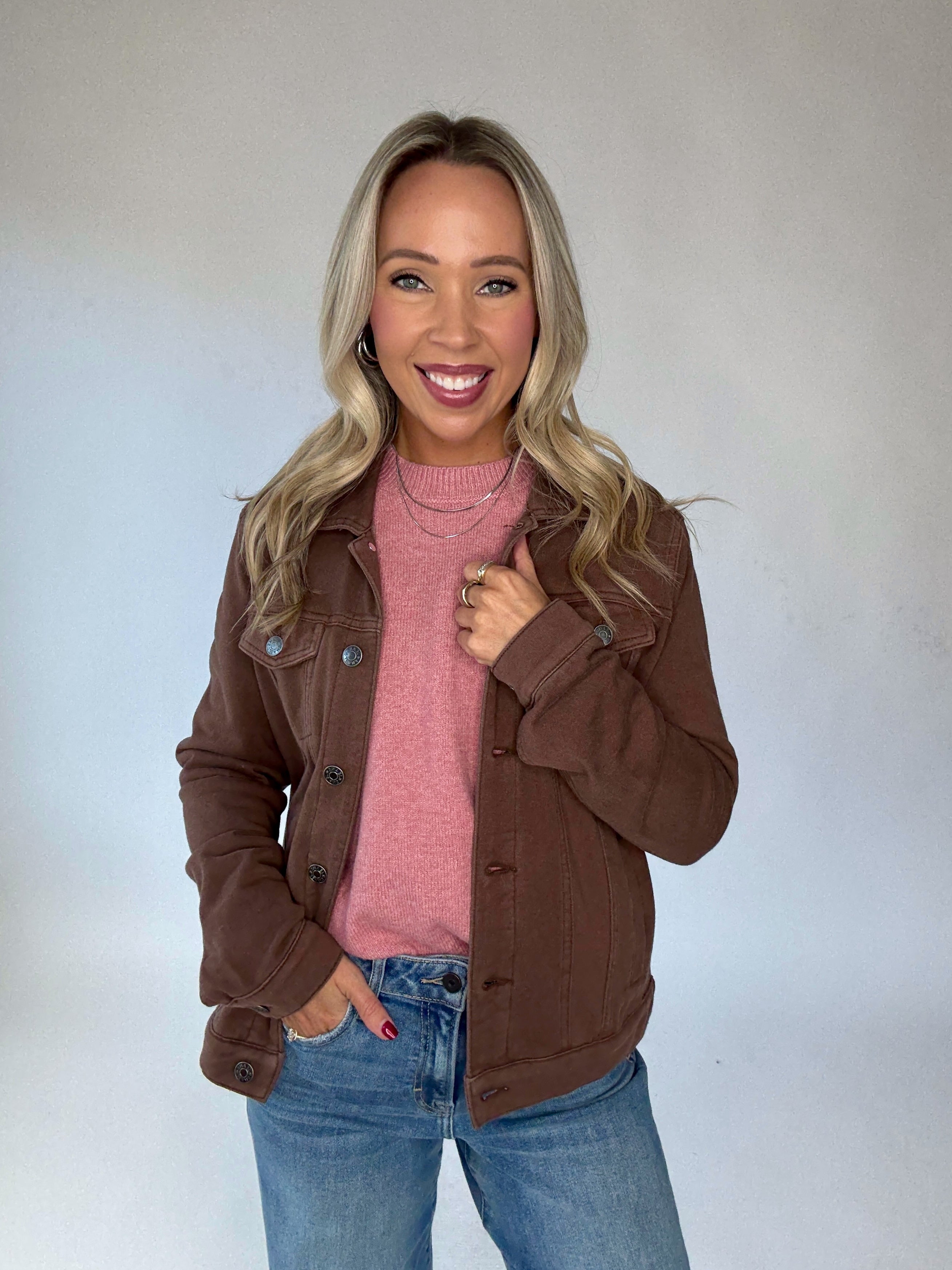 The Soft Terrain Jacket brings a refined twist to a timeless silhouette. Crafted from a luxuriously soft washed fabric, it mirrors the structure of a classic denim jacket but with the comfort of your favorite lounge wear. Designed with button-front styling, chest pockets, and subtle trim detailing along the front and waist, it blends casual ease with elevated appeal. Perfect for layering over a simple tee or tank, it transitions effortlessly from day to night—pair with denim for a laid-back look or trousers for a more polished edge.