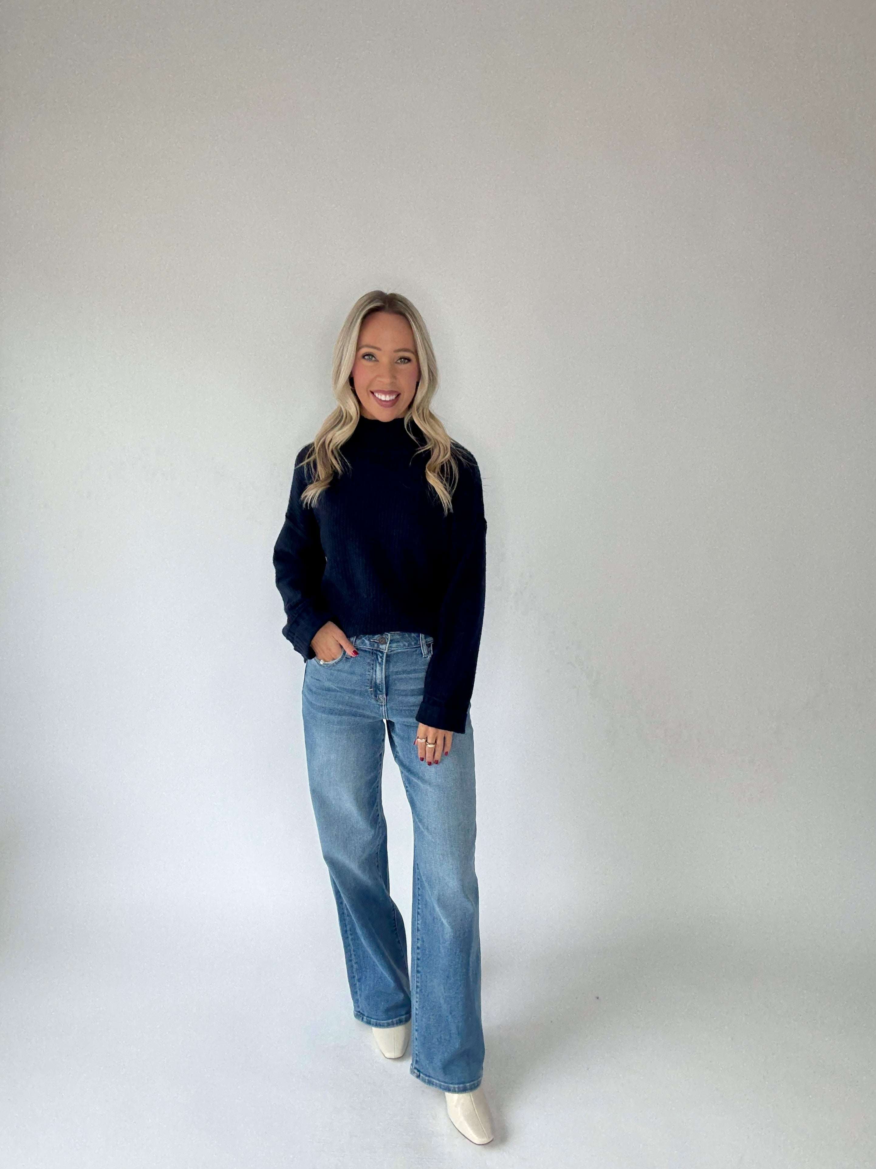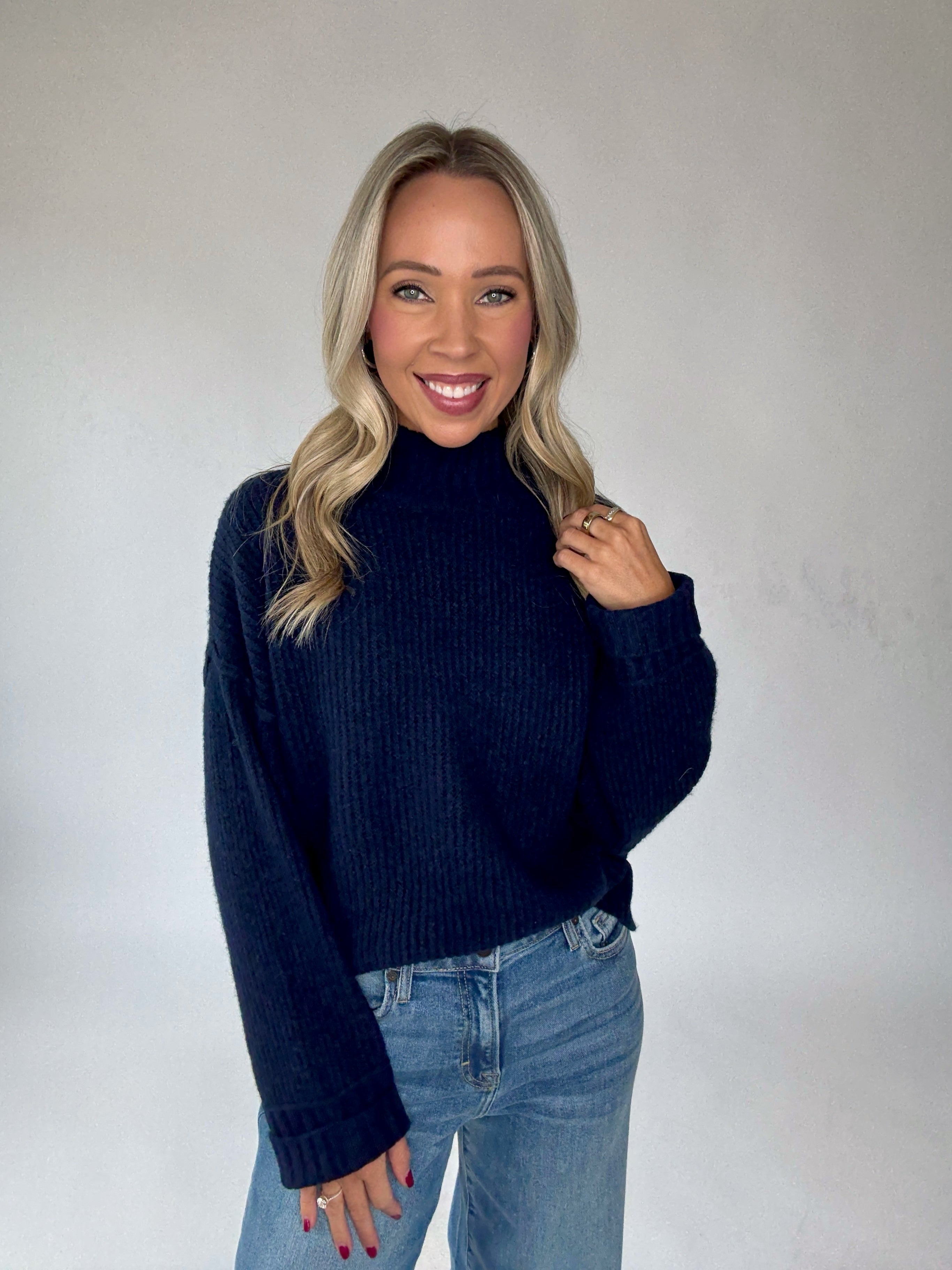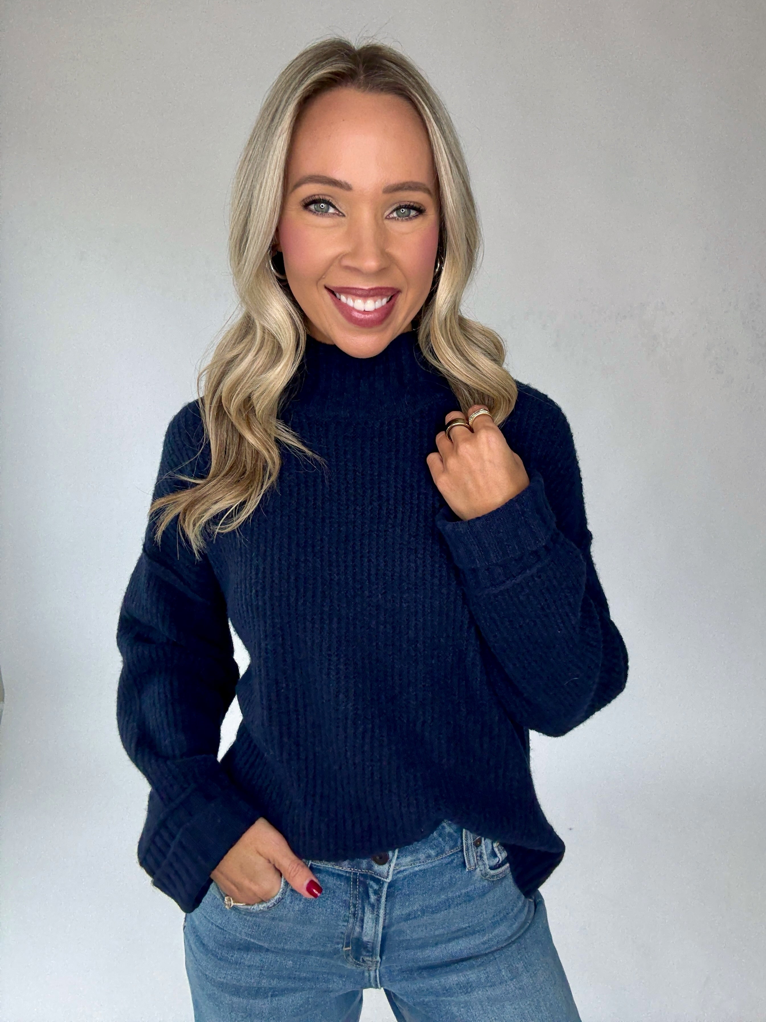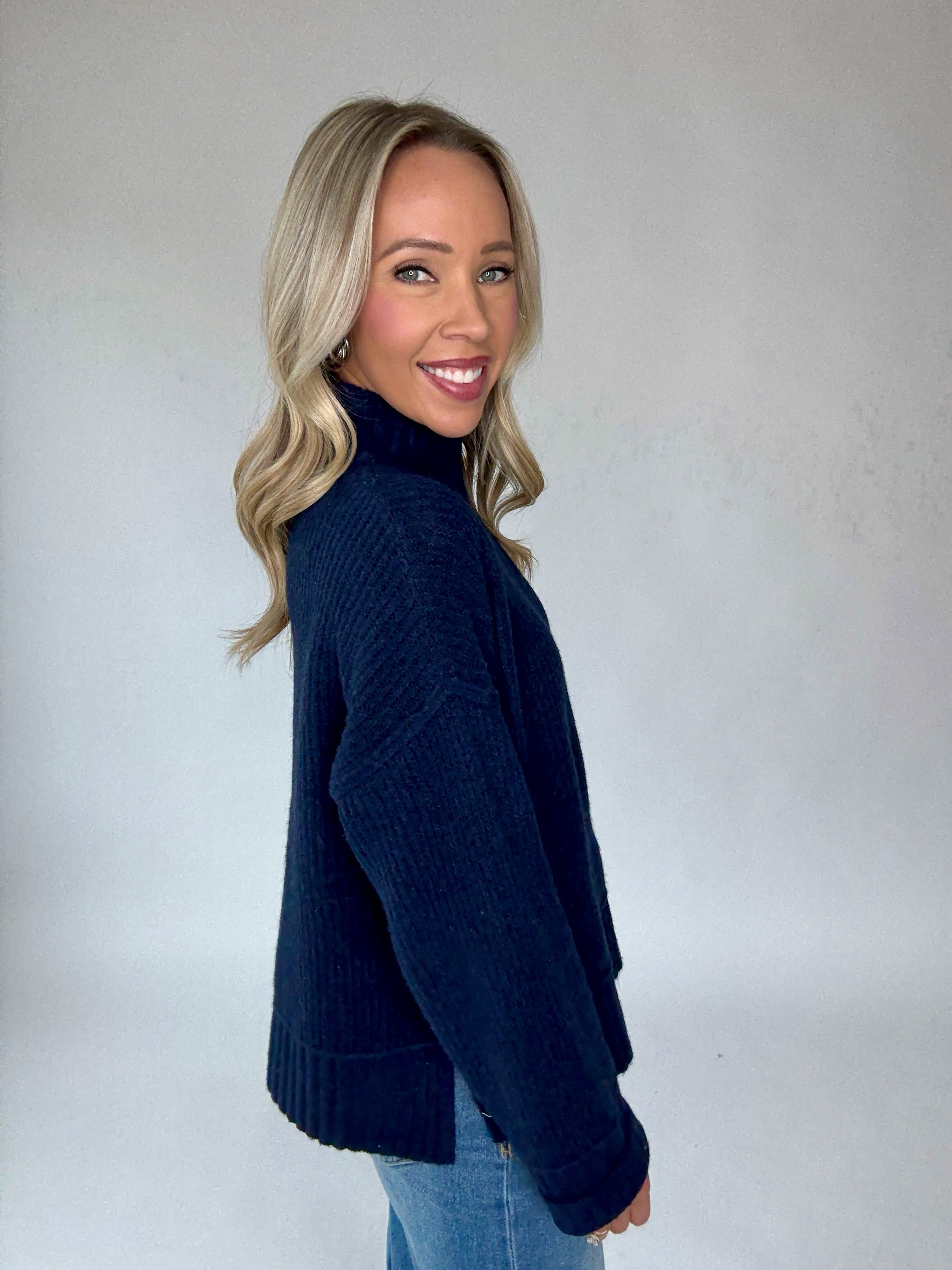 Timeless style meets effortless comfort in the Indigo Harbor Mock Neck Sweater. Crafted in a rich deep navy hue, this knit pullover features a refined mock neckline with thicker ribbing at the collar, cuffs, and hem for a polished finish. Subtle vertical ribbing throughout adds texture and depth, while side split hems create a flattering, easy-to-wear silhouette. Designed in a luxuriously soft and stretchy fabric, this sweater offers the perfect balance of coziness and sophistication.