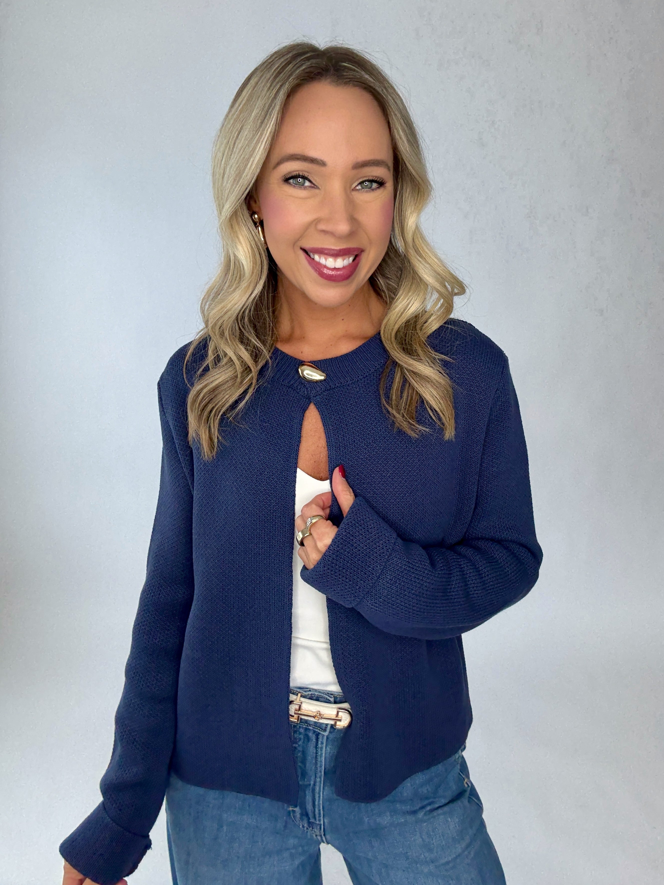 The Ellis Cardigan is a study in understated elegance. Designed with an open front and a single teardrop-shaped gold button at the neckline, it offers a refined point of closure that feels intentional and timeless. Subtle ribbing at the neckline adds texture and polish, while the clean sleeves and waist remain smooth for a more elevated, luxurious finish.