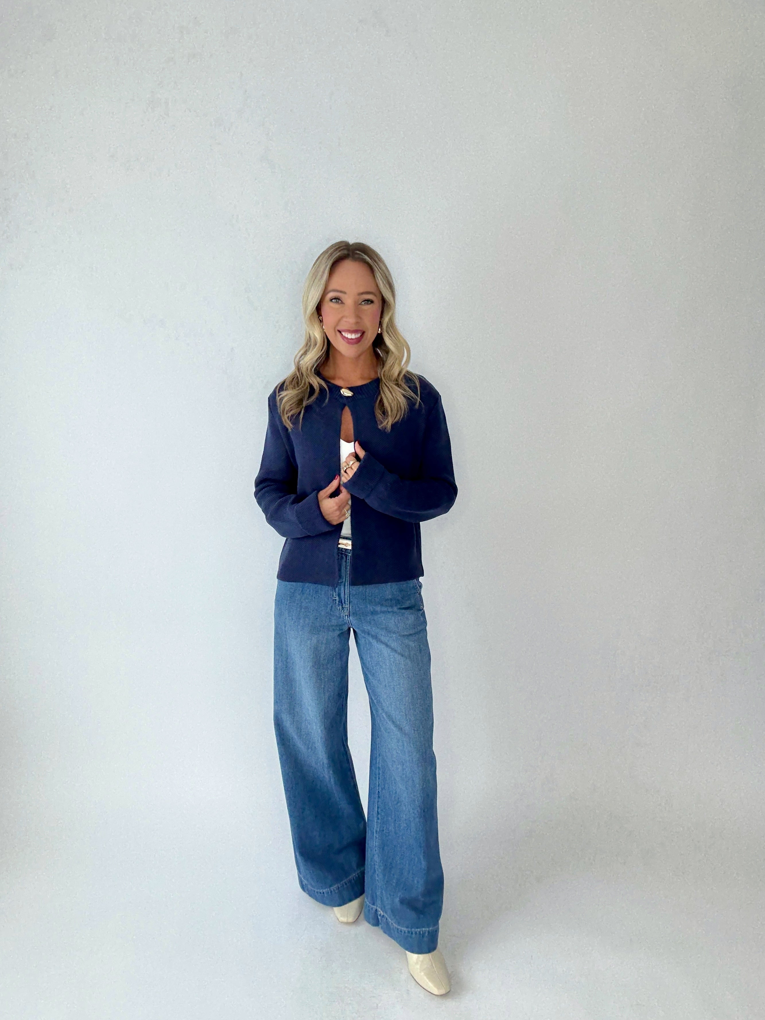 Crafted from a soft yet structured fabric, The Ellis Cardigan holds its shape beautifully, creating a flattering silhouette without sacrificing comfort. Effortlessly versatile, it layers perfectly over a simple tank and pairs seamlessly with denim for everyday ease or tailored trousers for a more polished look. Dress it up or down—this is a classic essential made to move effortlessly through your wardrobe.