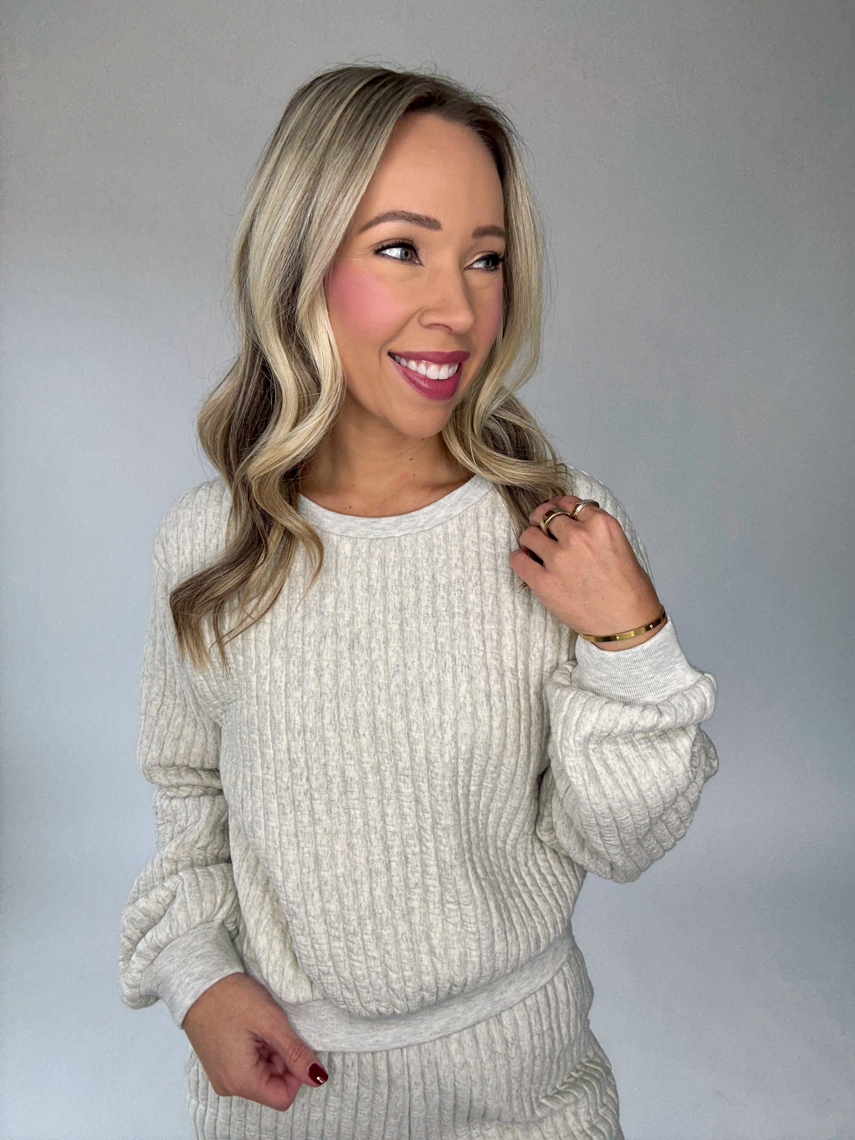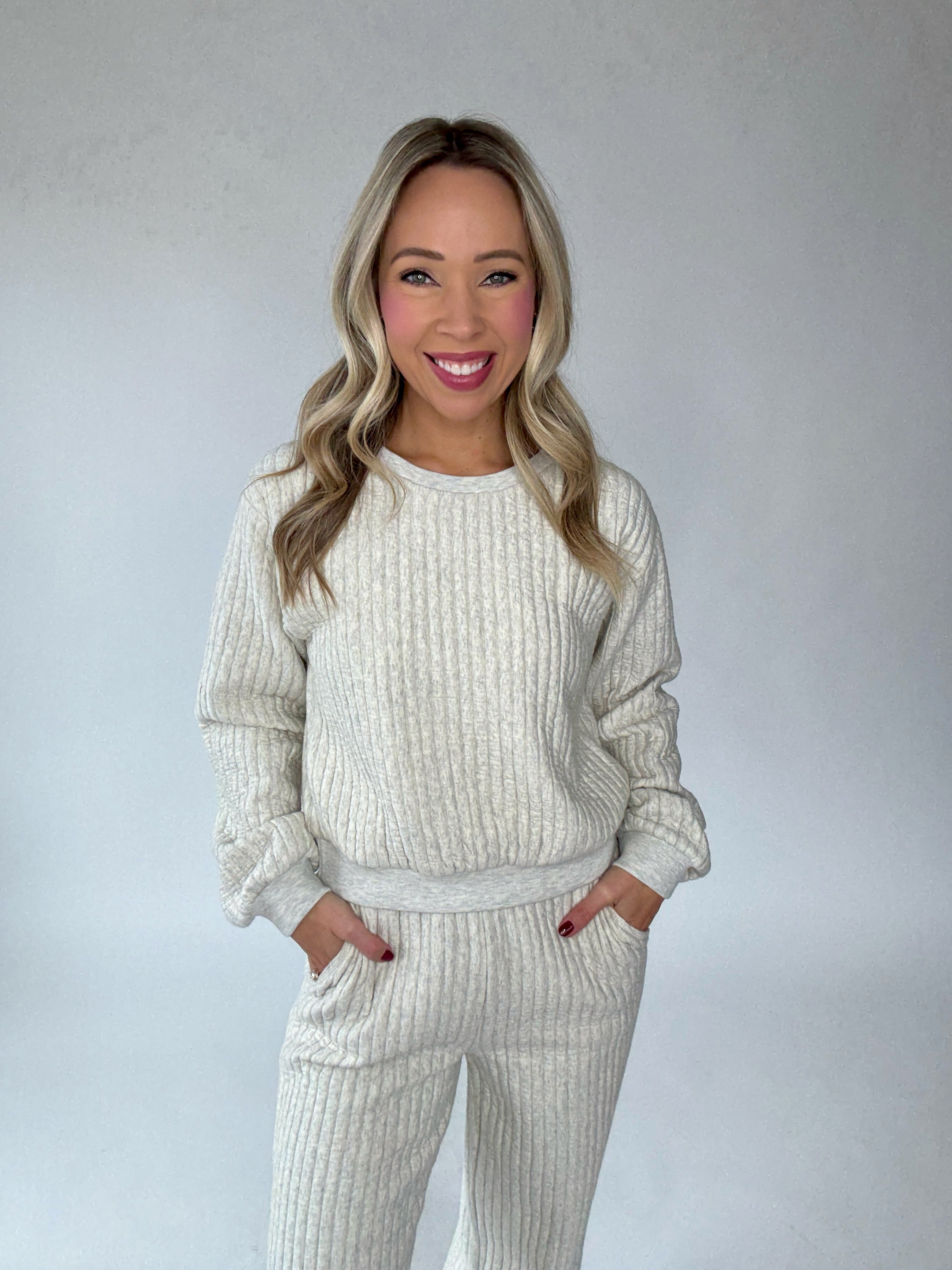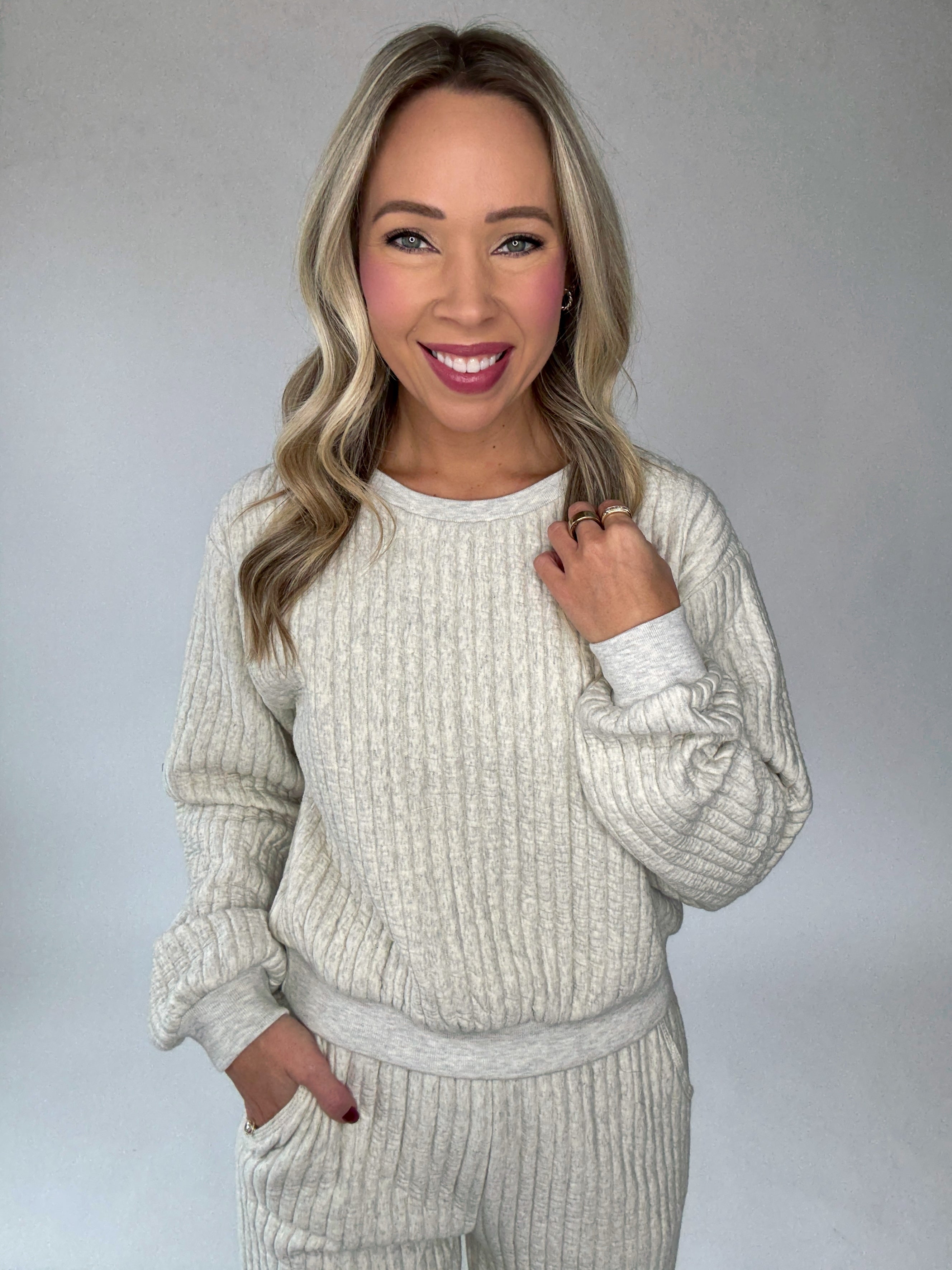 The Tranquil Moments Top is the definition of cozy sophistication. Crafted from an ultra-soft, cloud-like ribbed fabric, this crewneck sweatshirt brings comfort and elegance together effortlessly. Designed with vertical ribbing throughout and soft ribbed trim at the neckline, wrists, and waist, it offers a refined, relaxed fit that feels as luxurious as it looks.