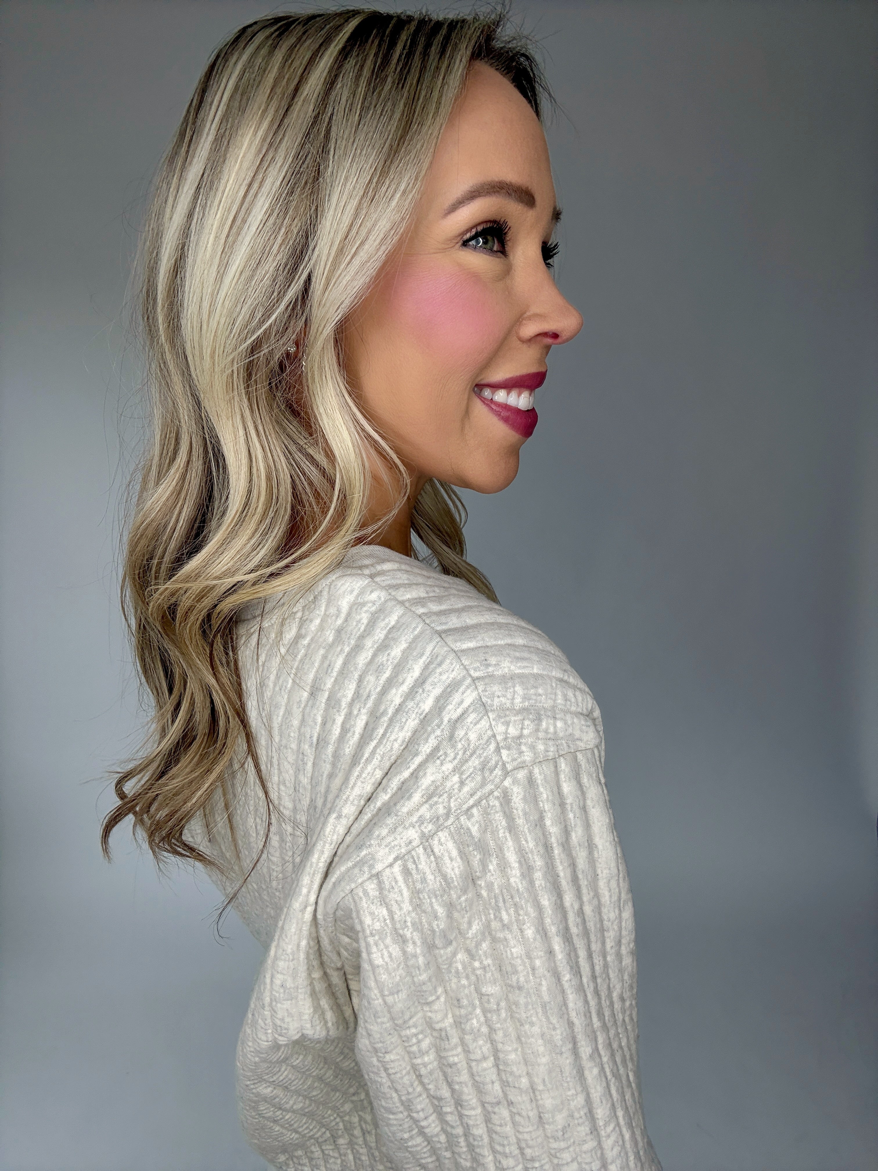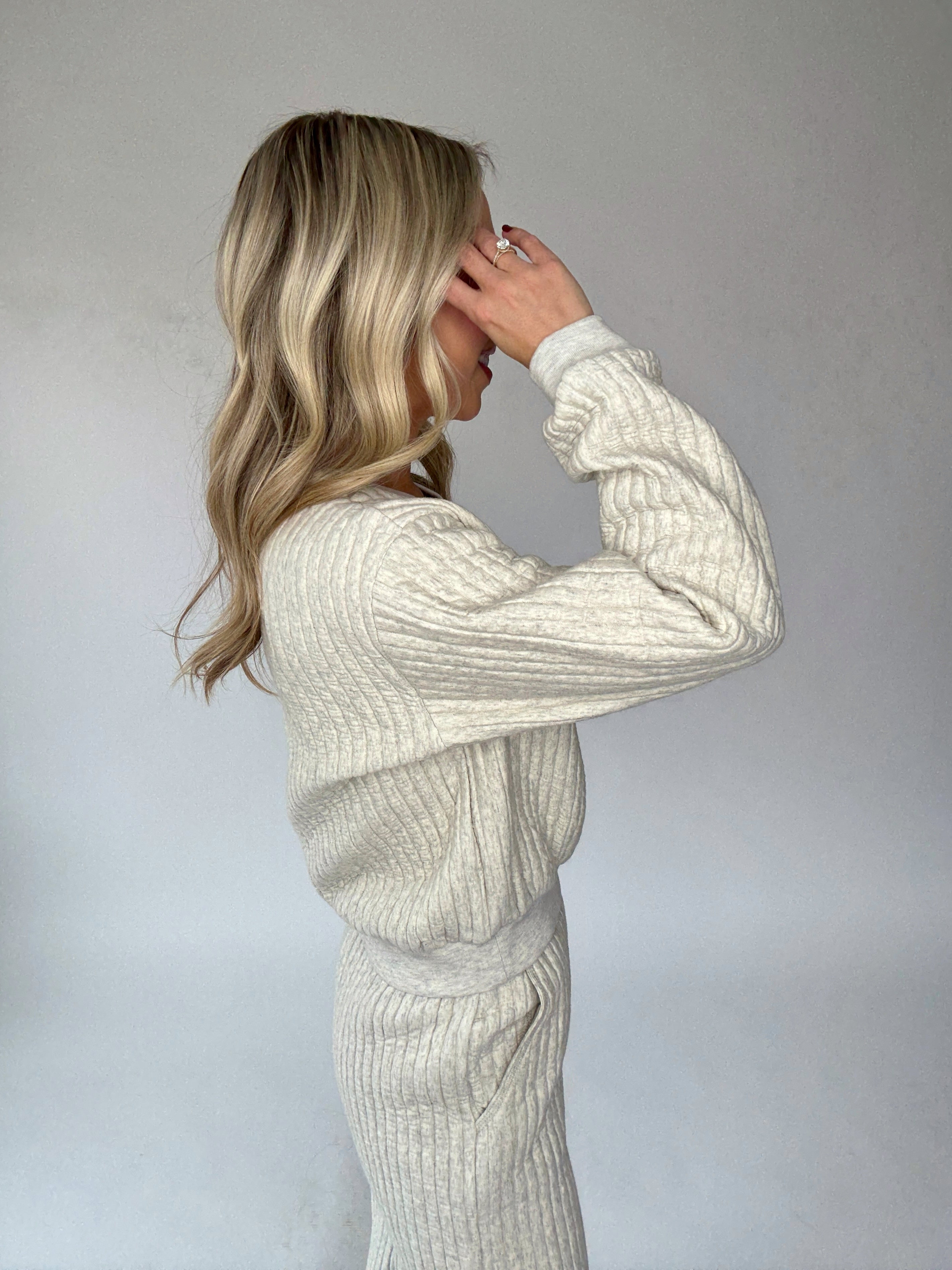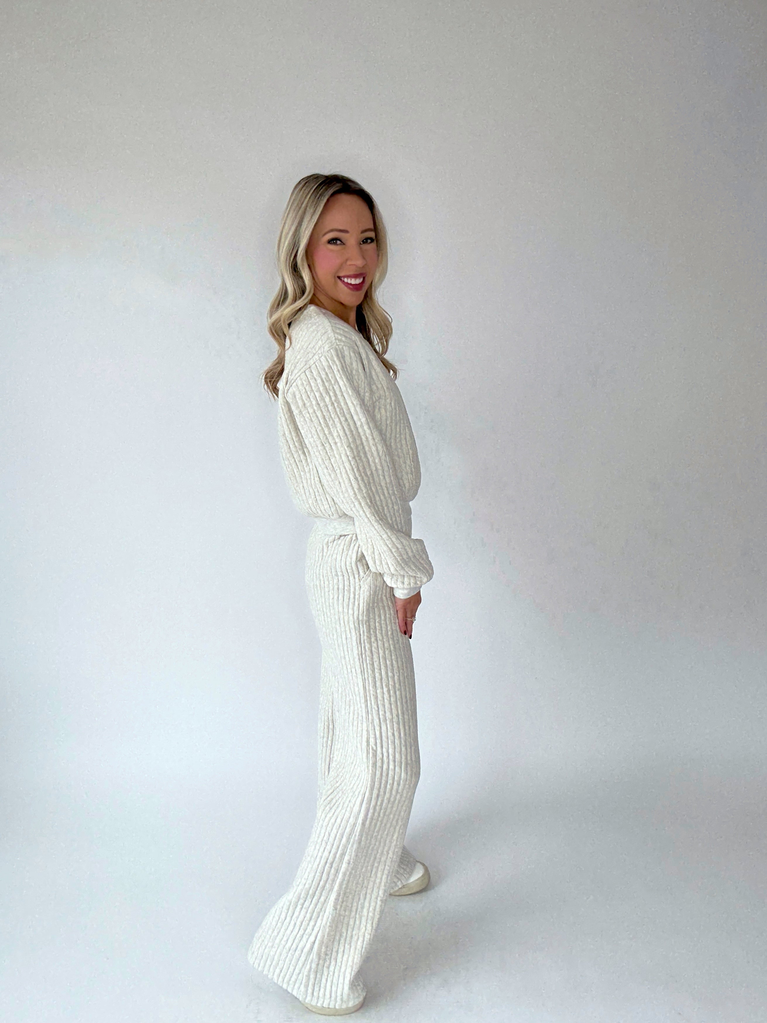 The Tranquil Moments Top is the definition of cozy sophistication. Crafted from an ultra-soft, cloud-like ribbed fabric, this crewneck sweatshirt brings comfort and elegance together effortlessly. Designed with vertical ribbing throughout and soft ribbed trim at the neckline, wrists, and waist, it offers a refined, relaxed fit that feels as luxurious as it looks.