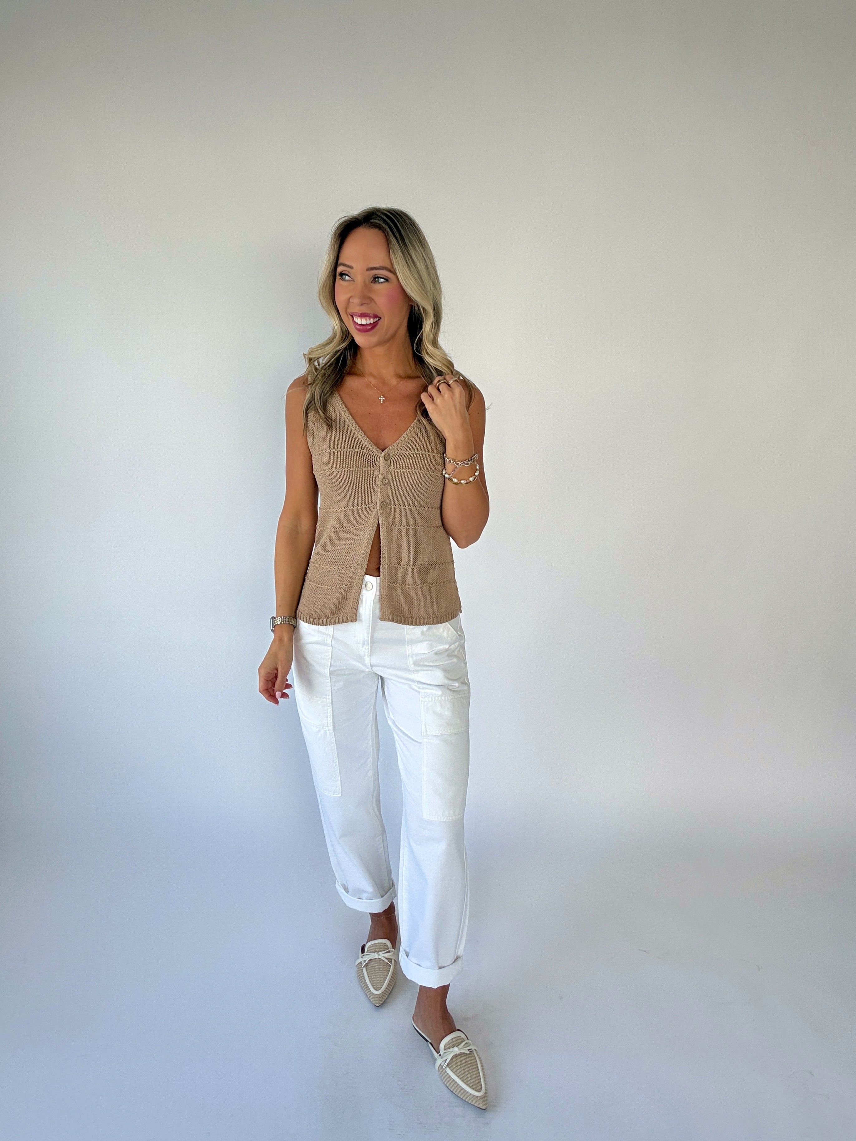 Perfectly paired with our Sanctuary Boyfriend Utility Pant, the Call Me Later Knit Tank brings effortless polish to warm-weather outfits. Feminine, chic, and endlessly wearable, it’s a standout piece designed to elevate both casual and refined looks alike.
