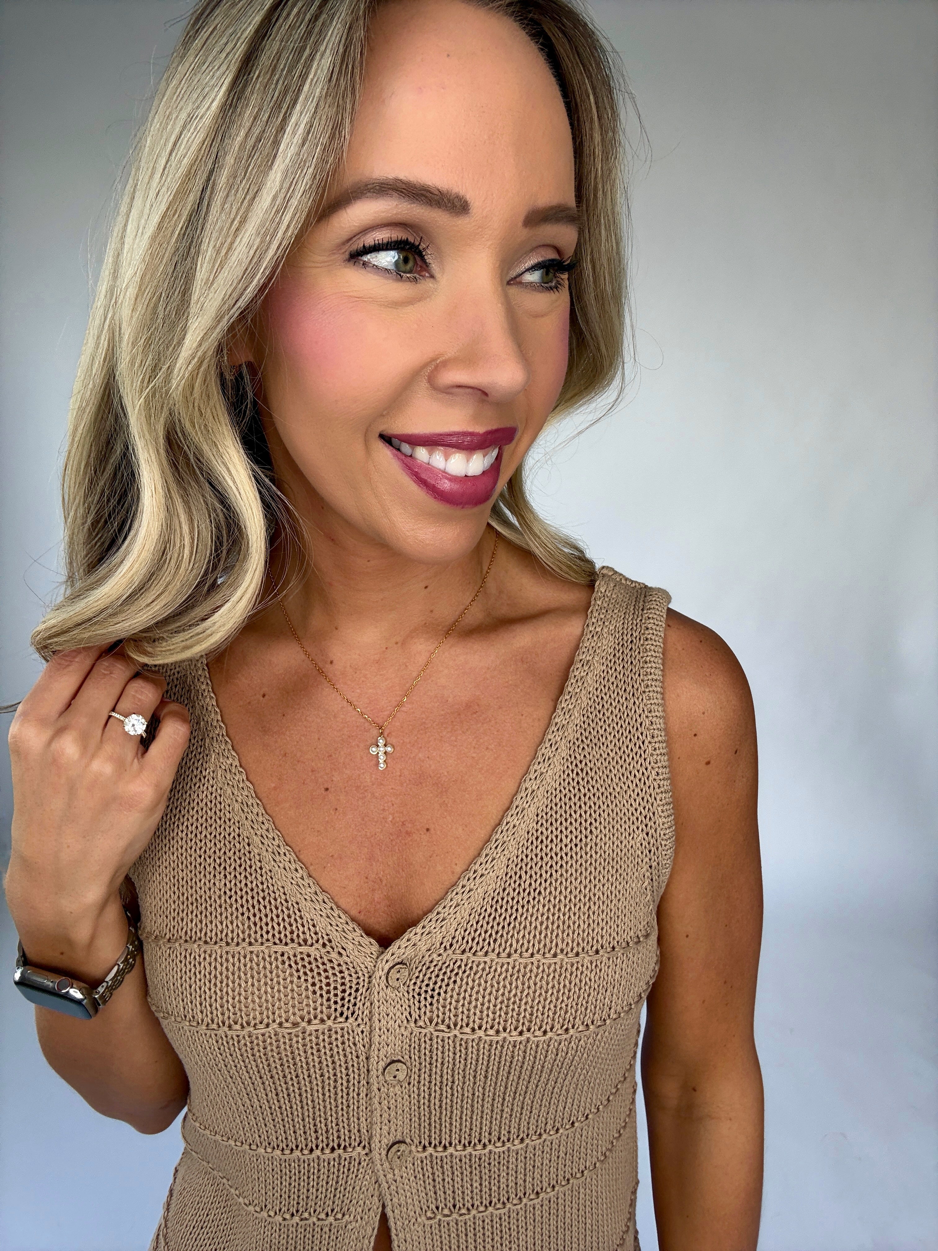 The Call Me Later Knit Tank is a beautifully feminine piece that blends effortless charm with modern sophistication. Crafted in a rich khaki hue, this crochet knit vest features intricate open-knit detailing throughout, creating texture and visual interest while maintaining a light, breathable feel.