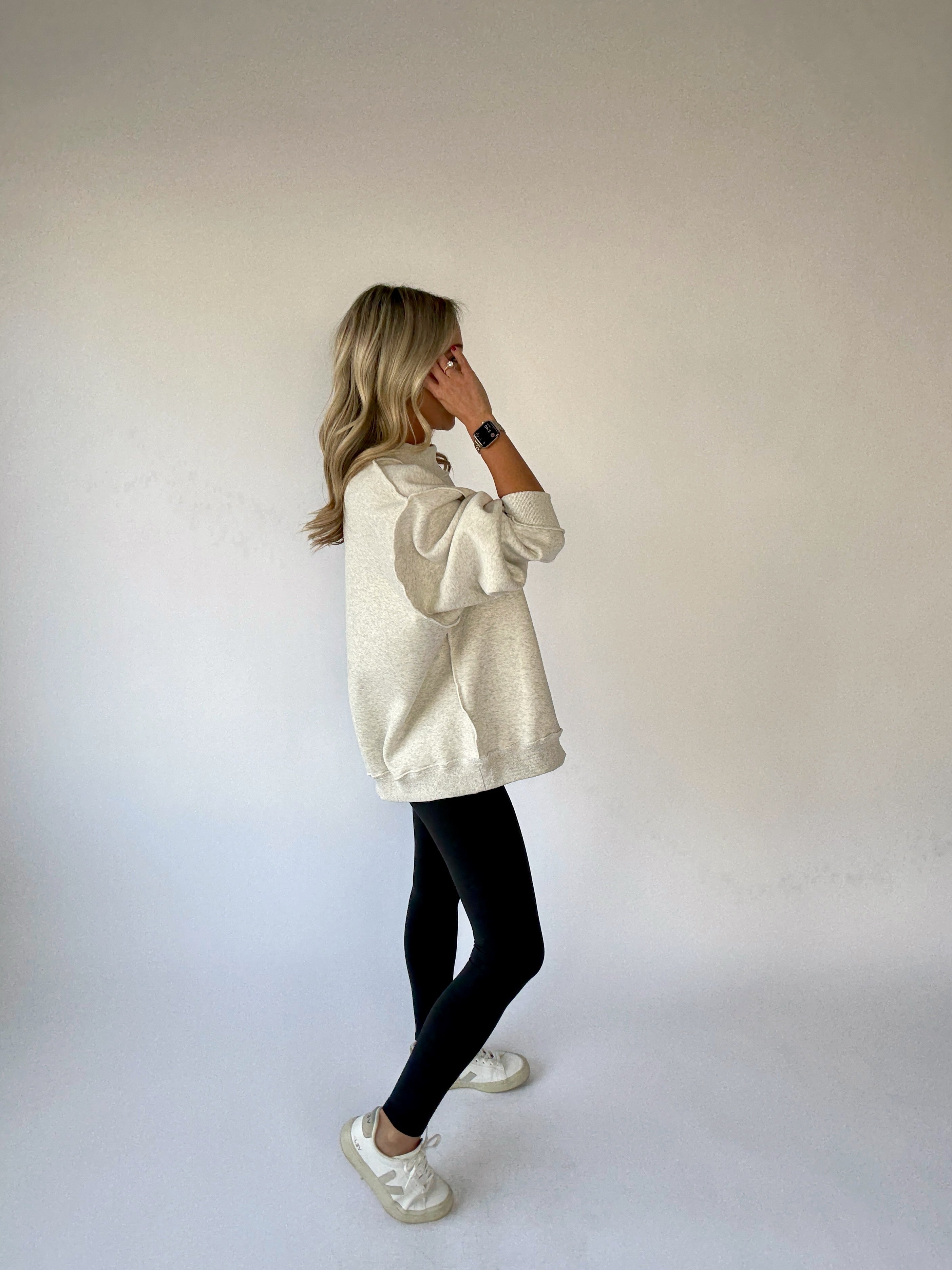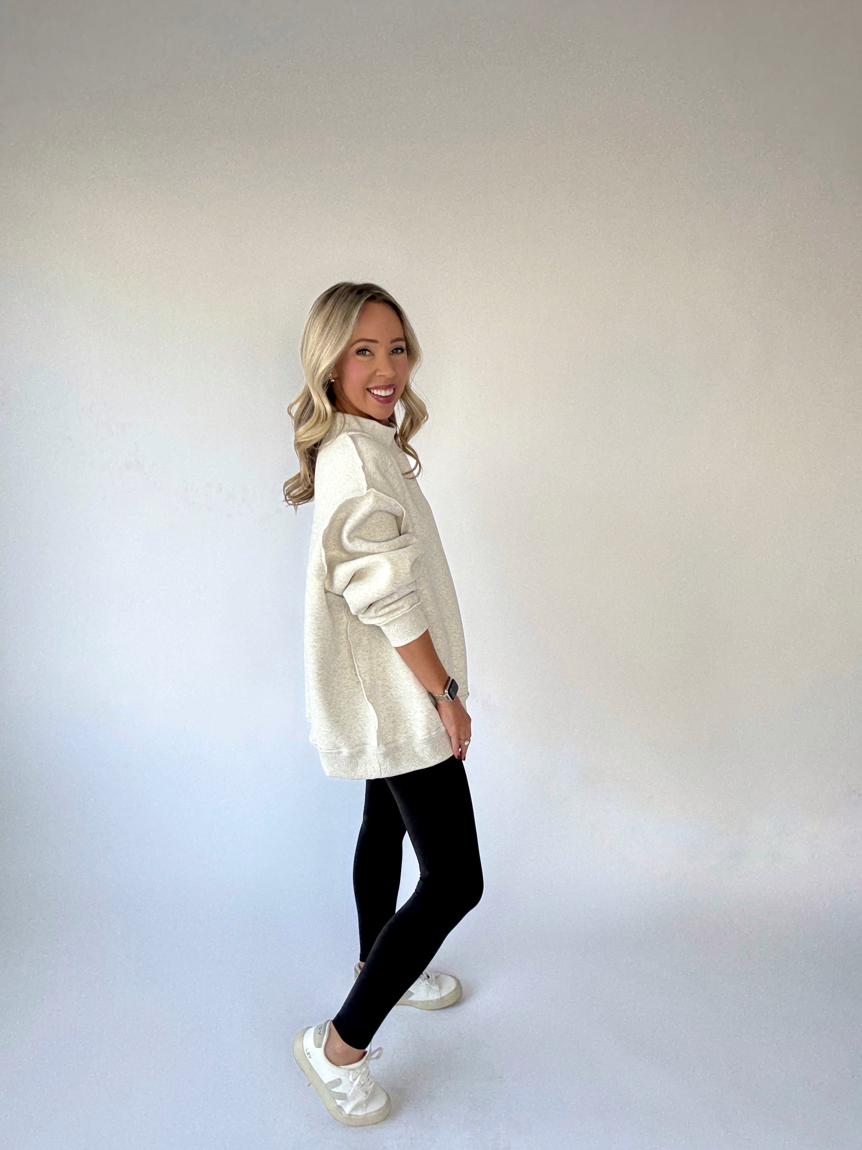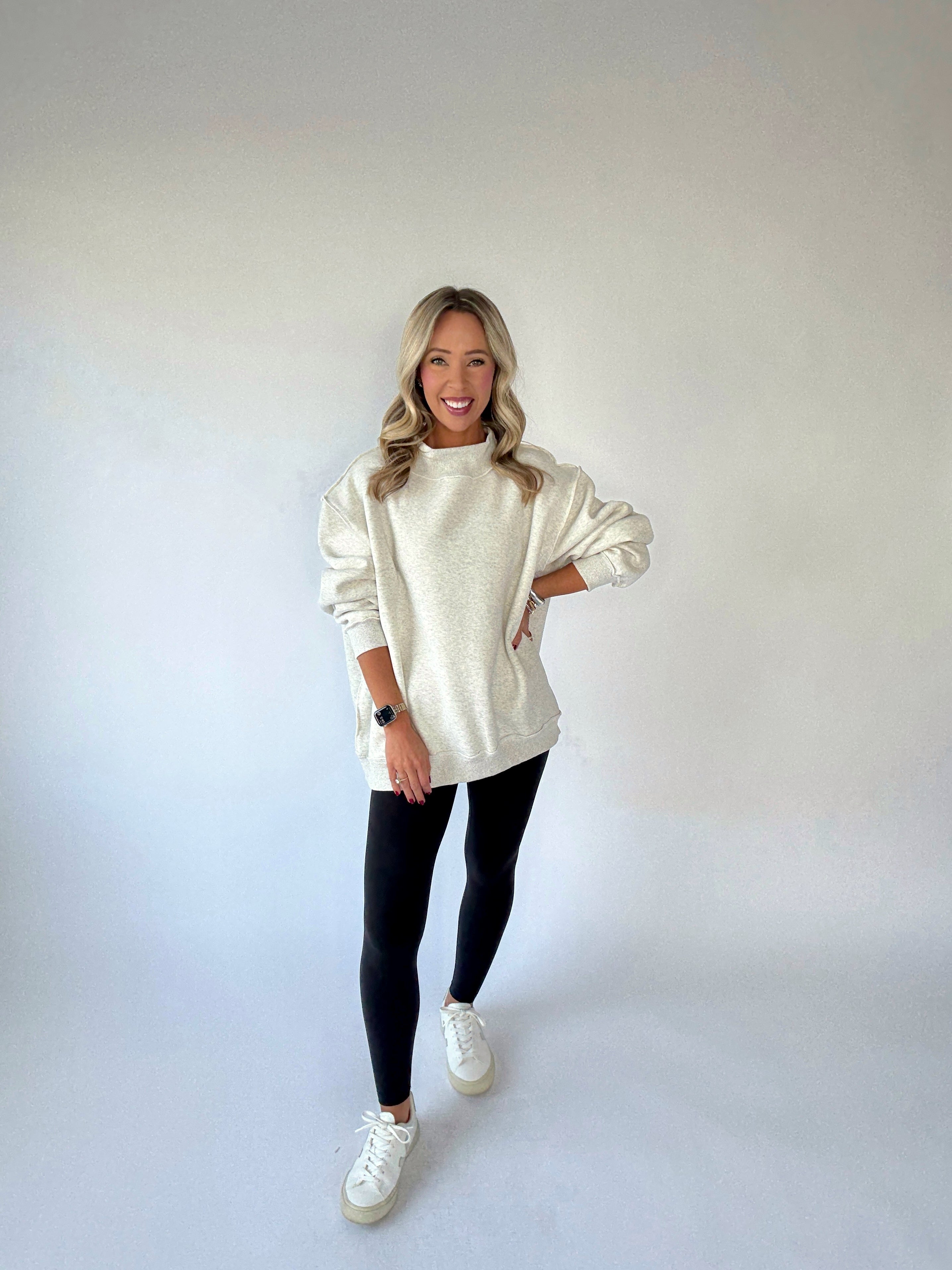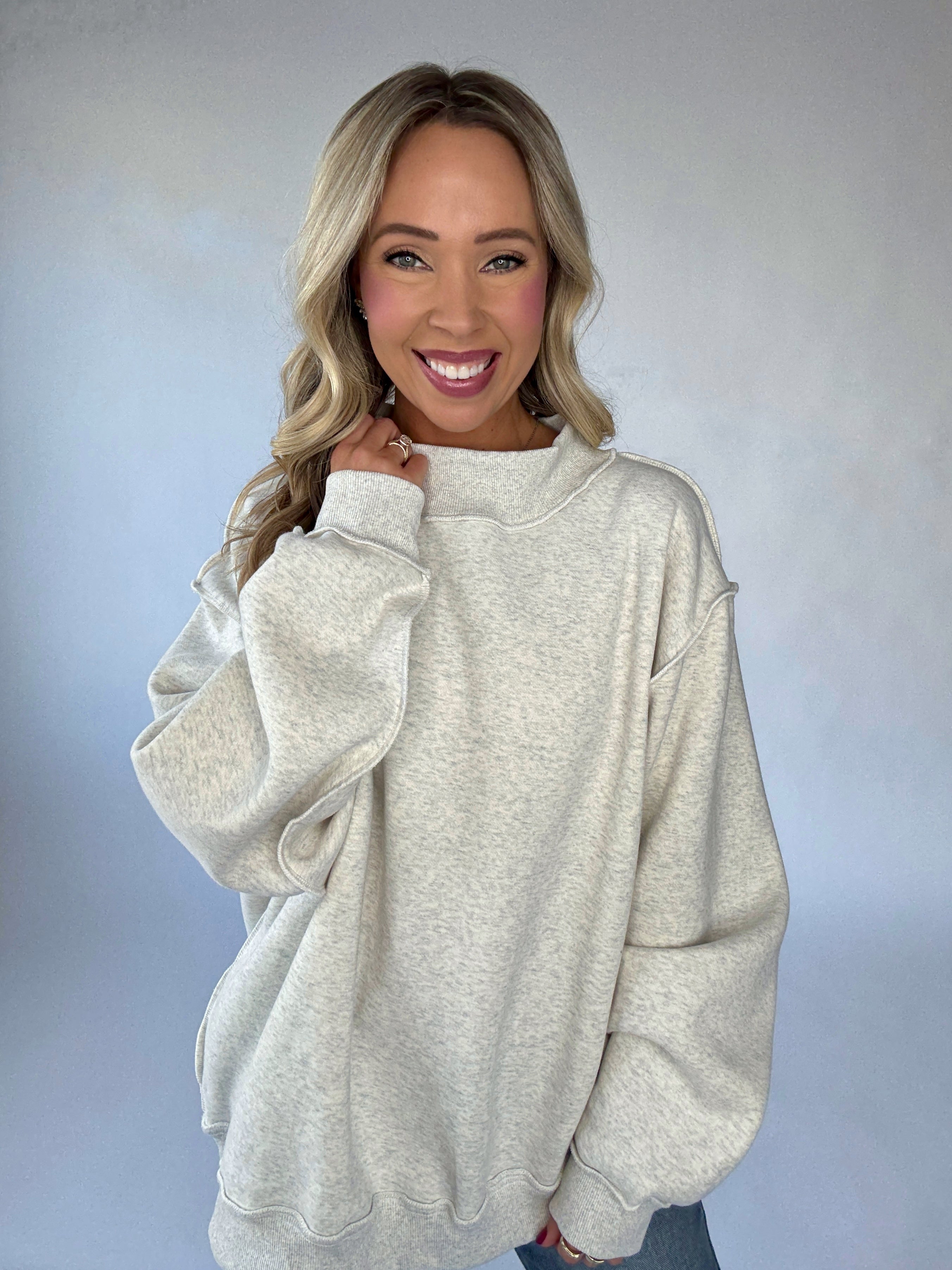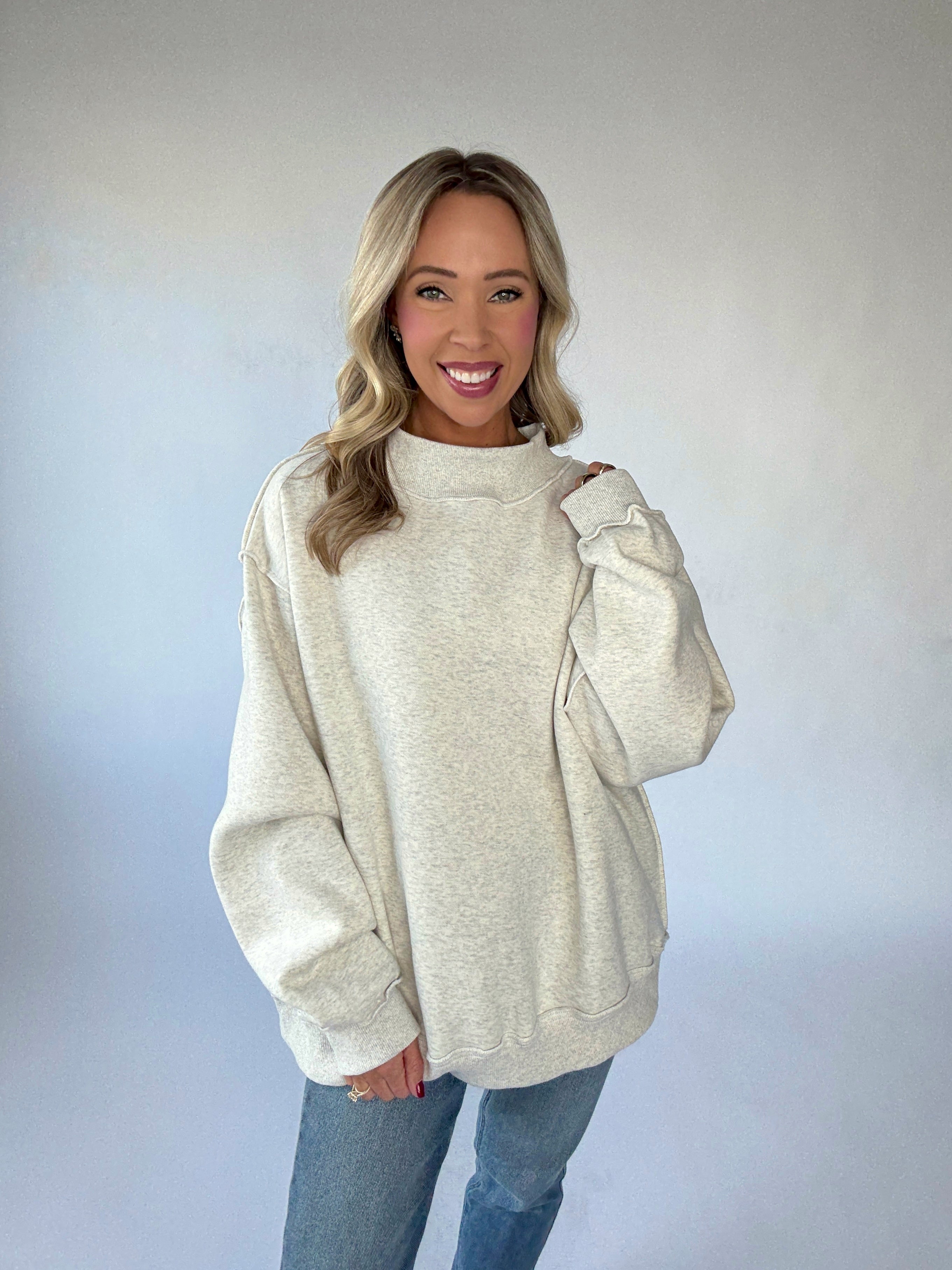 Designed for effortless comfort with a refined touch, The Cozy Hour Sweatshirt elevates everyday lounging with timeless appeal. Crafted from an ultra-soft, cozy fabric, this oversized sweatshirt features a chic mock neckline and thoughtfully placed exposed seams along the shoulders and sides for subtle, modern detail.