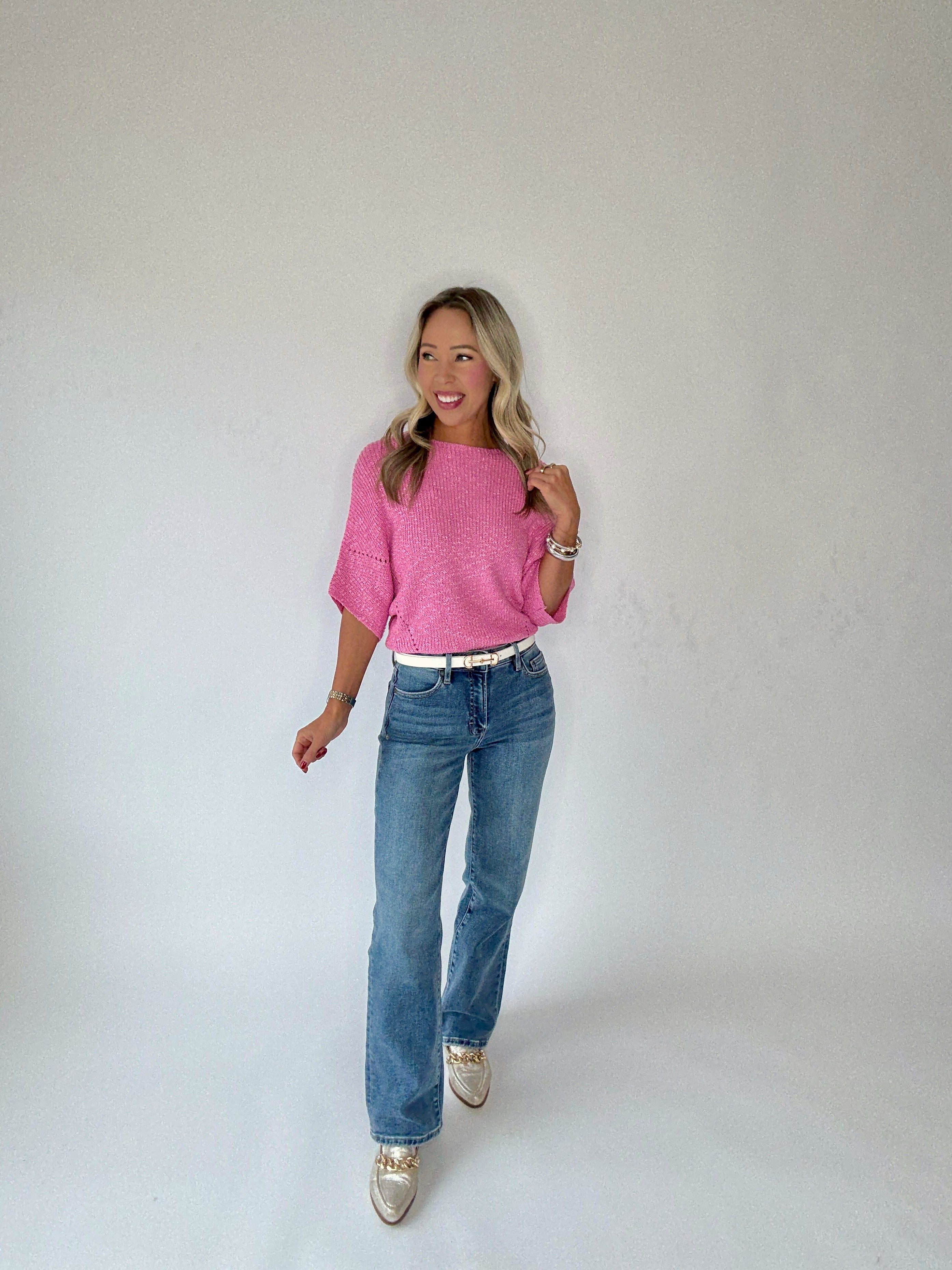 Now available in a sweet pink hue, this top brings a touch of understated glamour to your winter & spring wardrobe. The sweet pink tone is perfect for family gatherings, dinner dates, or everyday wear with a polished twist. Pair it with high-waisted denim for a chic casual look, or dress it up with trousers or a skirt for an elevated ensemble. The Flirty & Fun Knit Top in sweet pink offers timeless sophistication with a modern, feminine edge.